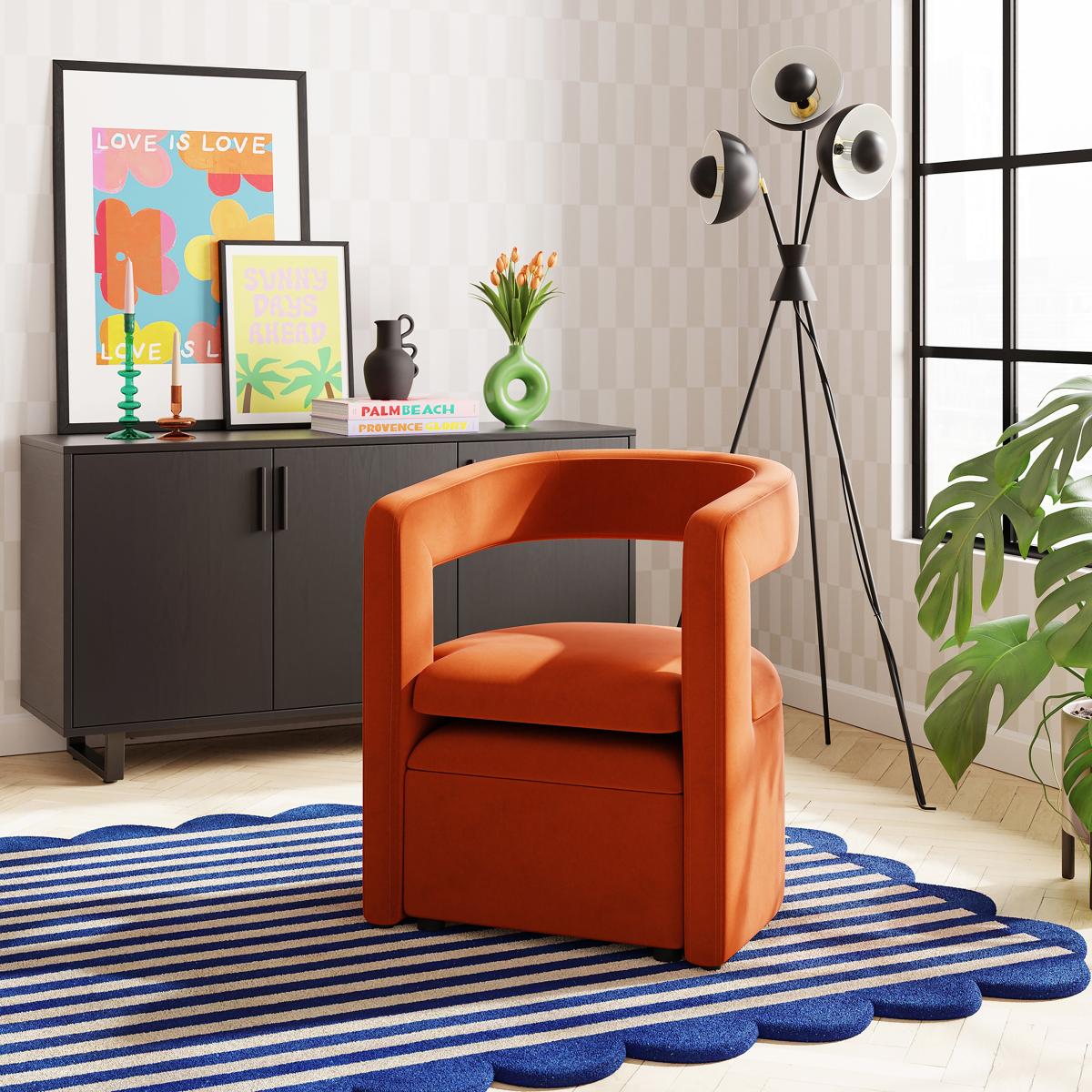 The Tallie Velvet Accent Chair in Rust is a fantastic statement piece that adds warmth and richness to a variety of interiors. I love its plush velvet finish, which offers both comfort and sophistication, making it perfect for cosy corner reads or as a stylish addition in a living room or bedroom. Its deep, earthy tone works well within both modern and traditional spaces, especially when paired with neutral tones to create contrast, or with other warm hues for a cohesive look. For styling tips, consider placing it near a gallery wall or using it to anchor a seating arrangement with contrasting cushions or throws-its elegant yet inviting appearance makes it versatile for different decor schemes.