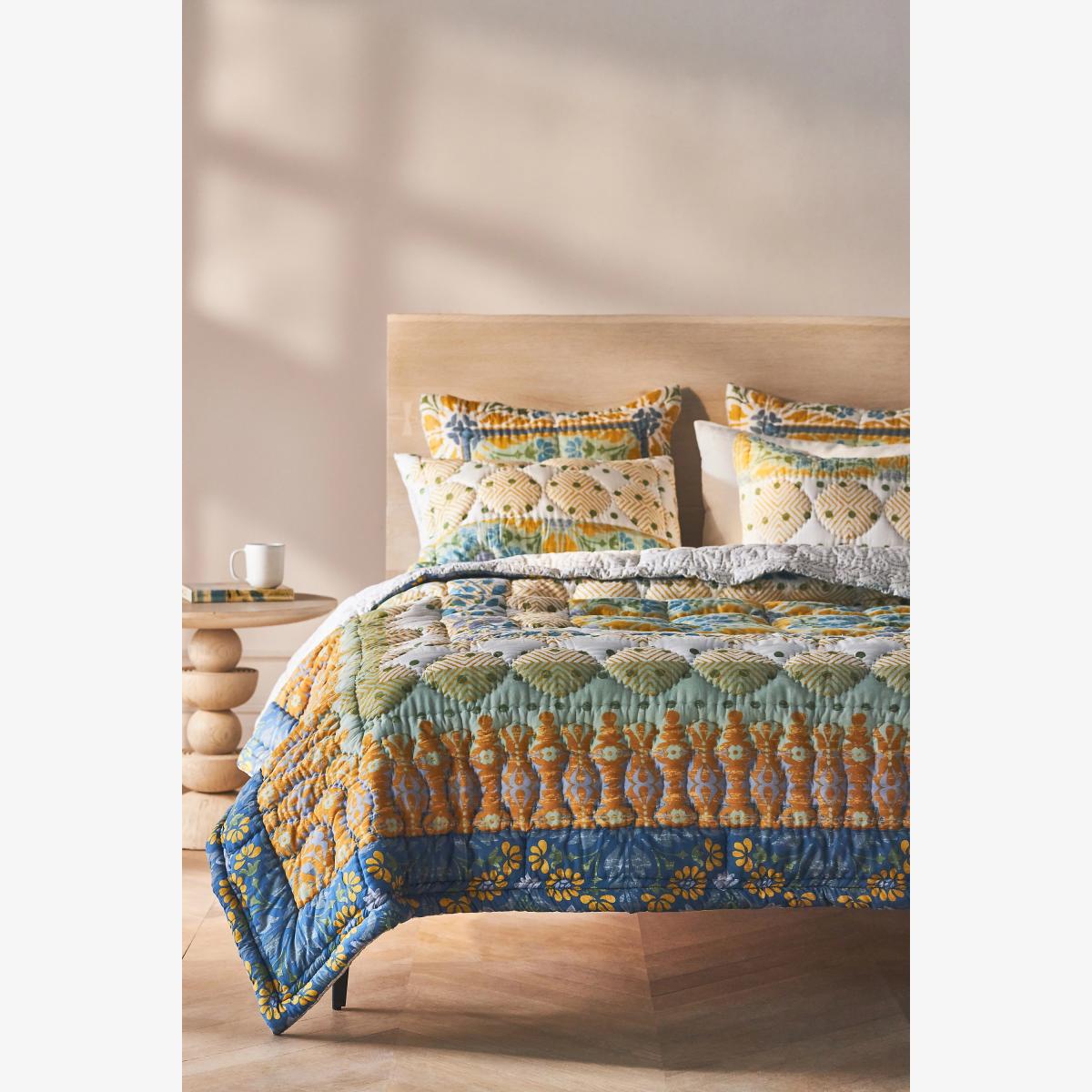 I love the Talula Sunshine quilt for its lively yet sophisticated pattern and its versatility in a range of interiors. It works particularly well in boho, eclectic, or country-inspired bedrooms, adding colour and texture without overwhelming the space. To style it, I recommend layering with neutral cushions or throws to tone down bold patterns, and pairing it with natural textiles like linen or jute for a relaxed, inviting look. Because of its quilting and size, it also works nicely as a lightweight cover during warmer months or as an eye-catching bedspread layered with other textiles for a cosy, layered bed.