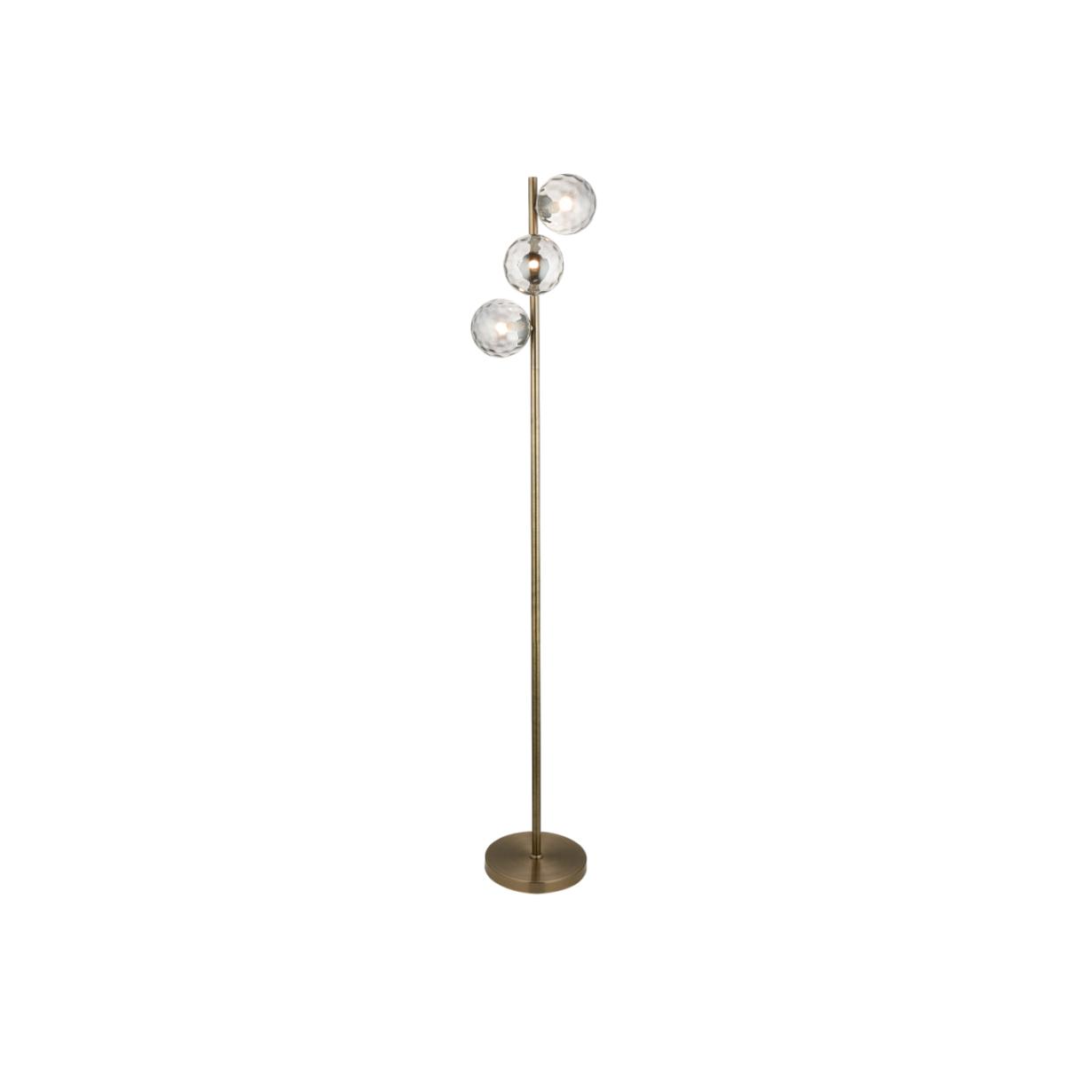 Elevate your space with vintage-inspired sophistication using the. This elegant floor lamp showcases timeless design elements with a contemporary edge, making it a striking addition to any living room, bedroom, or reading corner. Crafted with a rich antique brass plate, the lamp features three smoke mirrored dimple glass globe shades arranged at staggered heights along a sleek central stem. The dimpled glass subtly diffuses the light, casting warm, ambient illumination with a touch of glamour and depth. With its slim profile and stylish finish, the Tamara floor lamp brings both function and elegance to your home. It coordinates beautifully with other pieces from the Tamara collection, including ceiling lights, a wall light, and a table lamp, allowing you to create a seamless lighting scheme throughout your space.