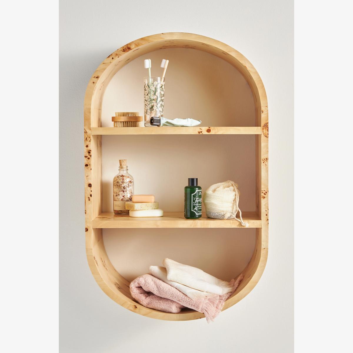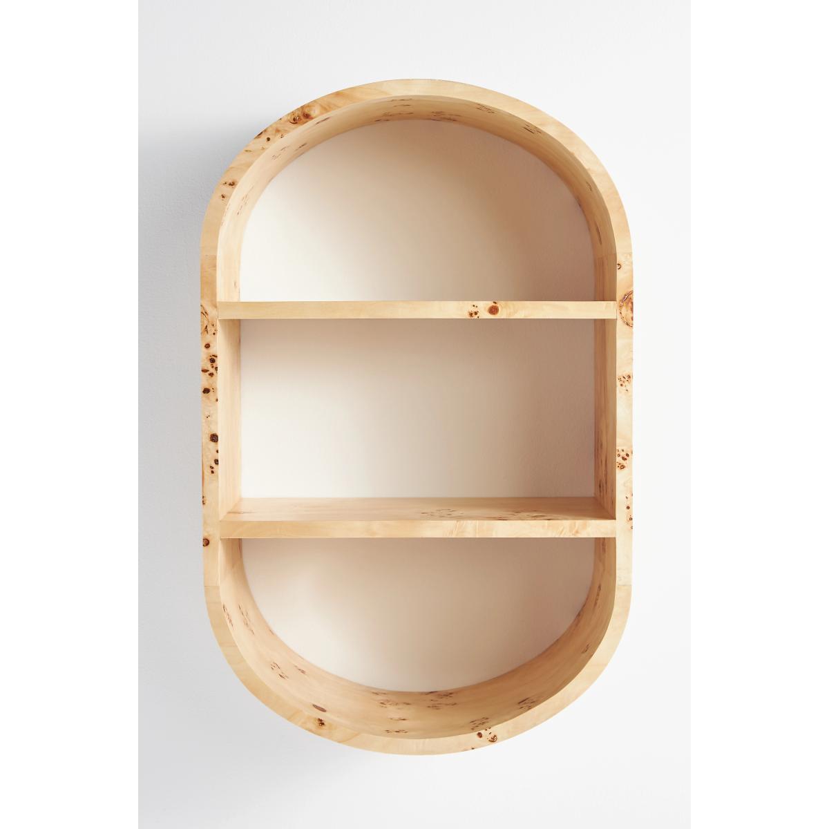 Finished with an eye-catching burl wood veneer, the Tamara Shelf is perfect for displaying everything from small house plants to little trinkets. Tamara Burl Open Shelving Unit by Anthropologie in Beige