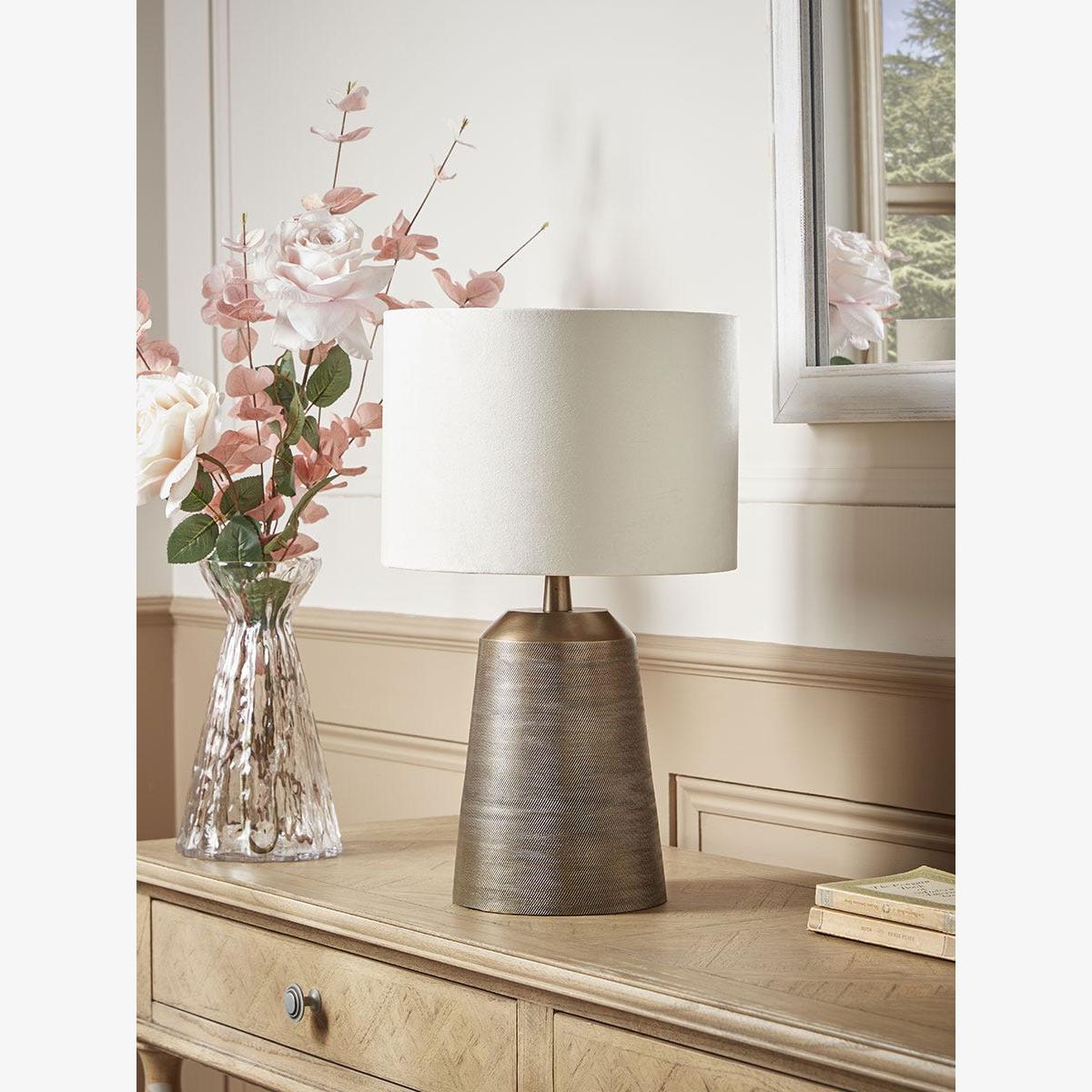 Gently tapered, an aged brass with a lightly textured surface creates the base of our Tamara Table Lamp. Finished with a neutral shade sitting delicately on top of the striking base, this lamp exudes vintage charm and sophistication sitting wonderfully in our Faded Elegance trend.  Discover how to create the perfect lighting scheme for your home using our Lighting Buying Guide.
