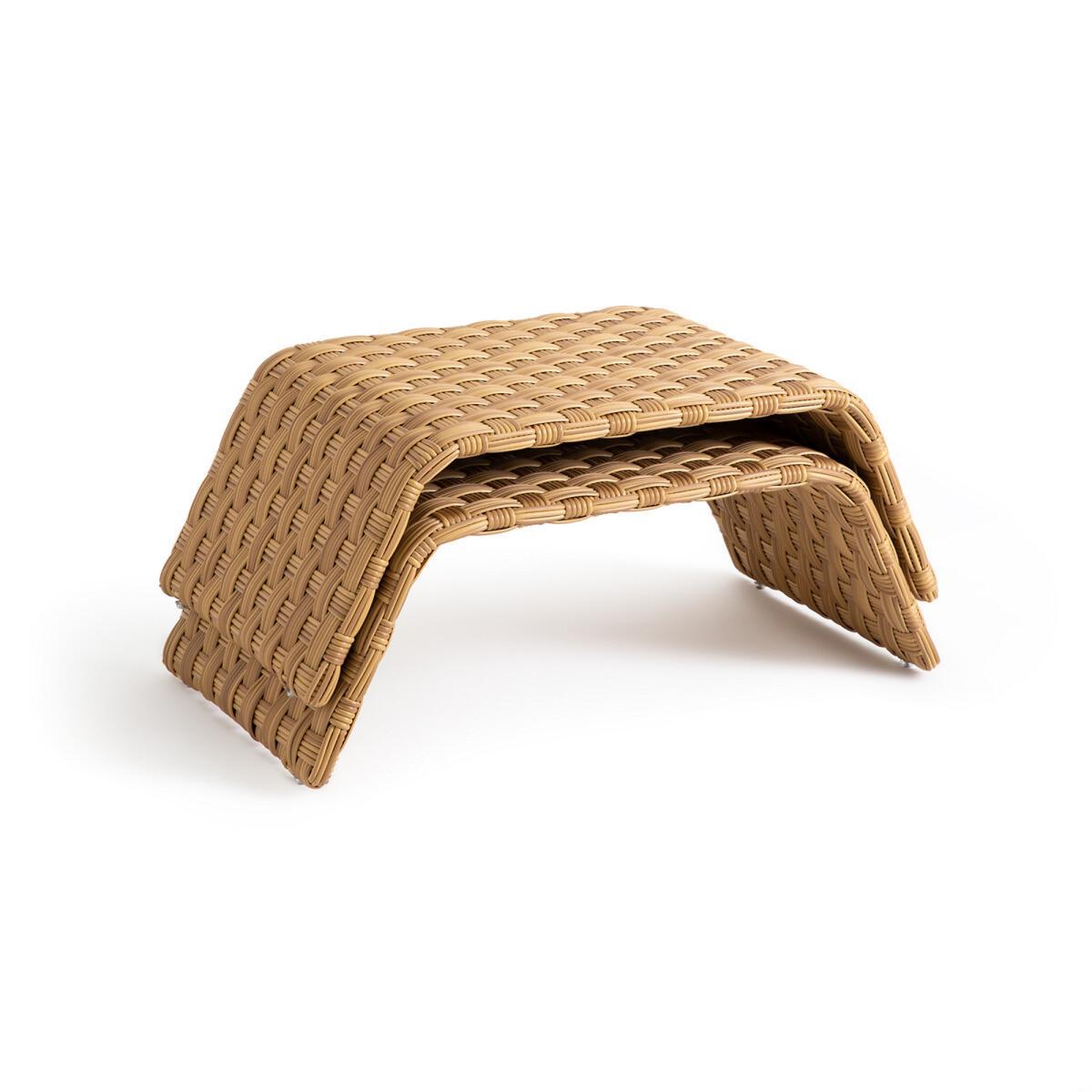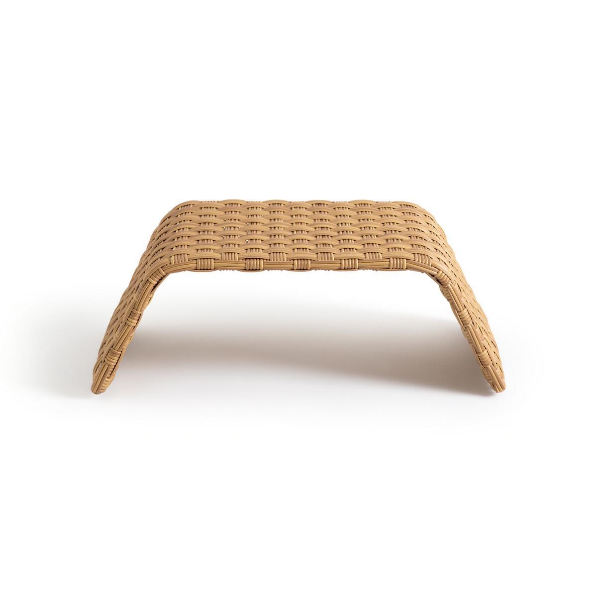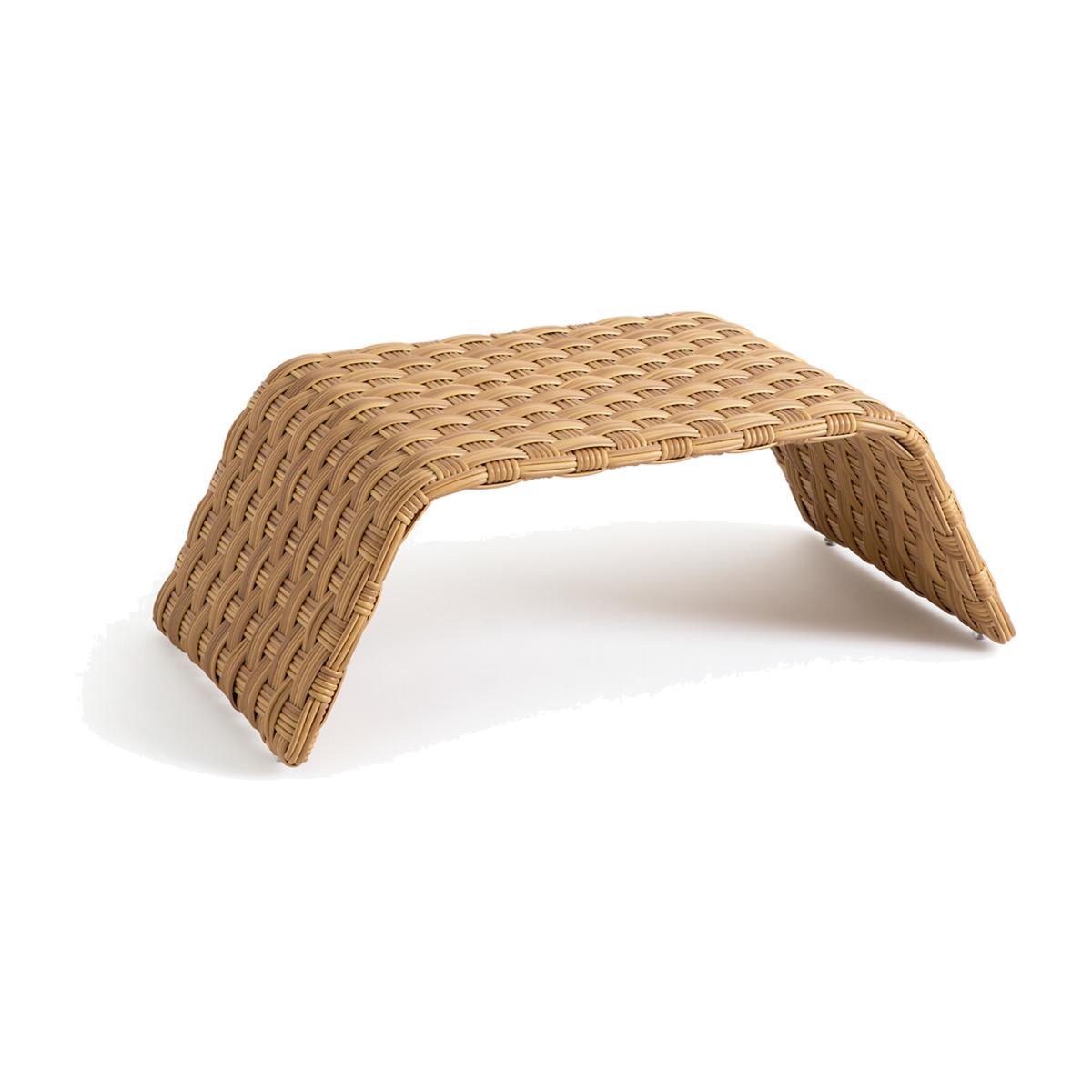 The Tamet outdoor coffee table is made of polyethylene resin. Its curved arc highlight the shape of the braiding design.