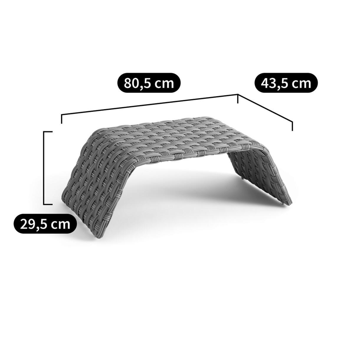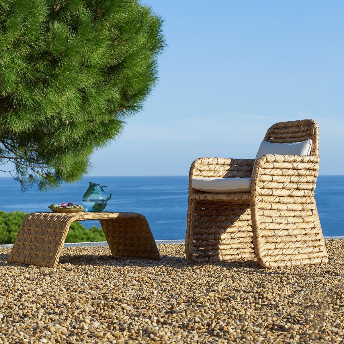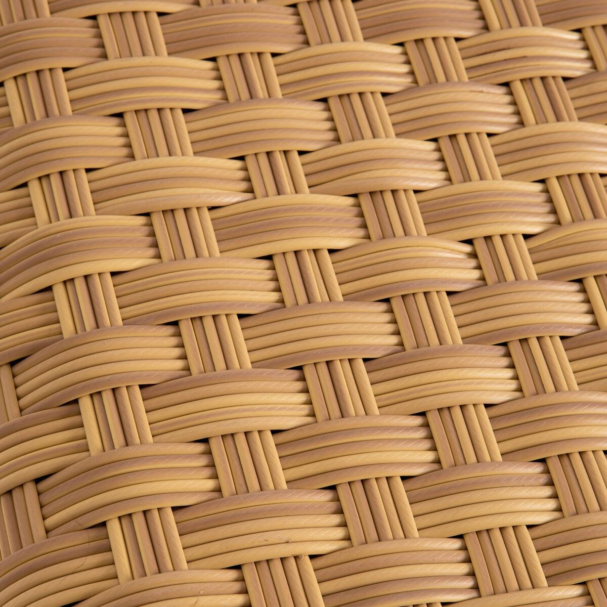 The Tamet outdoor coffee table is made of polyethylene resin. Its curved arc highlight the shape of the braiding design.