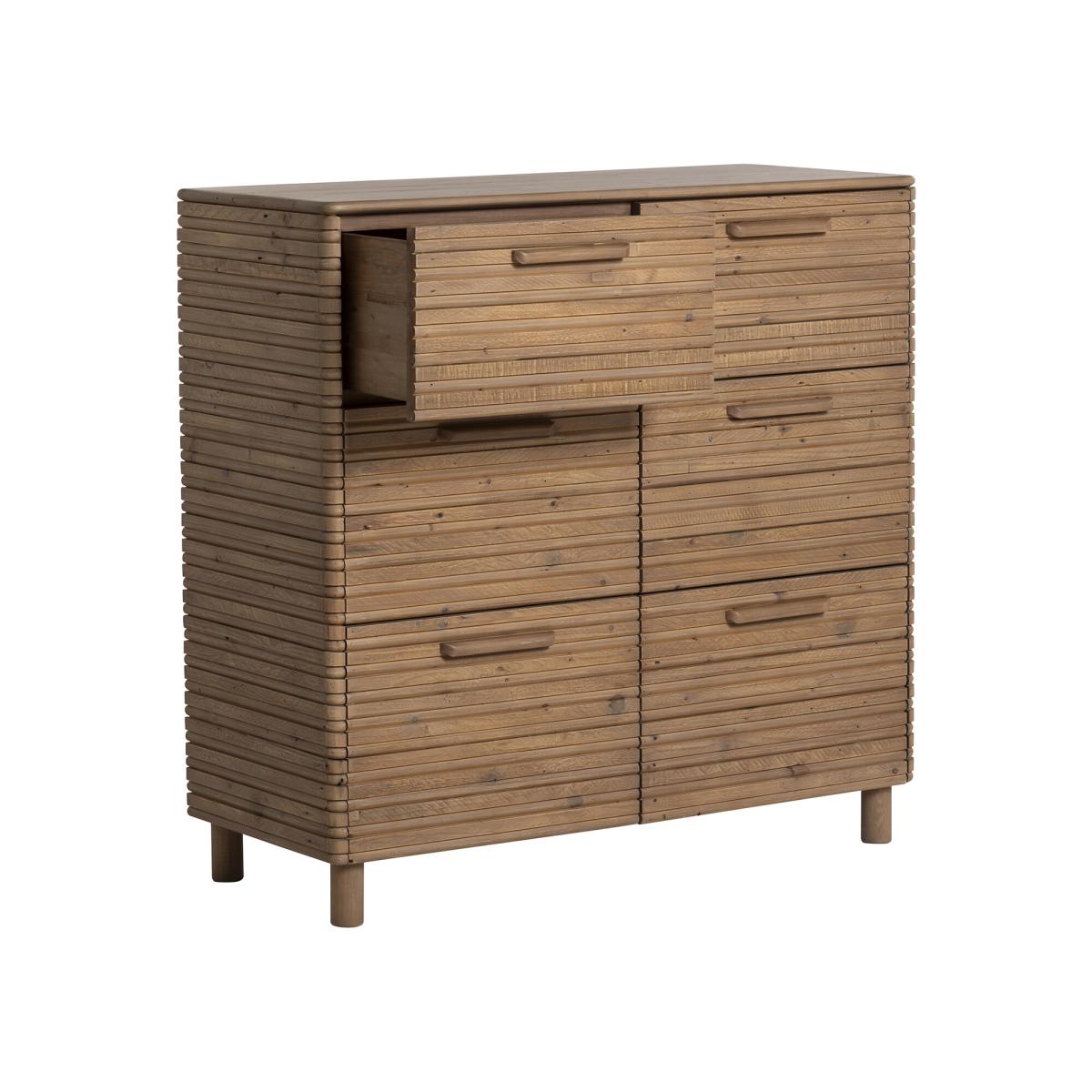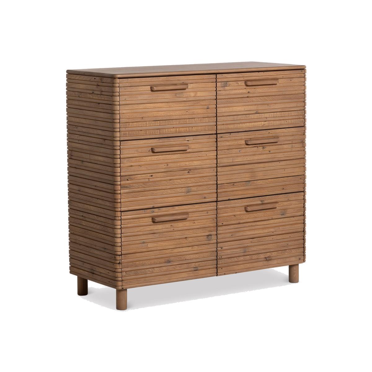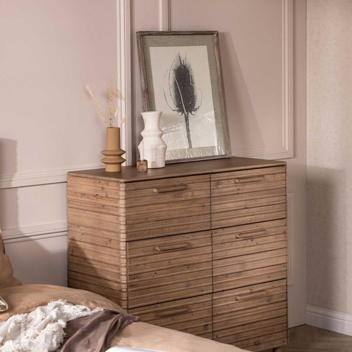 I love this cabinet because of its clean, modern lines combined with the natural warmth of the wood, making it a versatile piece for various interiors. It works particularly well in contemporary or Scandi-style spaces, but can also add texture and interest to an industrial or rustic setting. Practical styling tips include pairing it with brass or matte black accessories for contrast, and using the top surface for decorative trays, lamps, or plants to keep the look inviting. Its six drawers provide excellent storage, making it as functional as it is stylish, whether in a bedroom, living room, or hallway.