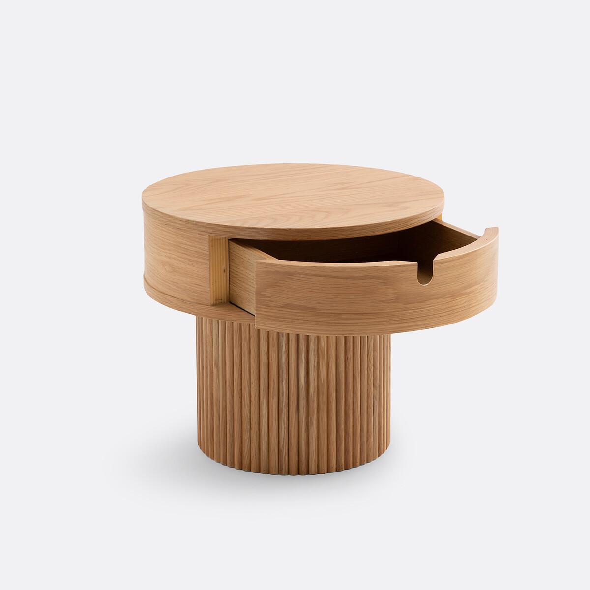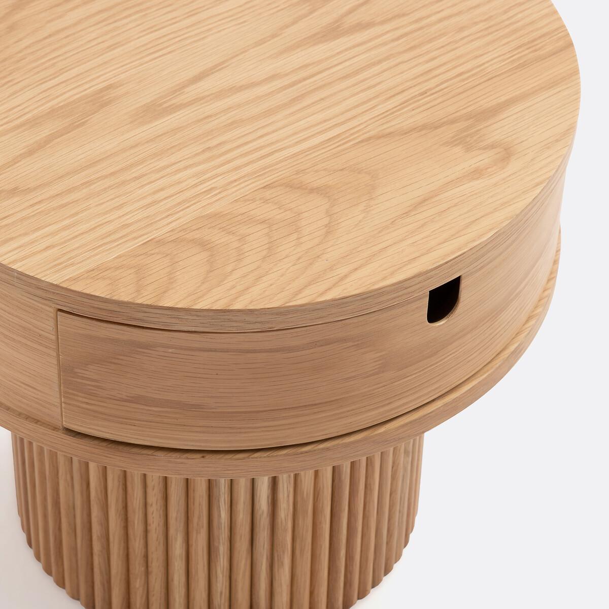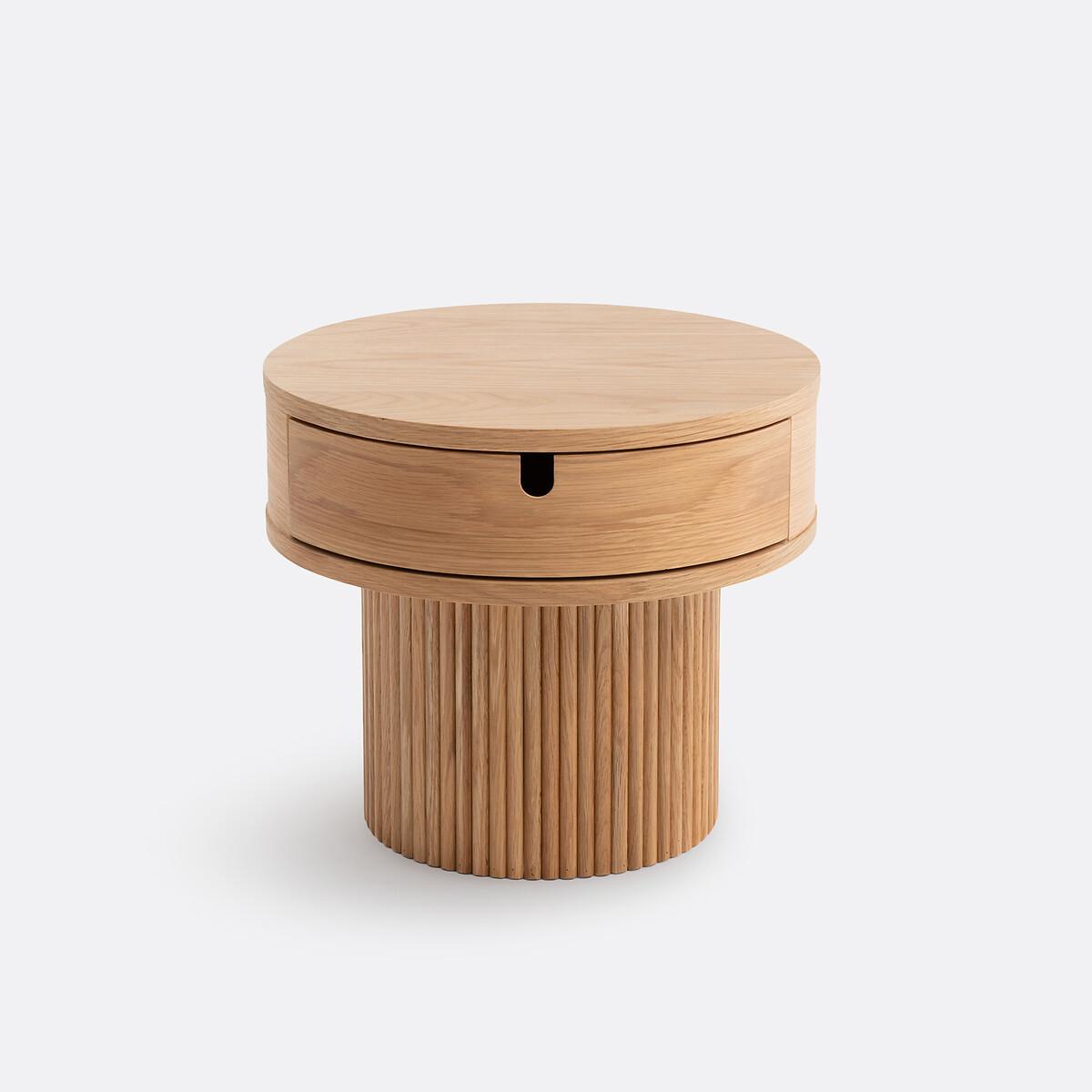 The Tamita bedside table is part of the La Redoute Intérieurs Signatures collection. A selection of exclusive creations, designed by our in-house design studio. Inspiring, easy to live with, trendy... these products have become our customers' favourites. and no doubt yours!. An internal design by Adrien Edel :"Small but sure to make a big impression!Tamita is a bedside table that stands out from the crowd with its round shape. It combines compact dimensions, storage space and a contemporary look with its fluted solid oak base. "Product Details • 1 drawer • Unit in oak-veneered MDF • Leg covered with half-round solid oak slats • Nitrocellulose varnish finish • FSC® certified woodDimensions. Overall • Shelf diameter: 39.5cm • Base diameter: 26cm • Height: 34cm • Weight: 8kg. Usable dimensions • Drawer: L26 x H6.4 x D25.5cmDelivery:. Sold pre-assembled. Available for home delivery. Note! Please check that all access points are large enough to accommodate your delivery (doors, stairs, lifts). • WOOD FROM SUSTAINABLY MANAGED FORESTS. FSC® certified wood comes from forests that are environmentally, socially and economically well managed. Dimensions and weight of parcel • 1 parcel • L48.5 x H42.5 x D48.5cm. 12kg.