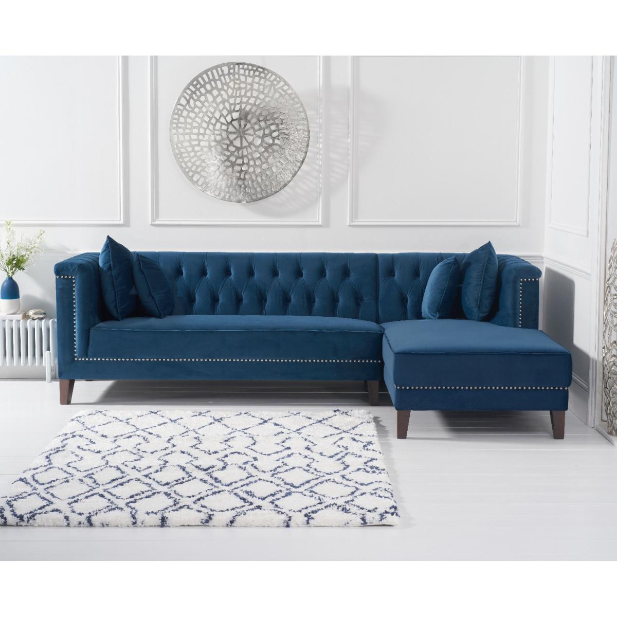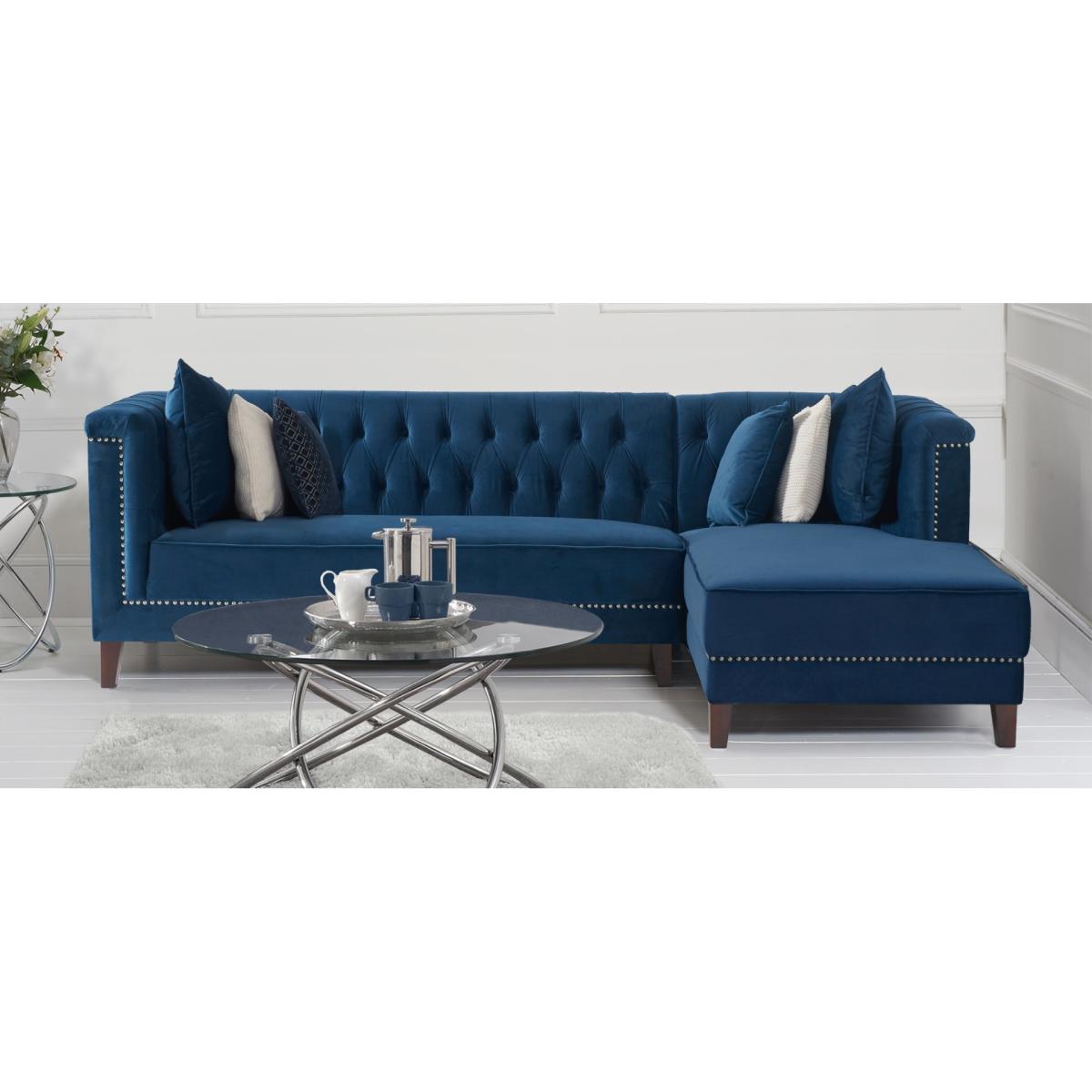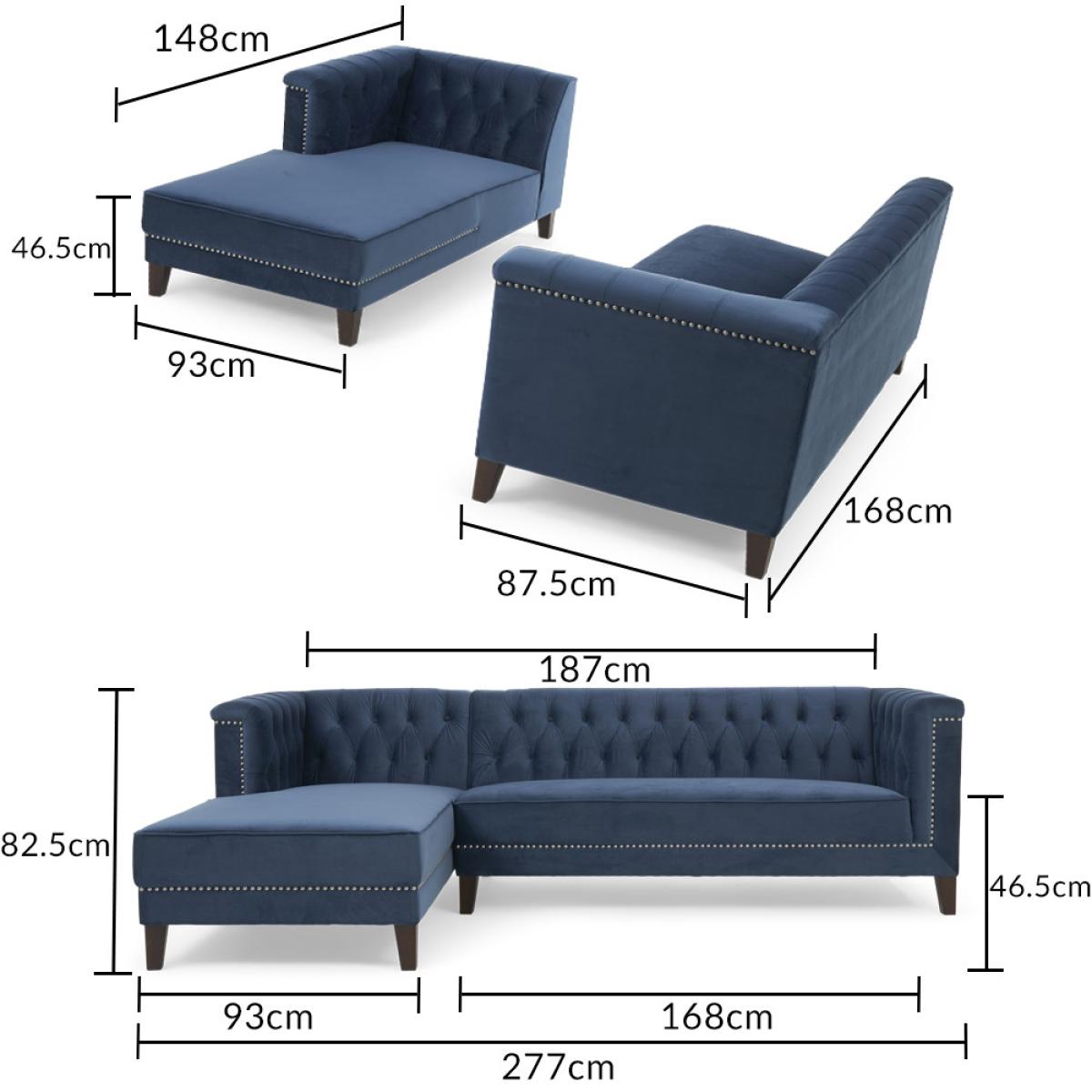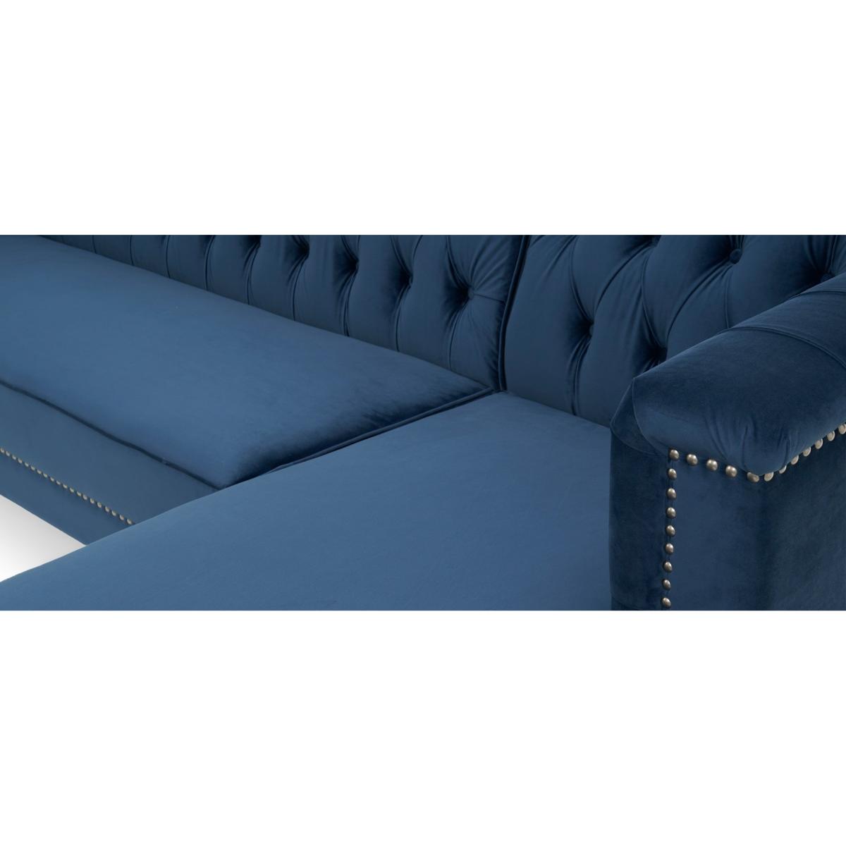 Covered in our plush, luxe velvet upholstery in a beautiful jewel-blue, the elegant Tammie Chaise Sofa features a deep foam-filled, 3 cushioned design, with tufted inset button detailing to the plump backrest and arms. Trimmed in contemporary grey metal studs for a stylish update on a classic design, with sturdy, tapered dark legs to support. Chesterfield tufted buttons to the backrest and arms add sophistication as well as cosy comfort. With two large deep foam-filled seats, and one longer chaise style for the whole family to relax on. Metal studded trims modernise a classic, much-loved design. Soft velvet upholstery adds a luxurious feel, and of-the-moment texture. Comes with 4 free scatter cushions to complete the look. Also available in a Left Facing Option