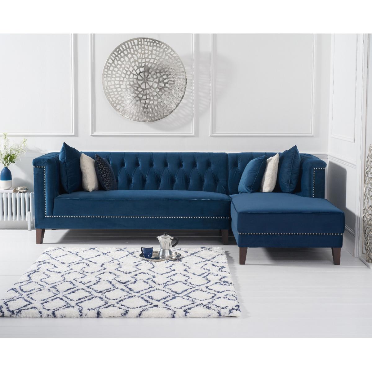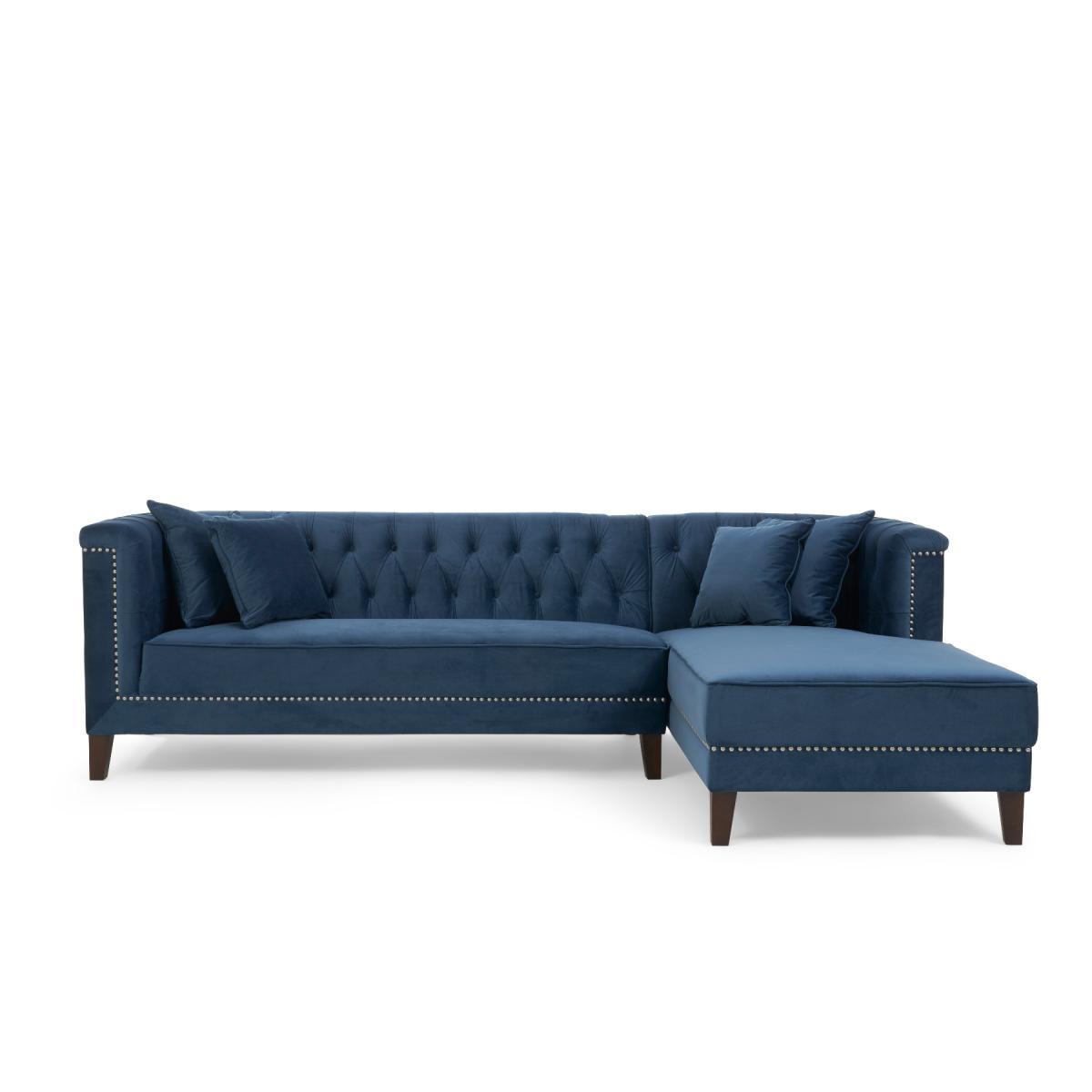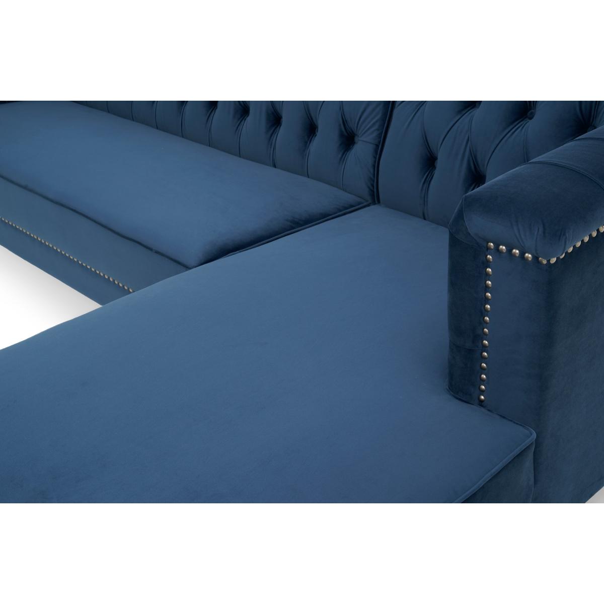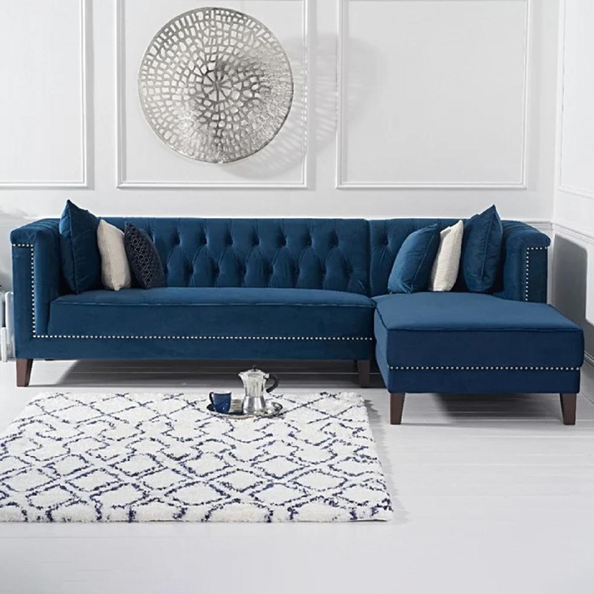 Covered in our plush, luxe velvet upholstery in a beautiful jewel-blue, the elegant Tammie Chaise Sofa features a deep foam-filled, 3 cushioned design, with tufted inset button detailing to the plump backrest and arms. Trimmed in contemporary grey metal studs for a stylish update on a classic design, with sturdy, tapered dark legs to support. Chesterfield tufted buttons to the backrest and arms add sophistication as well as cosy comfort. With two large deep foam-filled seats, and one longer chaise style for the whole family to relax on. Metal studded trims modernise a classic, much-loved design. Soft velvet upholstery adds a luxurious feel, and of-the-moment texture. Comes with 4 free scatter cushions to complete the look. Also available in a Left Facing Option