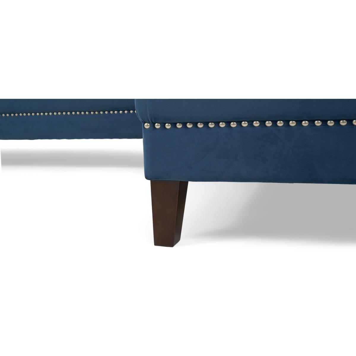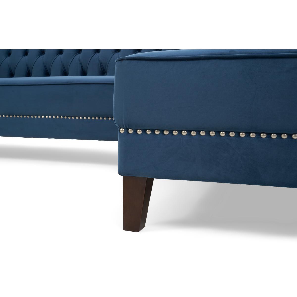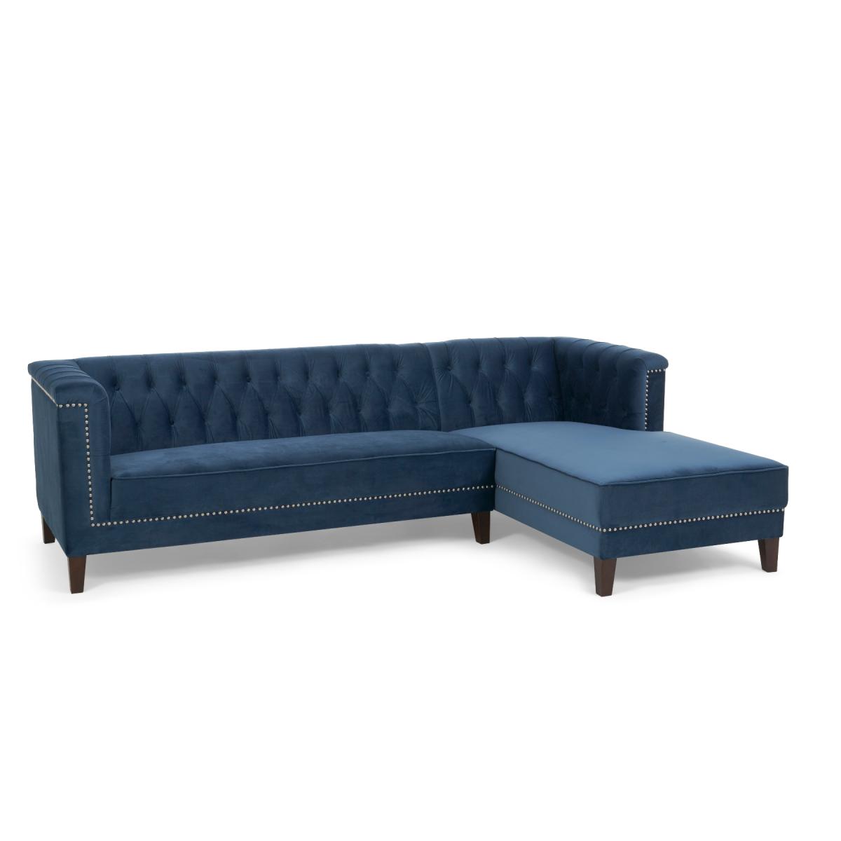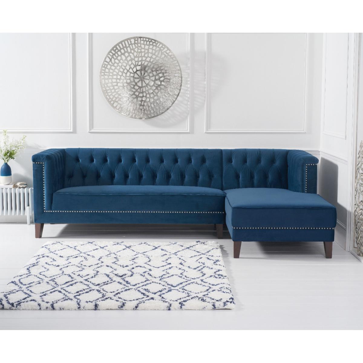 Covered in our plush, luxe velvet upholstery in a beautiful jewel-blue, the elegant Tammie Chaise Sofa features a deep foam-filled, 3 cushioned design, with tufted inset button detailing to the plump backrest and arms. Trimmed in contemporary grey metal studs for a stylish update on a classic design, with sturdy, tapered dark legs to support. Chesterfield tufted buttons to the backrest and arms add sophistication as well as cosy comfort. With two large deep foam-filled seats, and one longer chaise style for the whole family to relax on. Metal studded trims modernise a classic, much-loved design. Soft velvet upholstery adds a luxurious feel, and of-the-moment texture. Comes with 4 free scatter cushions to complete the look. Also available in a Left Facing Option