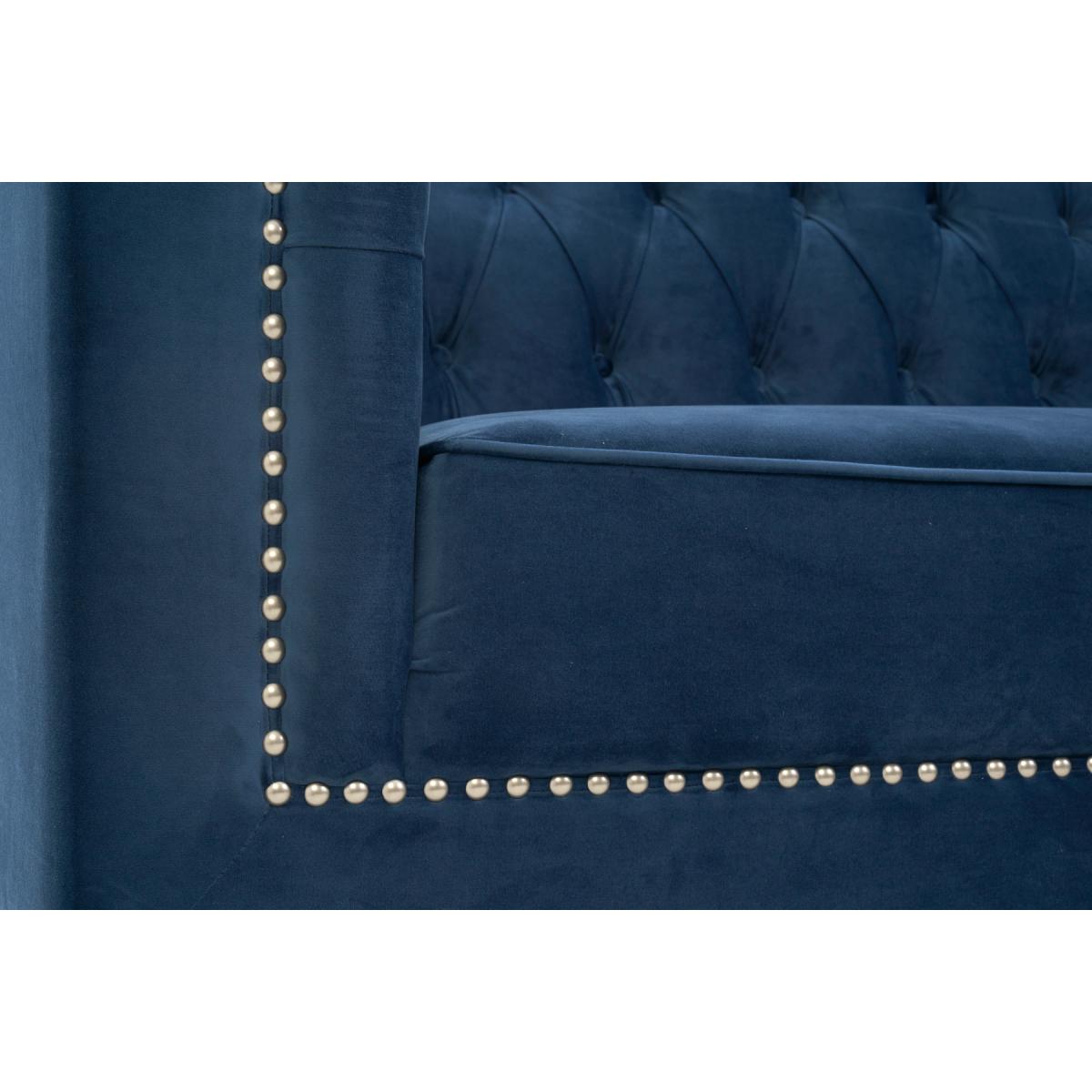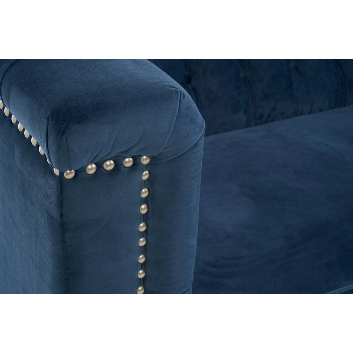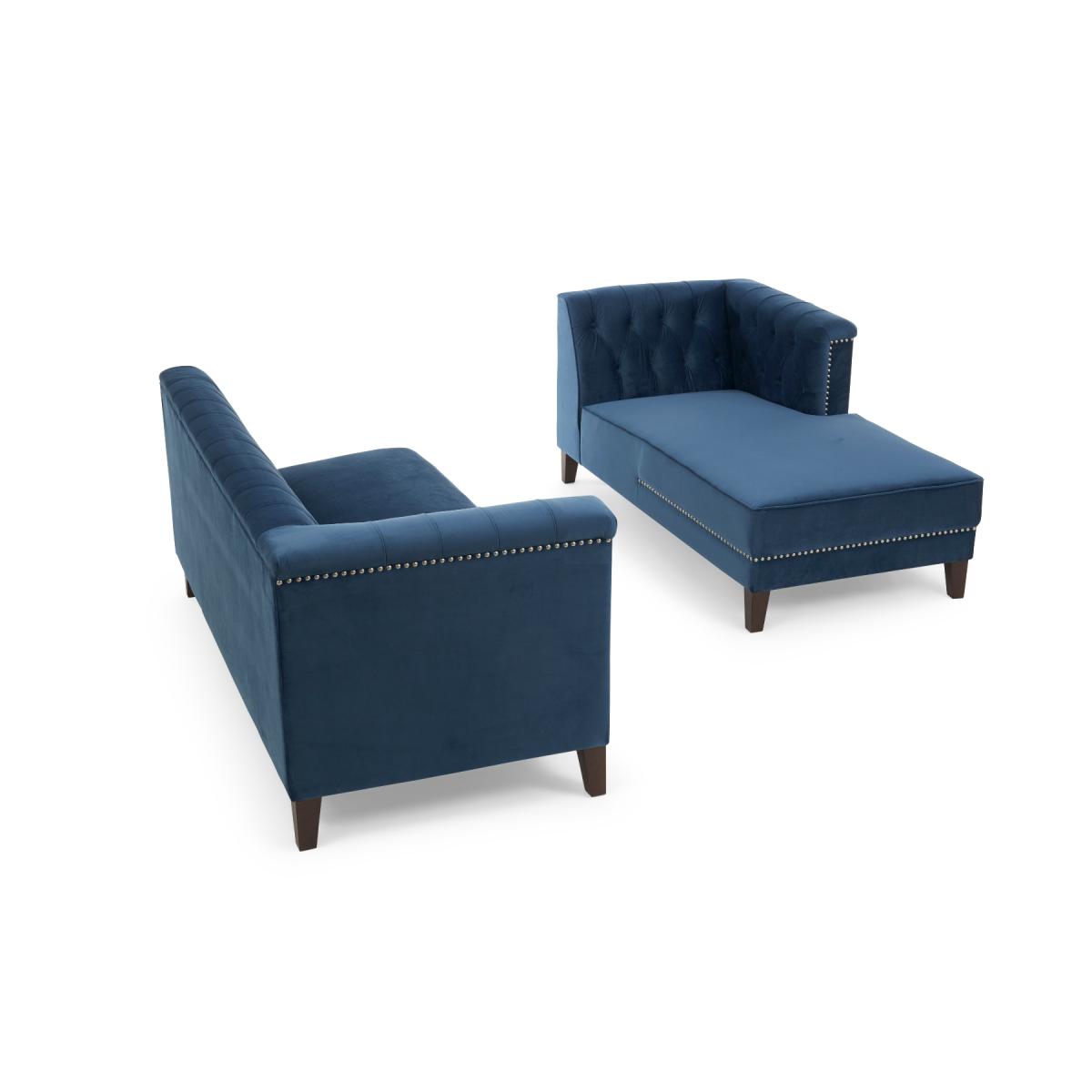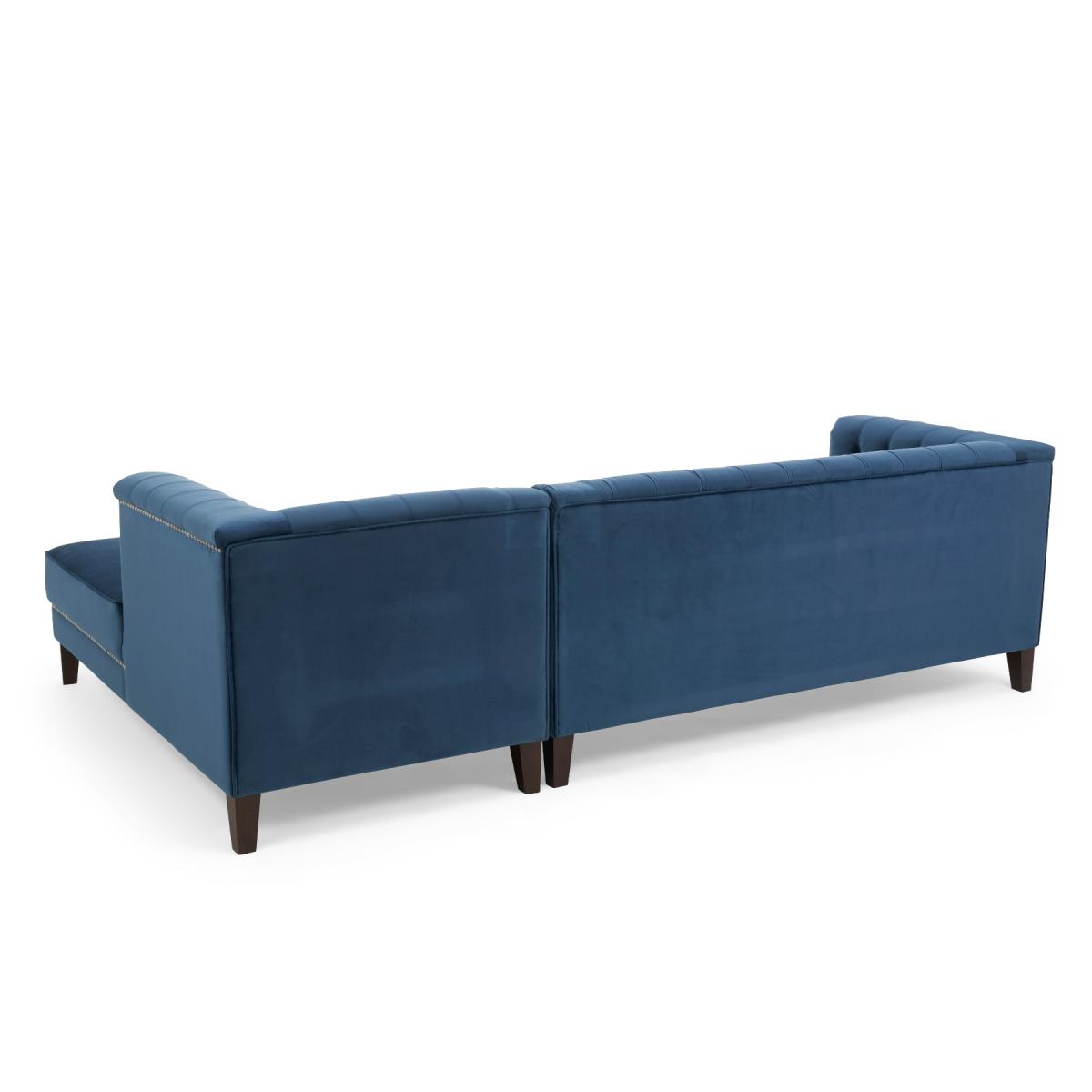 Covered in our plush, luxe velvet upholstery in a beautiful jewel-blue, the elegant Tammie Chaise Sofa features a deep foam-filled, 3 cushioned design, with tufted inset button detailing to the plump backrest and arms. Trimmed in contemporary grey metal studs for a stylish update on a classic design, with sturdy, tapered dark legs to support. Chesterfield tufted buttons to the backrest and arms add sophistication as well as cosy comfort. With two large deep foam-filled seats, and one longer chaise style for the whole family to relax on. Metal studded trims modernise a classic, much-loved design. Soft velvet upholstery adds a luxurious feel, and of-the-moment texture. Comes with 4 free scatter cushions to complete the look. Also available in a Left Facing Option