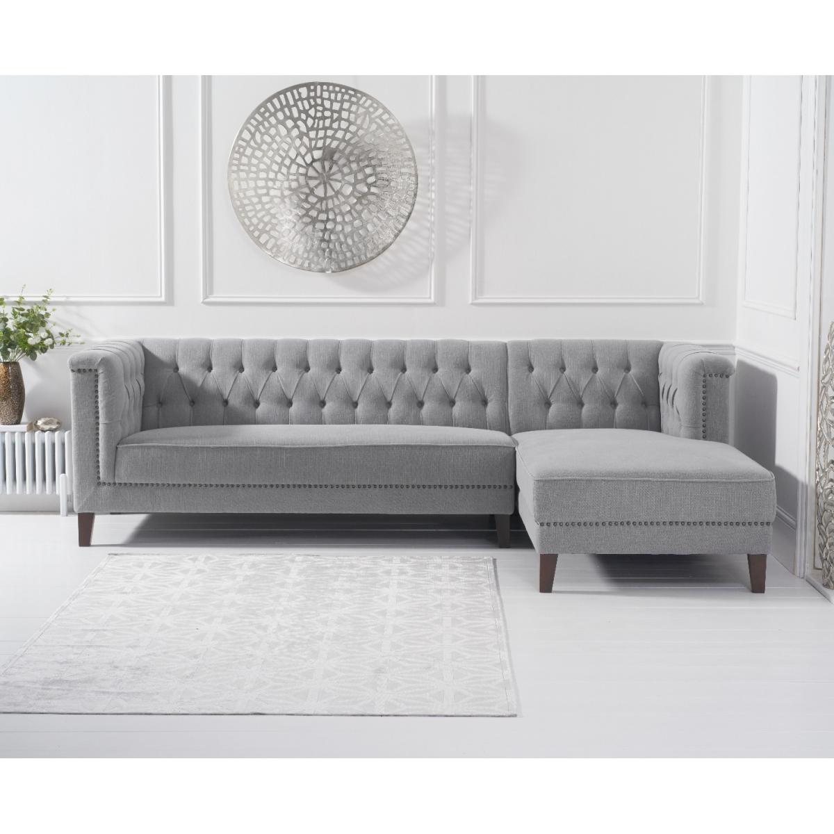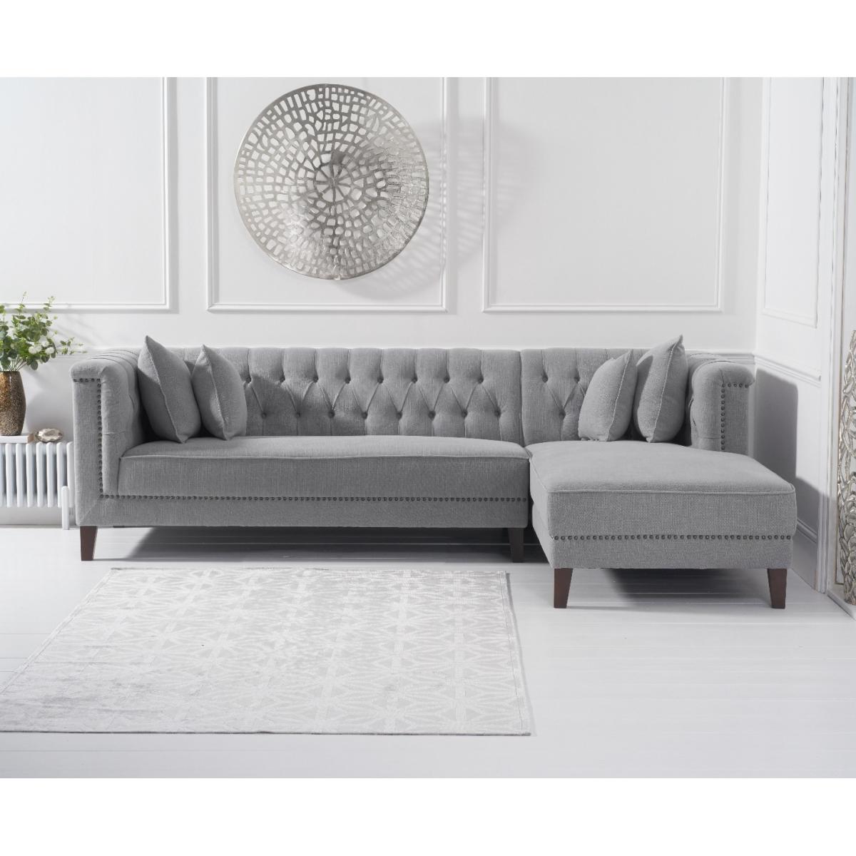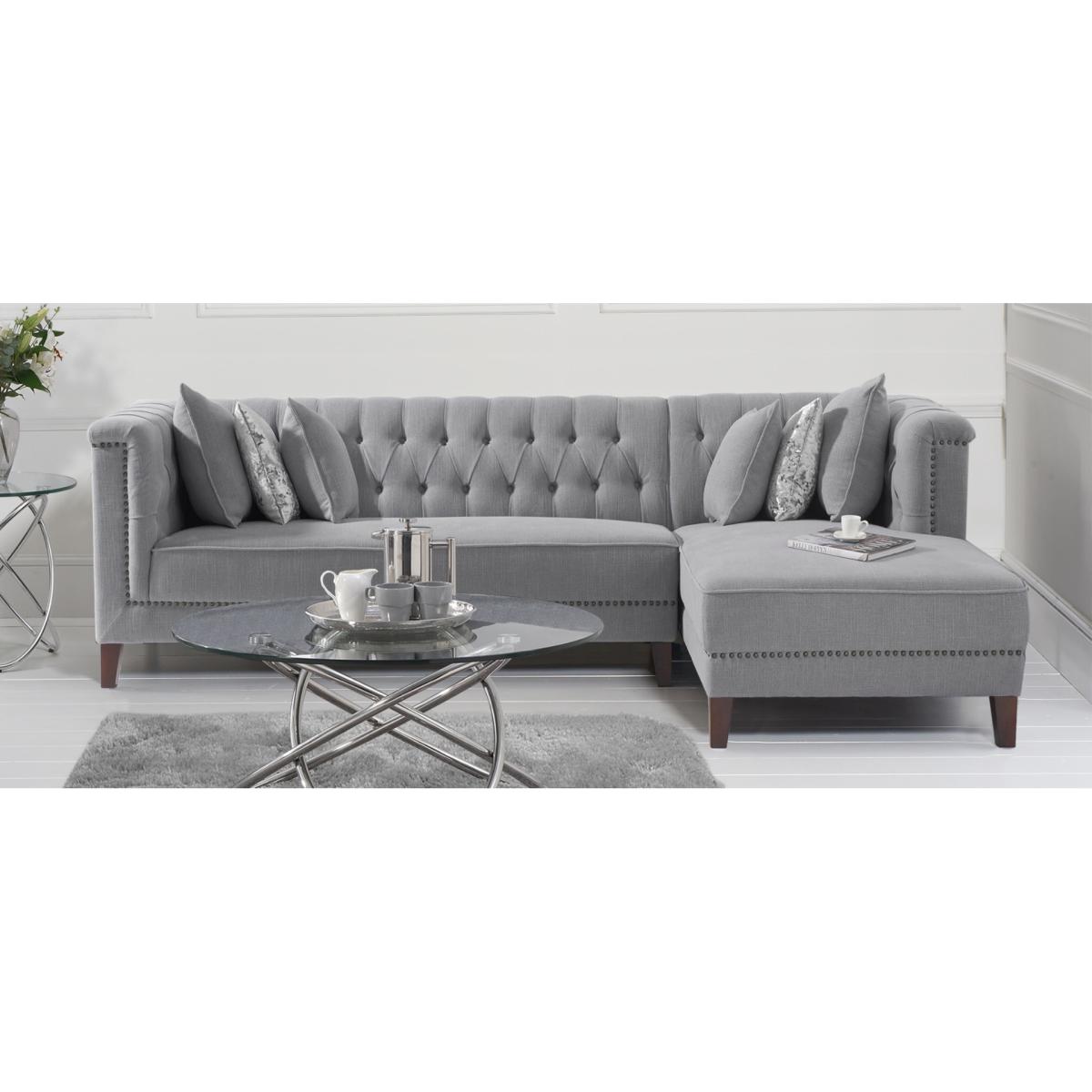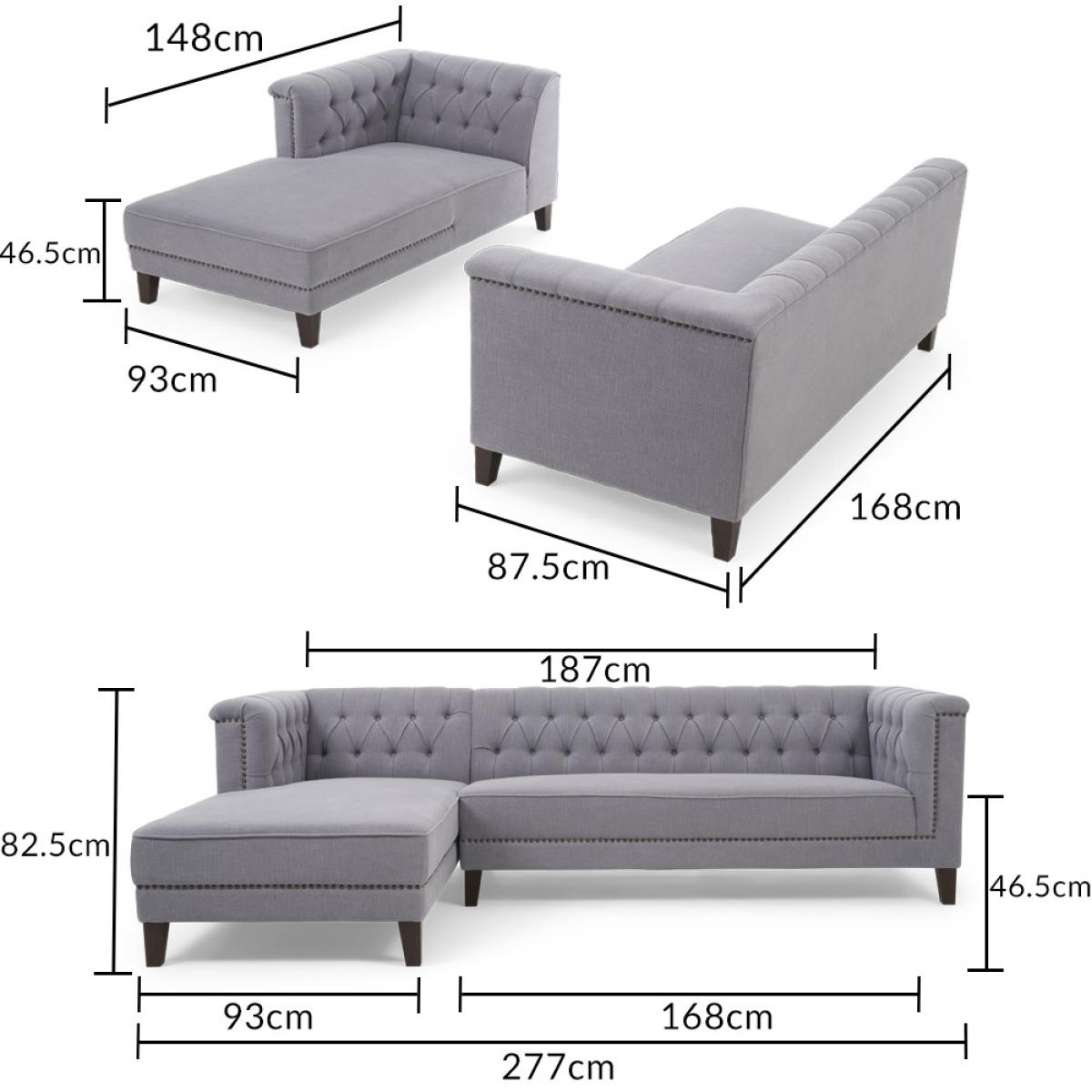 In our soft and light Grey Linen upholstery, the Tammie Chaise Sofa is a beautiful choice for a statement centre piece in any elegant living space. Featuring a deep foam-filled, 3 cushioned design, with stylishly tufted inset button detailing to the plump backrest and arms. Chesterfield tufted buttons to the backrest and arms add sophistication as well as cosy comfort. With two large deep foam-filled seats, and one longer chaise style for the whole family to relax on. Metal studded trims modernise a classic, much-loved design. Soft velvet upholstery adds a luxurious feel, and of-the-moment texture. Comes with 4 free scatter cushions to complete the look. Also available in a Left Facing Option