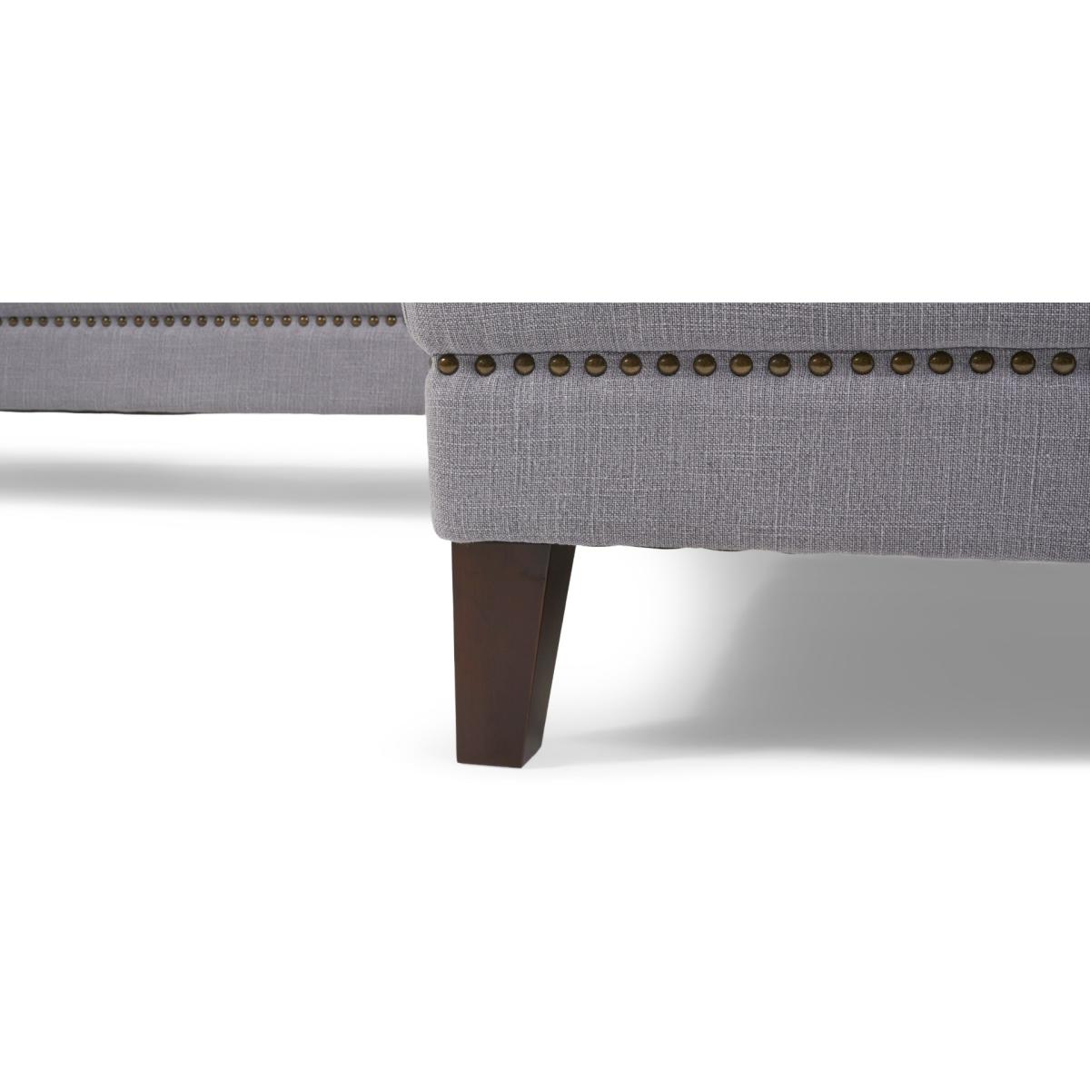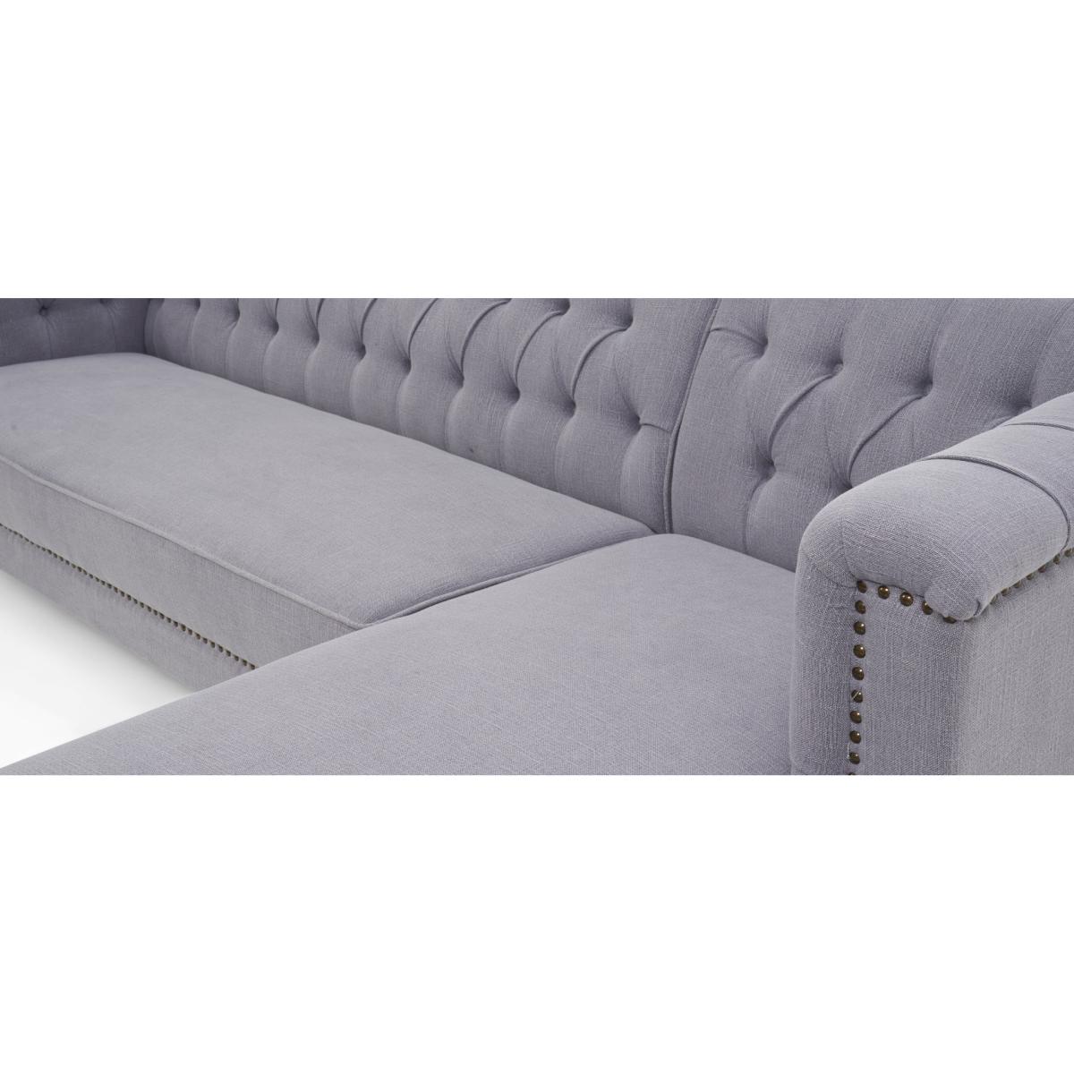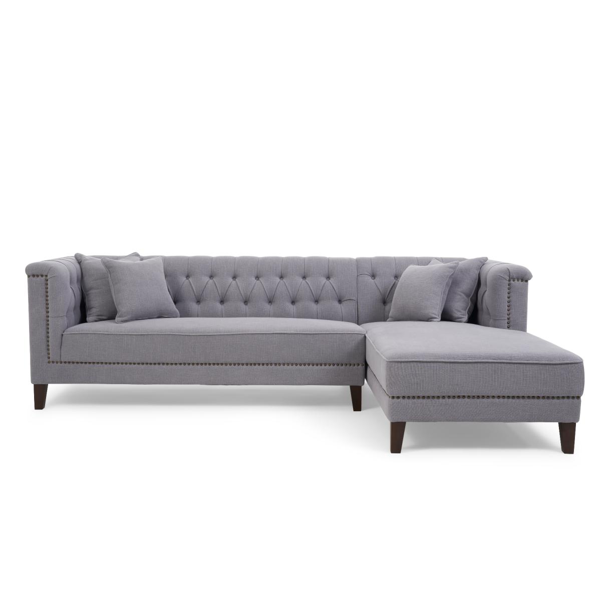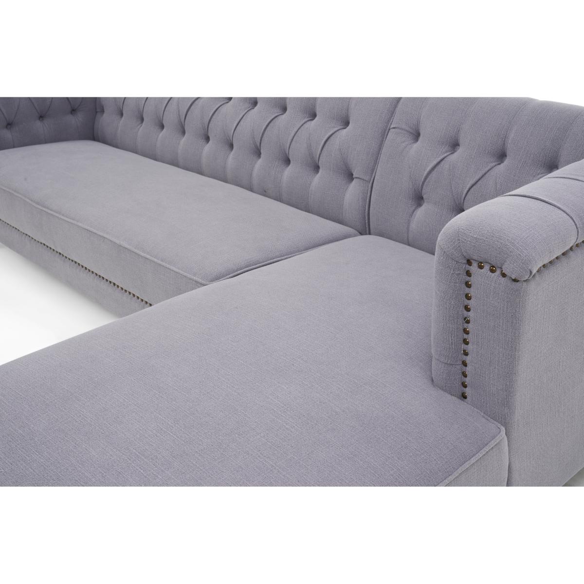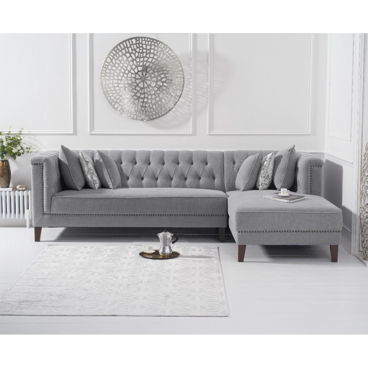 In our soft and light Grey Linen upholstery, the Tammie Chaise Sofa is a beautiful choice for a statement centre piece in any elegant living space. Featuring a deep foam-filled, 3 cushioned design, with stylishly tufted inset button detailing to the plump backrest and arms. Chesterfield tufted buttons to the backrest and arms add sophistication as well as cosy comfort. With two large deep foam-filled seats, and one longer chaise style for the whole family to relax on. Metal studded trims modernise a classic, much-loved design. Soft velvet upholstery adds a luxurious feel, and of-the-moment texture. Comes with 4 free scatter cushions to complete the look. Also available in a Left Facing Option
