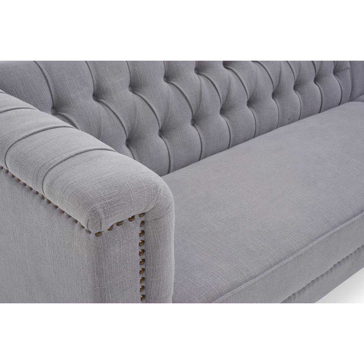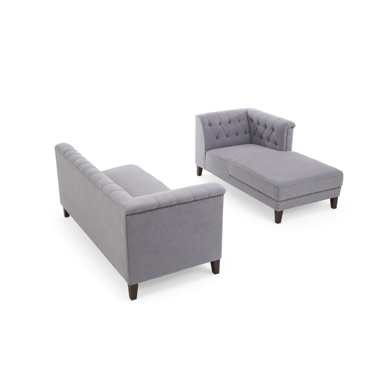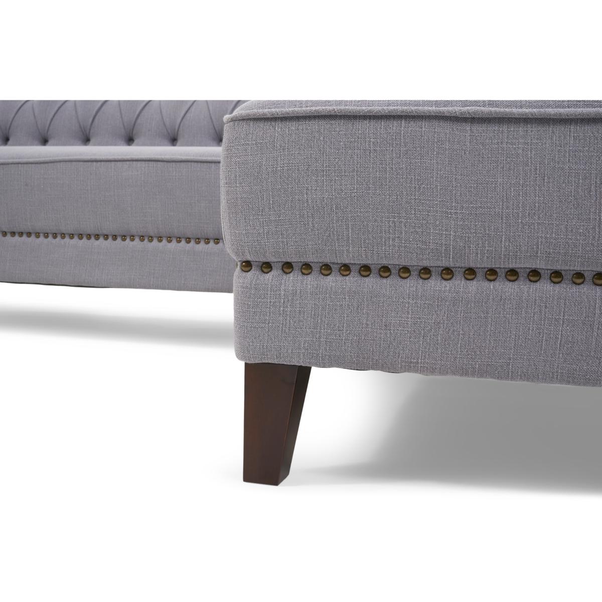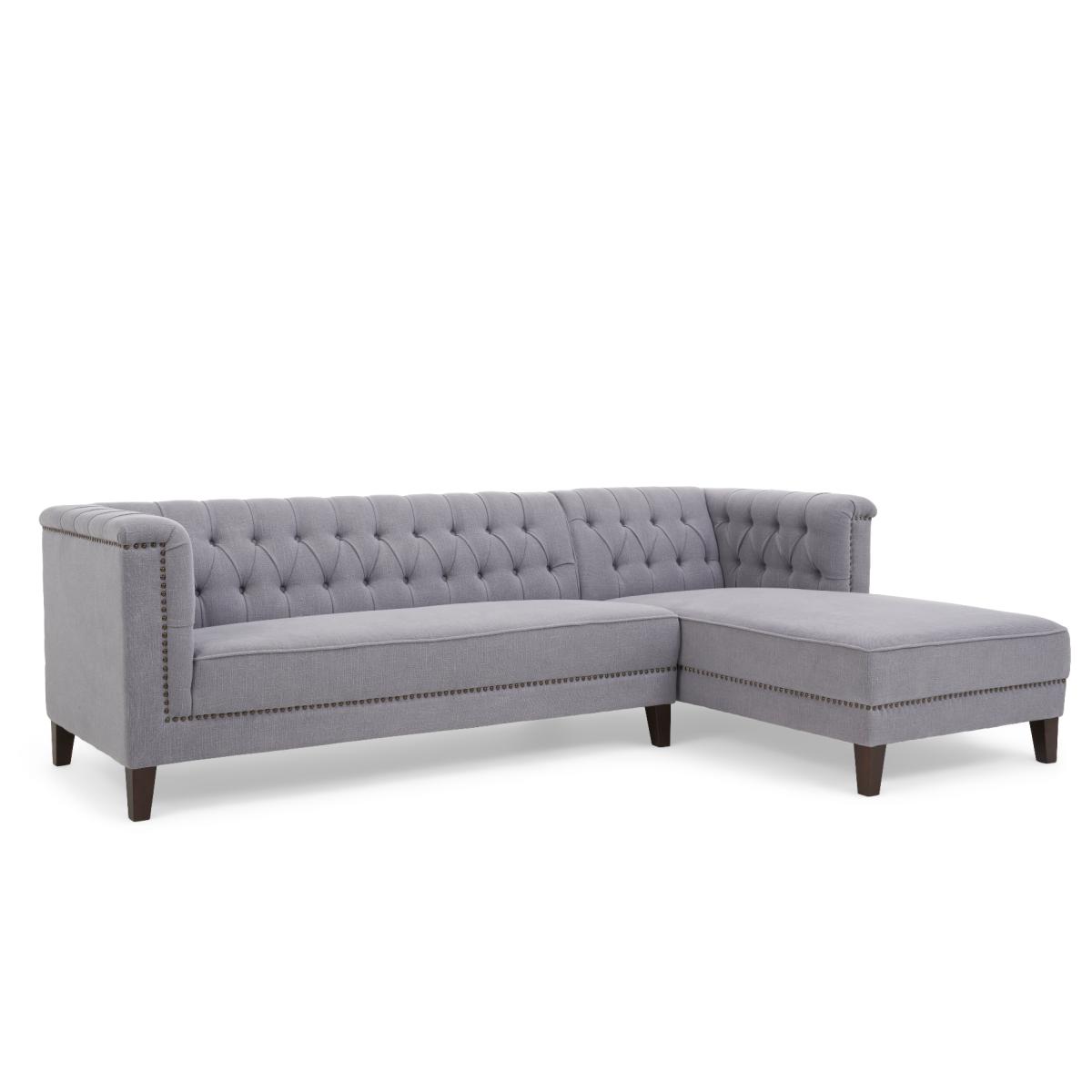 In our soft and light Grey Linen upholstery, the Tammie Chaise Sofa is a beautiful choice for a statement centre piece in any elegant living space. Featuring a deep foam-filled, 3 cushioned design, with stylishly tufted inset button detailing to the plump backrest and arms. Chesterfield tufted buttons to the backrest and arms add sophistication as well as cosy comfort. With two large deep foam-filled seats, and one longer chaise style for the whole family to relax on. Metal studded trims modernise a classic, much-loved design. Soft velvet upholstery adds a luxurious feel, and of-the-moment texture. Comes with 4 free scatter cushions to complete the look. Also available in a Left Facing Option