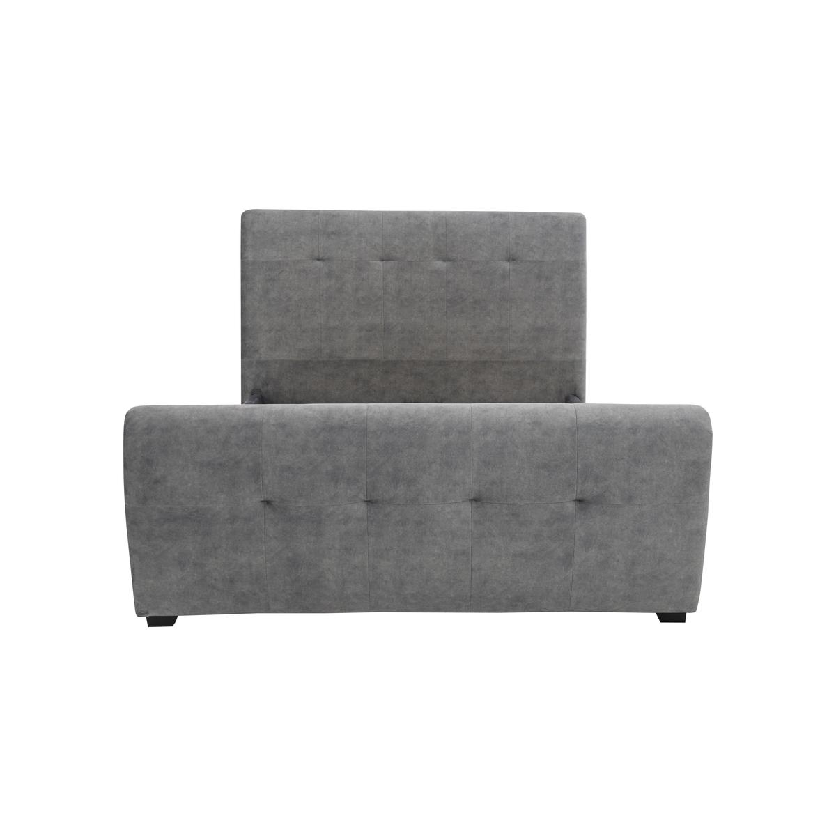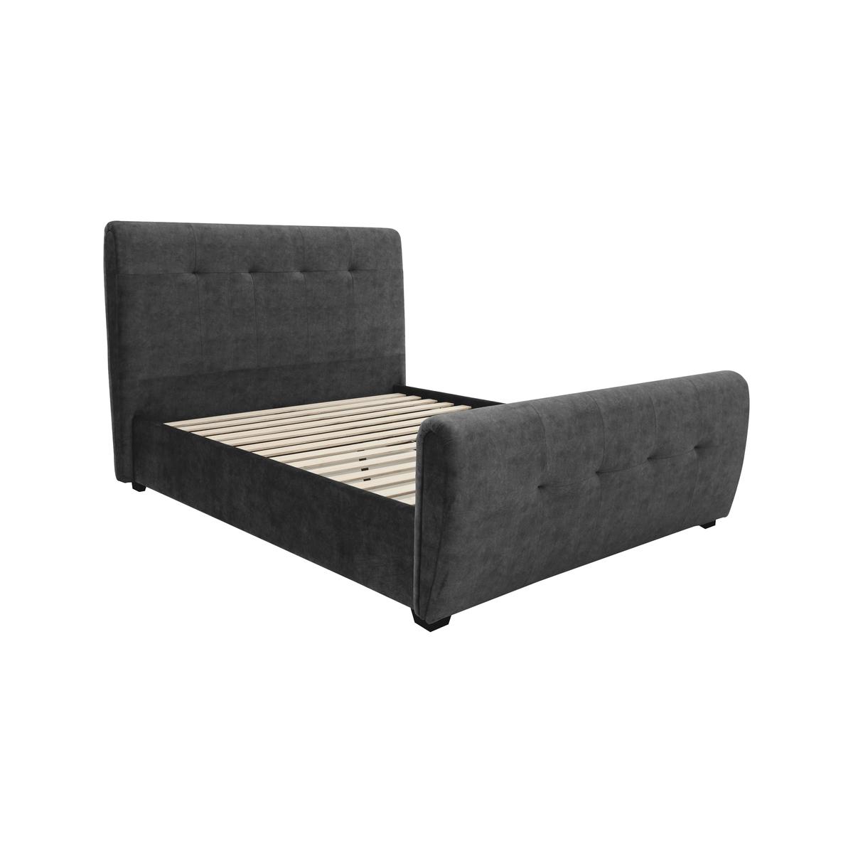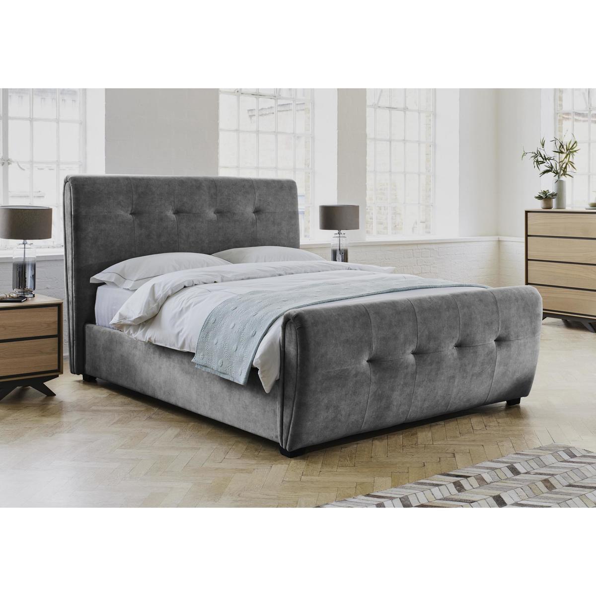 Modern brushed velvet bed frame with high head and foot ends. Available for quick delivery. Great value and only at Furniture Village. For bold modern style plus handcrafted quality at a great-value price, the Tampa brushed velvet bed frame leads the way. The imposing headboard and high foot end both feature a contemporary rounded shape, generous cushioning, a single row of buttoning and neat stitching – a combination of design elements that quickly identify this bed frame as one of the most stylish around. And what you can’t see is just as impressive. The sturdy metal base has 16 solid wood sprung slats that accommodate any type of standard mattress. Available as a double bed, king size bed and super king size bed, the Tampa brushed velvet bed frame is a Furniture Village exclusive. Headboard and footboard each come as one single piece. Mattress available separately. Top Tip: The flattening and shading of heavy wear areas on pile fabrics like chenille and velvet is unavoidable. Pile fabrics may be vacuumed lightly using the curtain attachment, and brushed regularly in the direction of the pile with a soft brush.