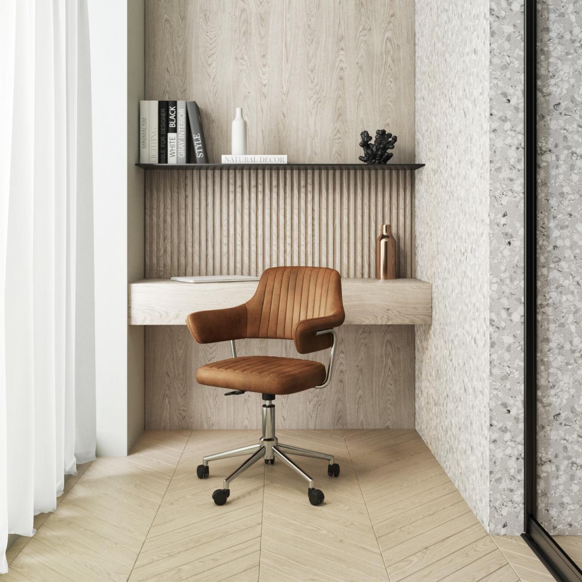 I love this desk chair’s combination of vintage-inspired faux leather and modern design - it's a versatile piece that can elevate a variety of interiors. Its warm tan tone works beautifully in both contemporary and retro-styled home offices, adding a touch of warmth and texture. To style it effectively, pair it with neutral or earthy-toned accessories for a cohesive look, or add colourful cushions for a pop of personality. Practical tips include keeping the space minimal to let the chair stand out, and placing it where natural light can highlight its rich colour and texture. Overall, it’s an elegant yet functional addition that balances style and comfort effortlessly.