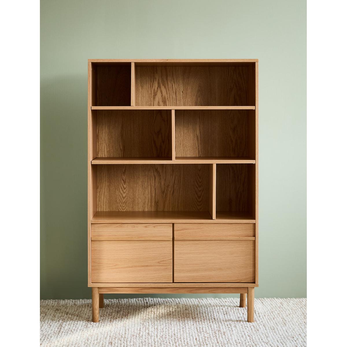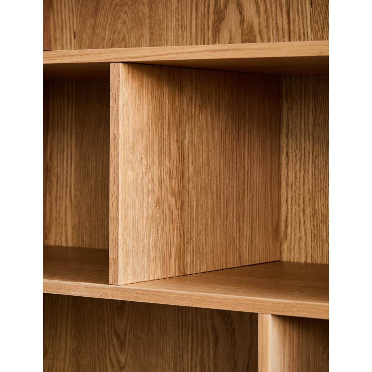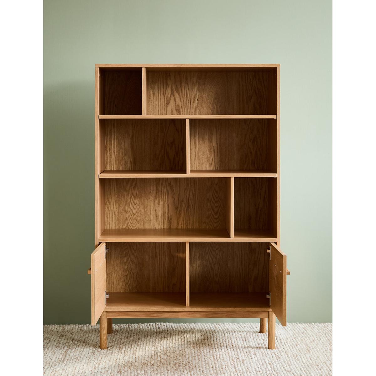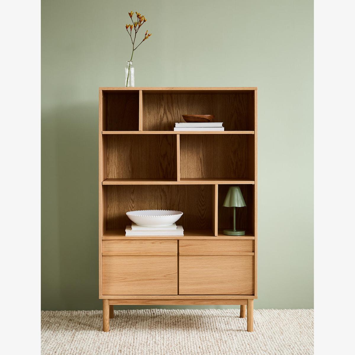 A solidly built and minimally styled bookcase with a clever adjustable shelf divide system. Made from a gorgeous pale oak, this bookcase can be used for a multitude of storage needs: from plates and glasses to books and vases. 2 generous lower cupboards give you a spot to hide away anything that's not worthy of the Tana. Requires self assembly - instructions within Shelves weight capacity 10kg