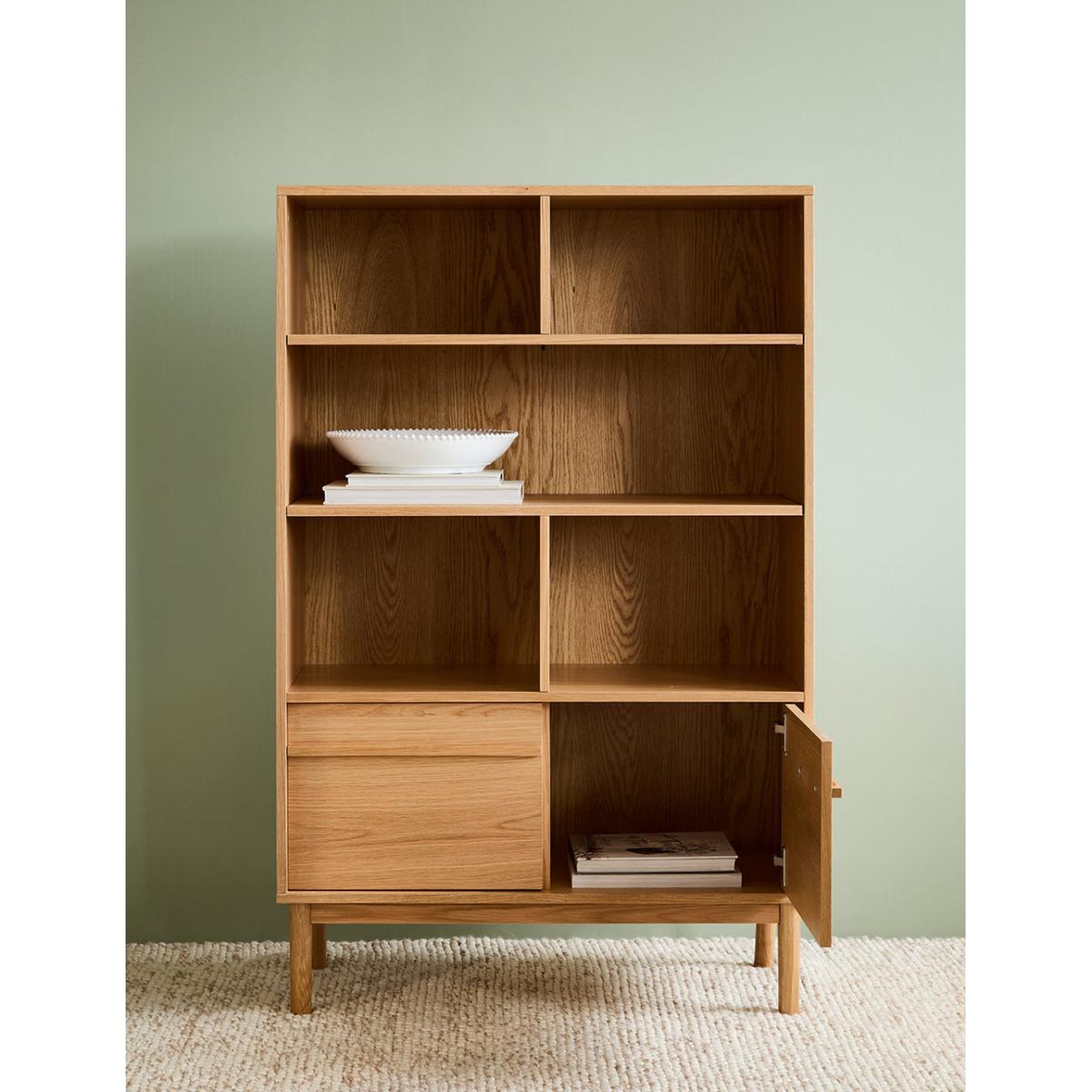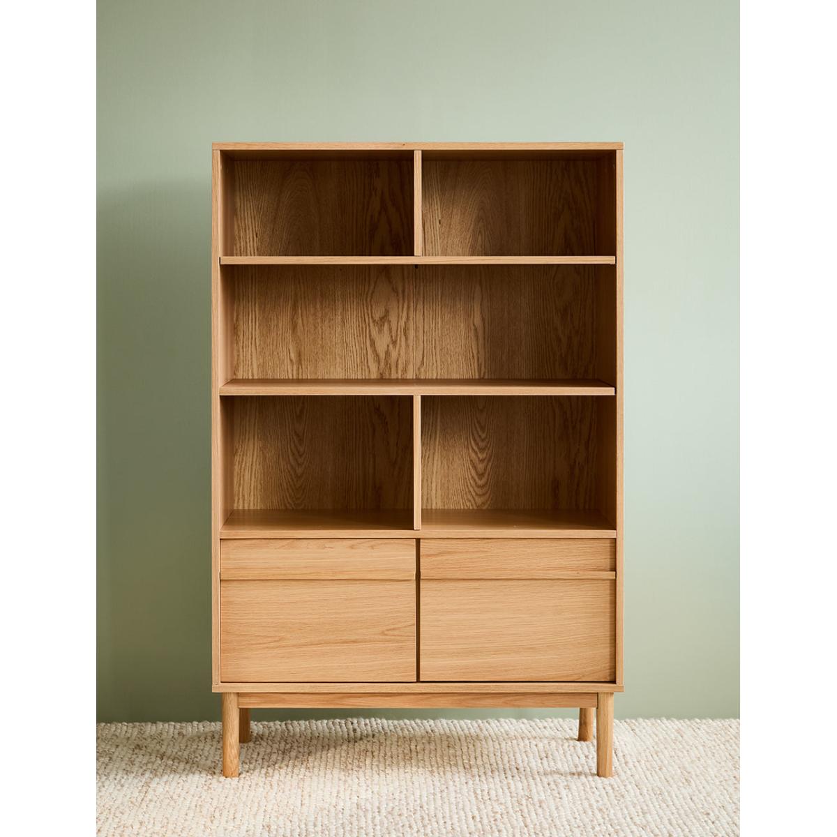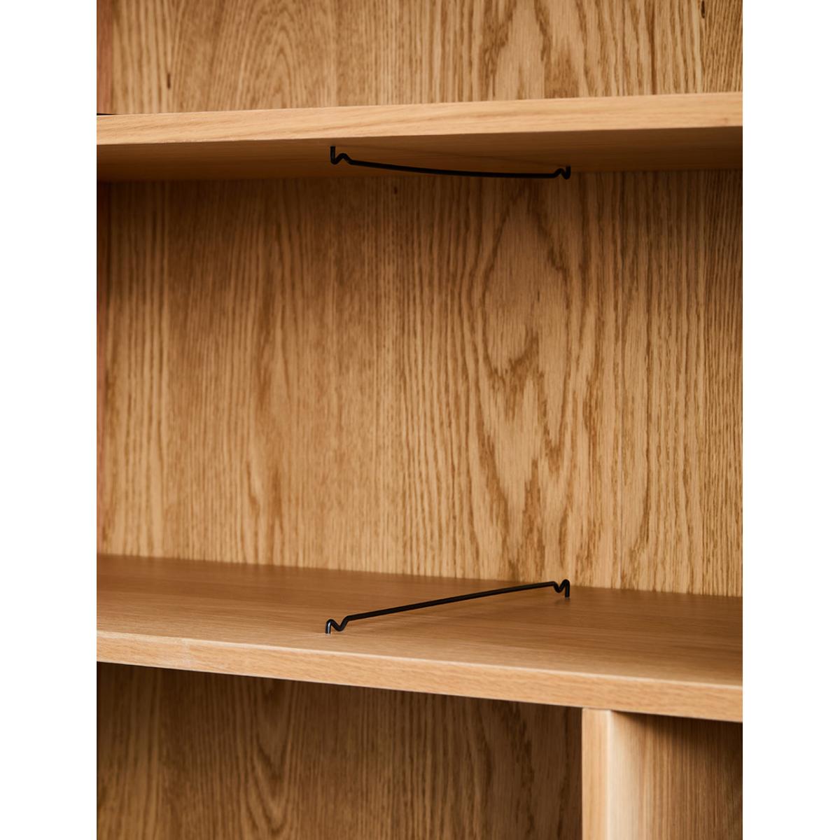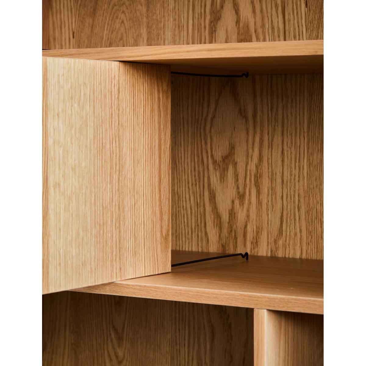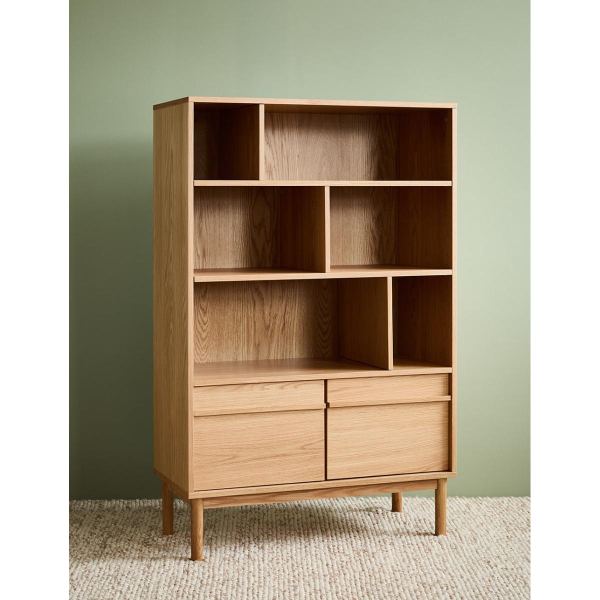 A solidly built and minimally styled bookcase with a clever adjustable shelf divide system. Made from a gorgeous pale oak, this bookcase can be used for a multitude of storage needs: from plates and glasses to books and vases. 2 generous lower cupboards give you a spot to hide away anything that's not worthy of the Tana. Requires self assembly - instructions within Shelves weight capacity 10kg