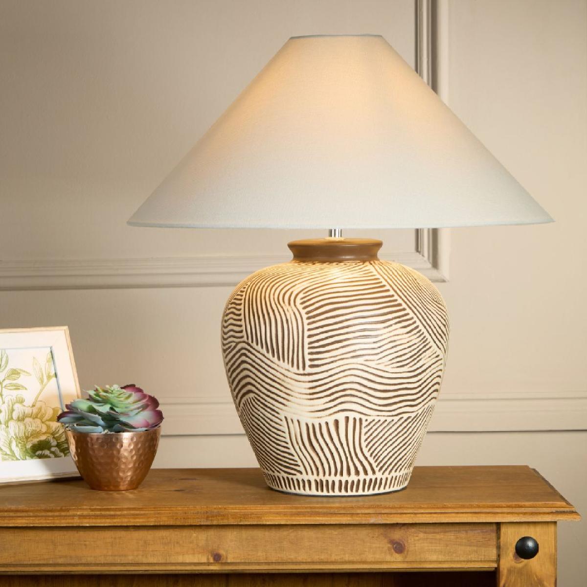 Tangier 1-light table lamp, featuring a black and white patterned ceramic base and a cream, oversized tapered shade. The Tangier table lamp is a beautifully crafted piece that blends organic artistry with timeless elegance. Featuring a striking black and white ceramic base, engraved with an intricate, nature-inspired pattern, this lamp brings a sense of texture and depth to any space. The cream tapered shade complements the bold design, offering a soft, warm glow that enhances the ambience of your room. Perfect for adding a statement touch to bedside tables, console units or living room side tables, the Tangier table lamp is both stylish and versatile. Its monochromatic palette allows it to blend seamlessly into a variety of interior styles, from contemporary to bohemian-inspired settings. Tangier 1-light table lamp, featuring a black and white patterned ceramic base and a cream, oversized tapered shade. The Tangier table lamp is a beautifully crafted piece that blends organic artistry with timeless elegance. Featuring a striking black and white ceramic base, engraved with an intricate, nature-inspired pattern, this lamp brings a sense of texture and depth to any space. The cream tapered shade complements the bold design, offering a soft, warm glow that enhances the ambience of your room. Perfect for adding a statement touch to bedside tables, console units or living room side tables, the Tangier table lamp is both stylish and versatile. Its monochromatic palette allows it to blend seamlessly into a variety of interior styles, from contemporary to bohemian-inspired settings.