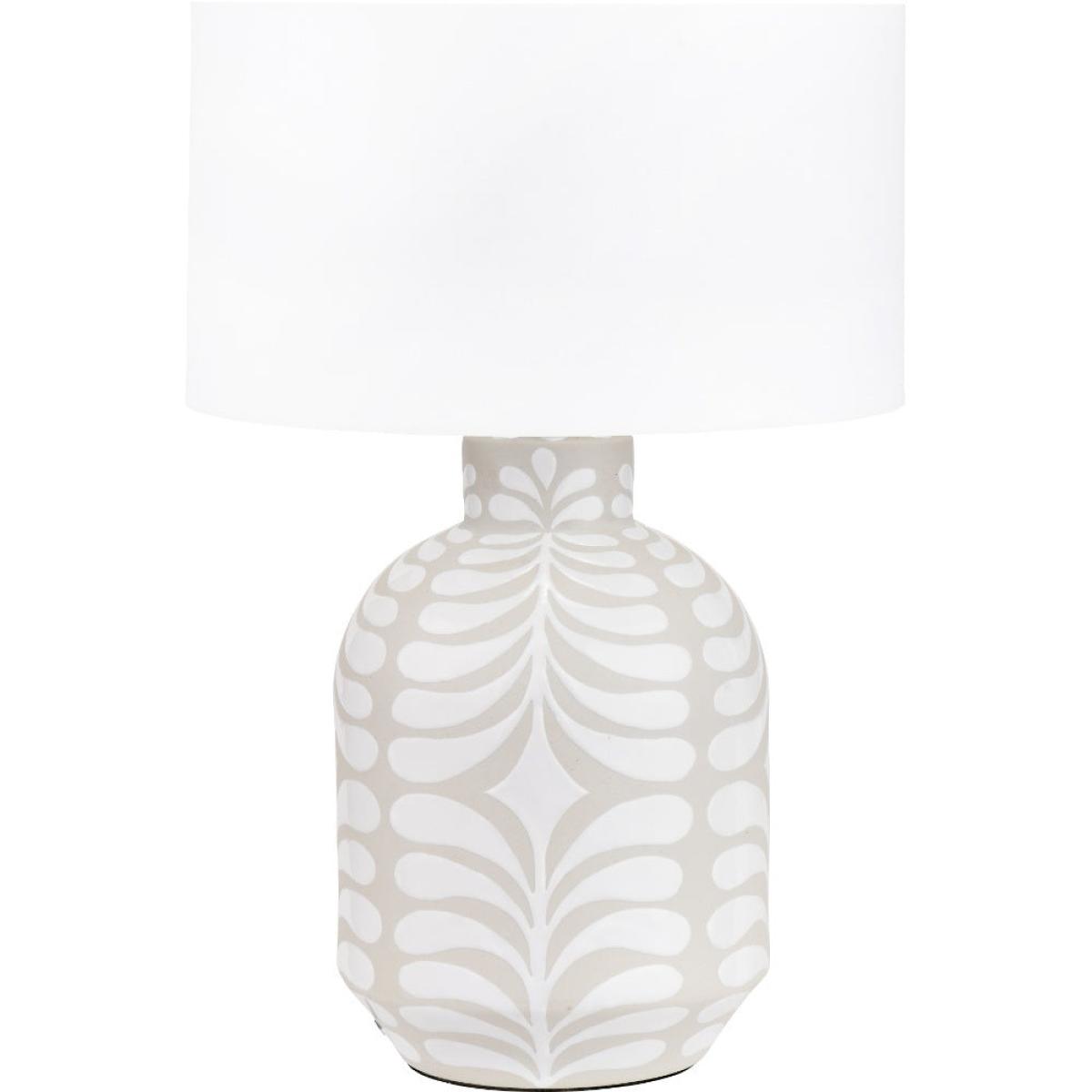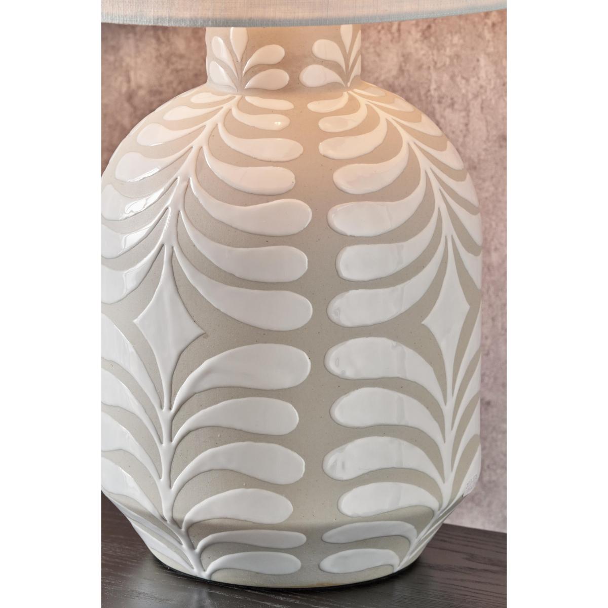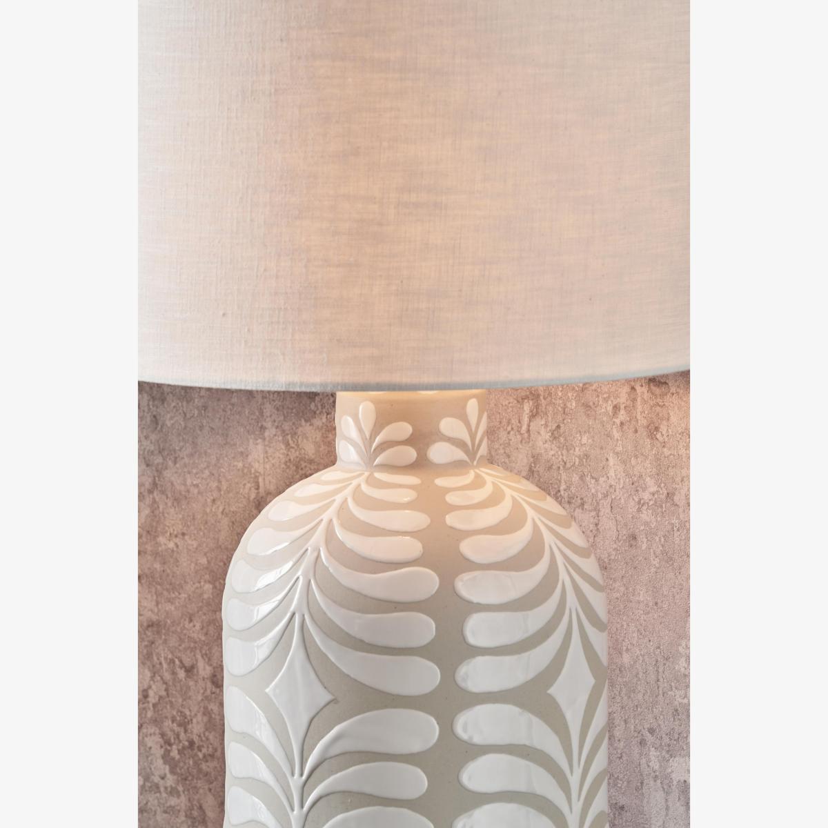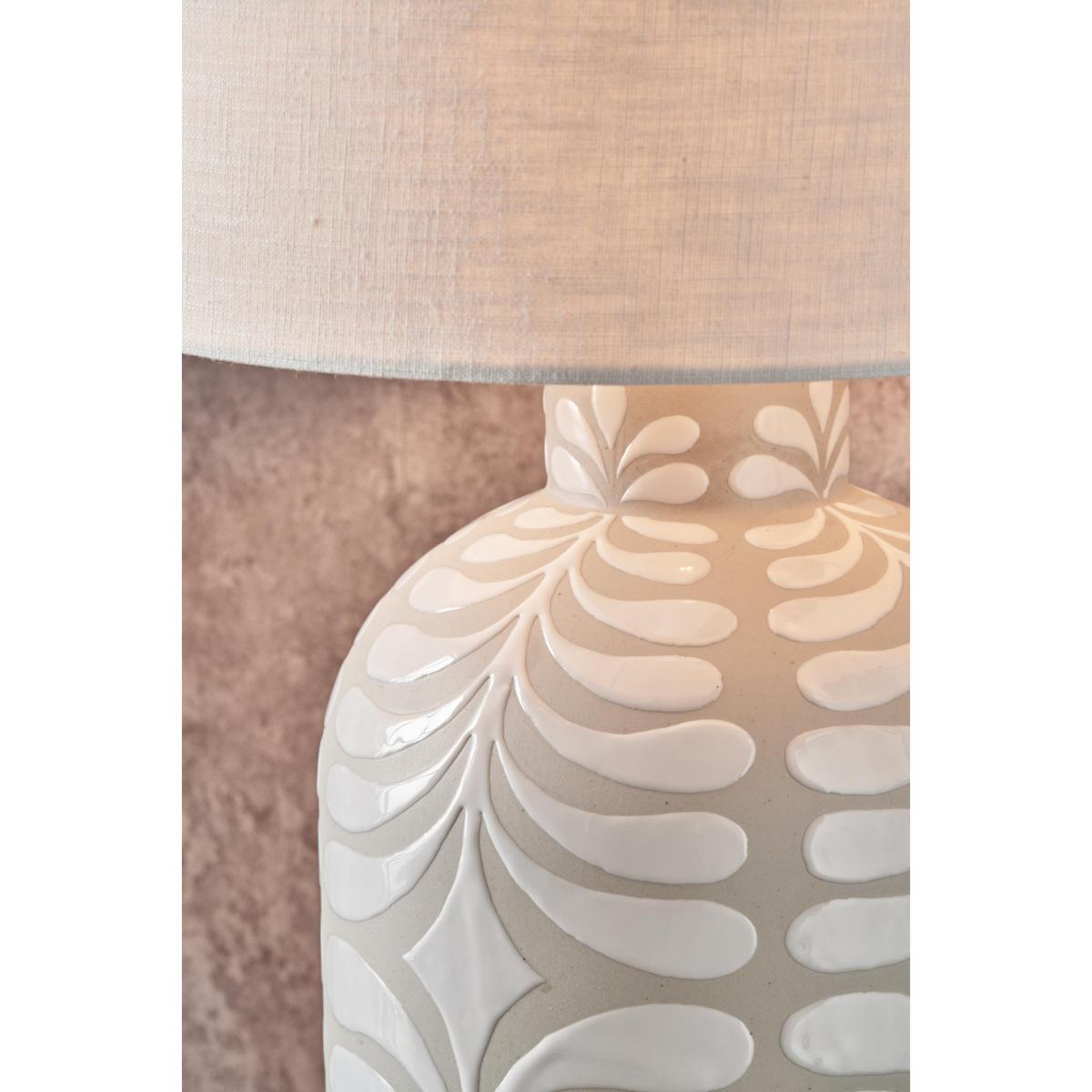 Effortlessly stylish and designed with a timeless pattern, in soft grey and white, this table lamp base exudes elegance and sophistication. The neutral colour palette and the melange of both matt and glazed ceramic, is a winning combination, adding a light and airy touch to your interior. Perfectly completed with a modern white cylinder linen shade that is self-lined with an open weave material. Lamp Base Dimensions: H40xW22xD2. 2 cm Shade Dimensions: H23xW35xD3. 5 cm Requires 1x 10-12W LED ES27 lightbulb