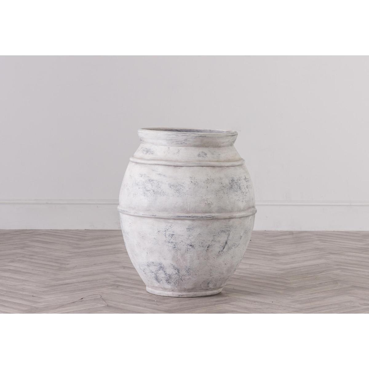 A large whitewashed Urn forms the basis of the Tanner Large Floor Standing Pot, with accented weathered patches of Grey showing through. With full stone construction and ridged detailing, this pot is sturdy and practical. A classic.
