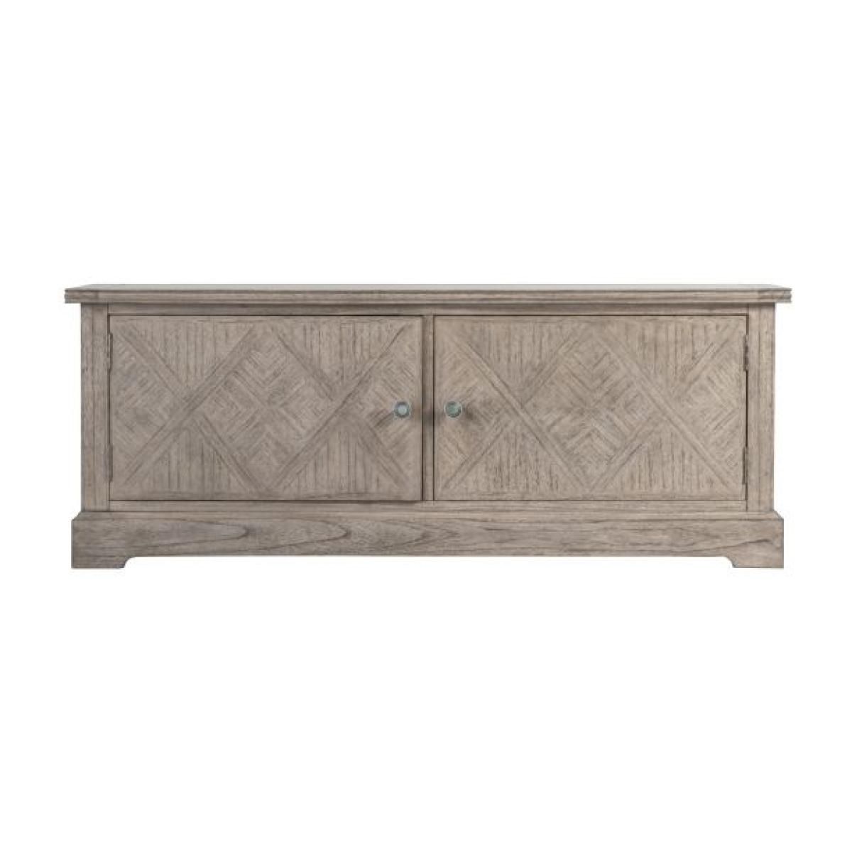 The Tansy Collection offers a wide range of living, dining and bedroom furniture pieces, crafted from Mindy wood with a stunning inlaid parquet-style design. The lightly brushed finish recreates the natural ageing effect. With its classy design and subtle finish, it offers versatile style that would suit a wide range of interiors. The Tansy 2 Door Media Unit offers a practical storage solution, and is ideal as a media unit or for general use. The doors and top feature the signature Tansy parquet-style design. Material: Mahogany. Colour/Finish: Natural.