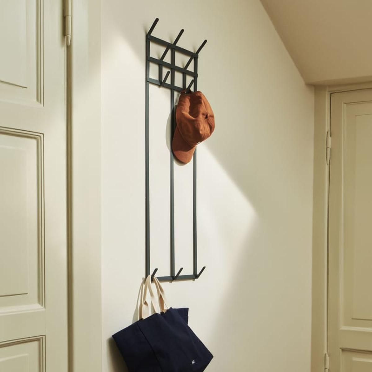 Swiss studio BIG-GAME offers a minimalist, graphic Wall coat rack. The Tape Coat stand is made of folded steel bars that form a grid.