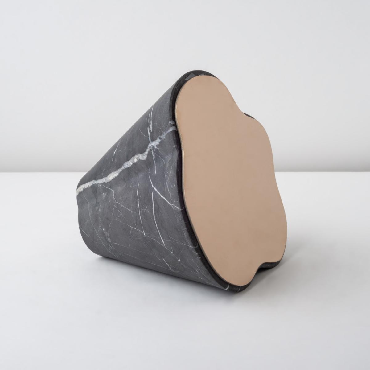 An irregularly shaped mirror with stainless steel that extends into a voluminous piece of solid marble following the same silhouette.