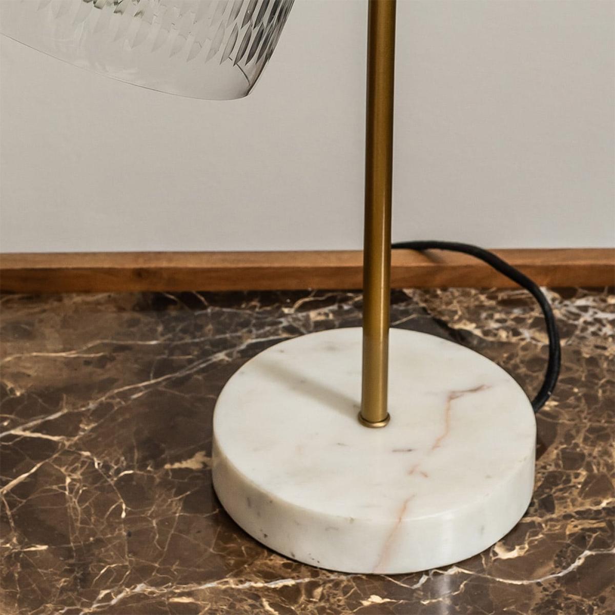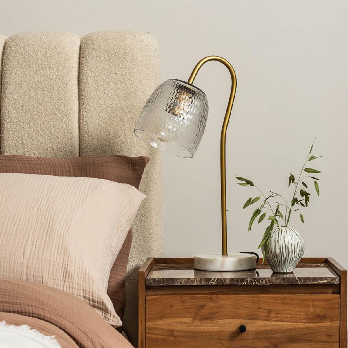 I’m a fan of the Tara lamp for its balanced mix of materials - the brass arch, fluted glass shade and marble base give it a smart, lived-in feel. It works equally well in mid-century, Scandi or contemporary schemes, especially when paired with warm woods and soft neutrals. Styling tip: place it on a minimal bedside table or console and let its patterned glow play off textured fabrics or a simple stack of books. Keep neighbouring accessories low-profile - a small vase of greenery or a ceramic dish ensures the lamp remains the focal point.