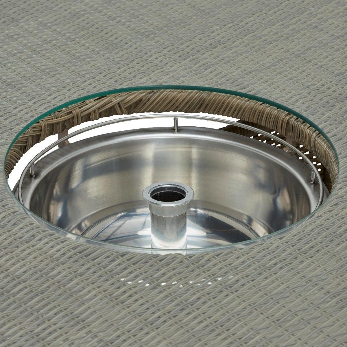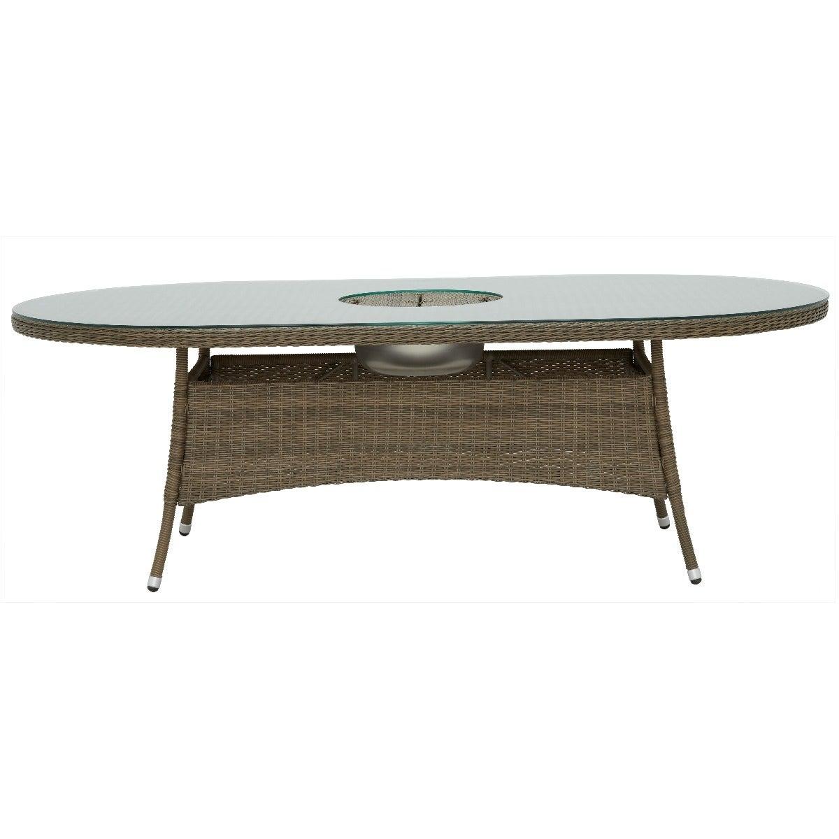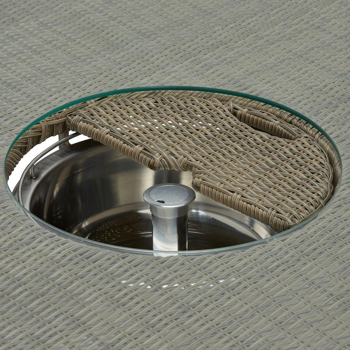 Design. Dine al fresco and in style with the luxurious Taransay 8 Seat Oval Ice Bucket Dining Set with Venice Chairs and Lazy Susan. Made from a powder-coated. Aluminium. And weave frame, it’s highly durable and will last all year round. The. Elegant oval table is topped with toughed glass and complete with an ice bucket compartment and extra addition of a lazy susan, creating a glamorous setting, perfect for impressing your guests. T. He beautiful Venice chairs are finished with soft, comfortable cushions allowing you to relax in the sun and take in the glorious surroundings.