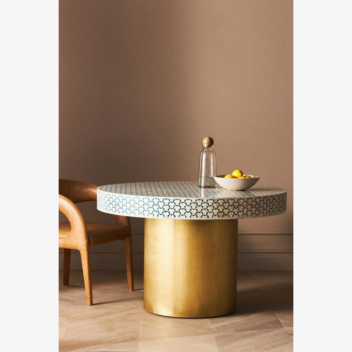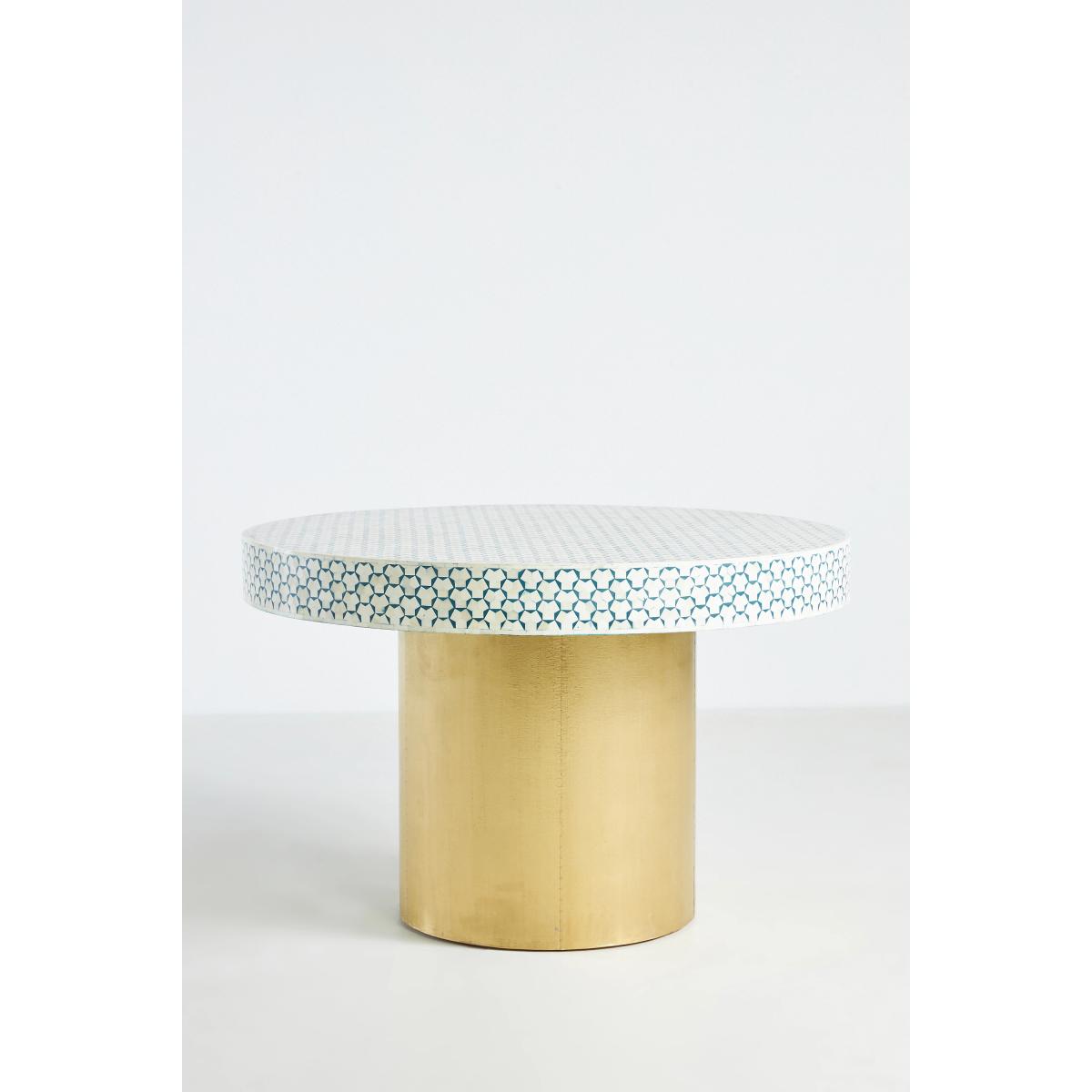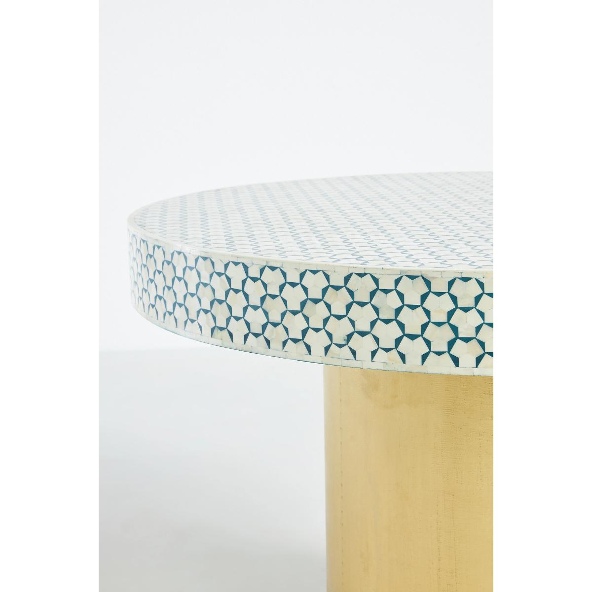 Since the days of ancient Egypt, craftsmen have been using inlaid bone to decorate furniture surfaces, and for good reason: it embodies a natural sheen that adds instant luxury to any space. Handcrafted using the same centuries-old technique, this room-anchoring piece captures the essence of Moroccan tilework with a reiterative bone inlay design atop a brass base. * Because this furniture is crafted by hand, no two pieces are exactly alike. Please expect unique variations in colour, natural texture, and pattern (including woodgrain) from the imagery shown. * Tropical hardwood reinforced with engineered hardwood * Bone inlay tabletop * Brass-finished base * Table is sealed with clear wax for easy cleaning; it protects against moisture, but should be maintained * Dust with a damp, clean cloth * If spills occur, blot promptly with clean cloth * Avoid using chemical cleaners and solvents * Levelers are included * This piece is intended for indoor use * Furniture pieces weighing over 30kg will be delivered to your room of choice and all packaging will be removed * No assembly required * Imported