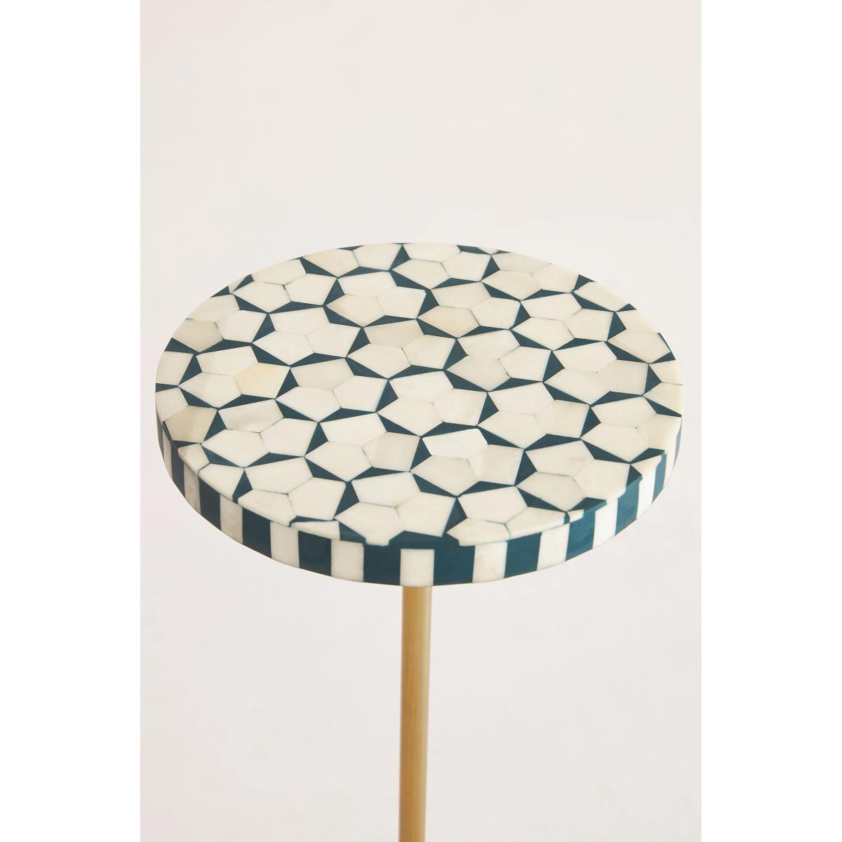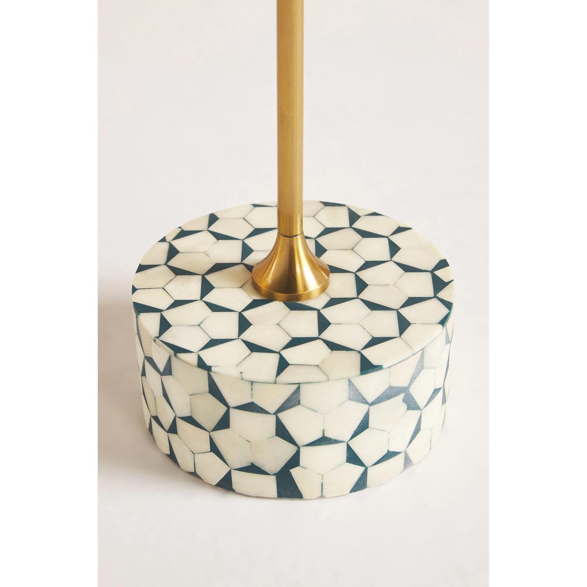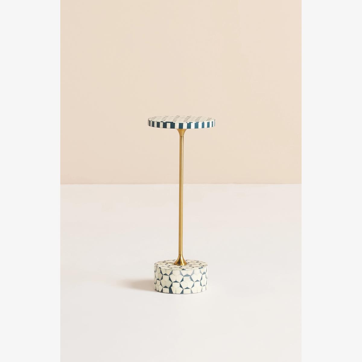 Featuring intricately patterned bone inlay, this end table marries a circular top with a cylindrical base. Position it beside the sofa in your living room or your favourite armchair as a sophisticated perch for homemade cocktails and tasty mixed drinks. * Handcrafted bone inlay and resin end table featuring a brushed brass iron pedestal * Due to the handcrafted nature of this item, expect slight variation in the color of each unique piece * Furniture pieces weighing over 30kg include delivery to your room of choice and packaging removal * Sealed with clear lacquer for protection * Wipe clean with soft cloth. Avoid using chemical cleaners * This piece is intended for indoor use * No assembly required * Imported