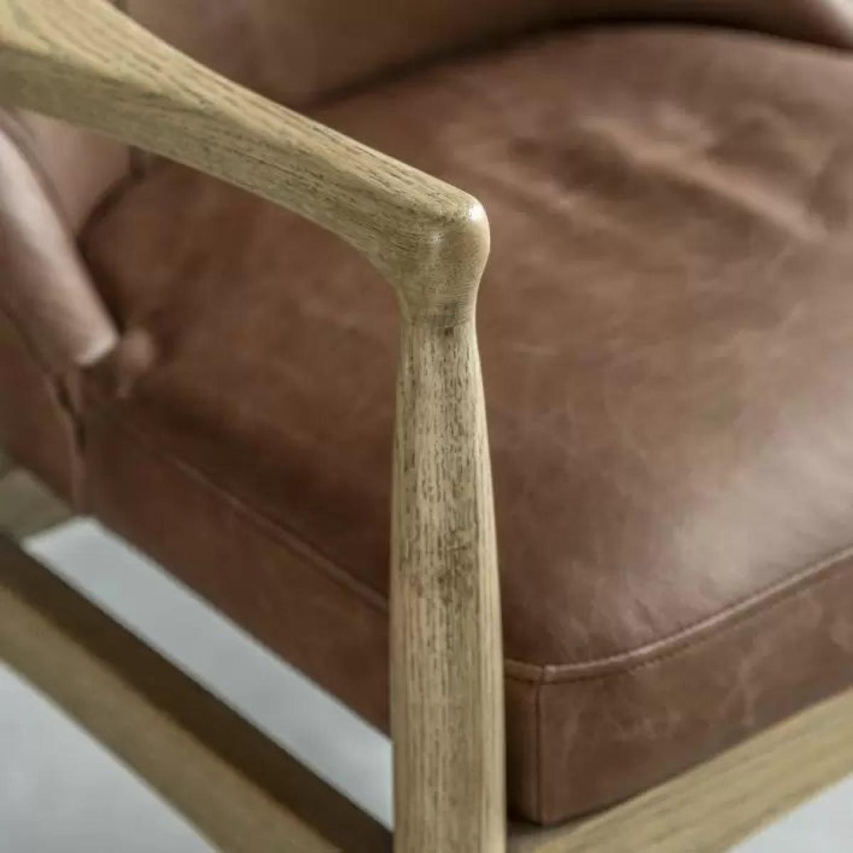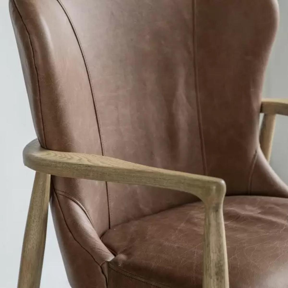 Add a retro touch to a room with this beautiful armchair. The seat and back are fully upholstered in vintage style brown leather, which pairs perfectly with the elegant wooden frame.