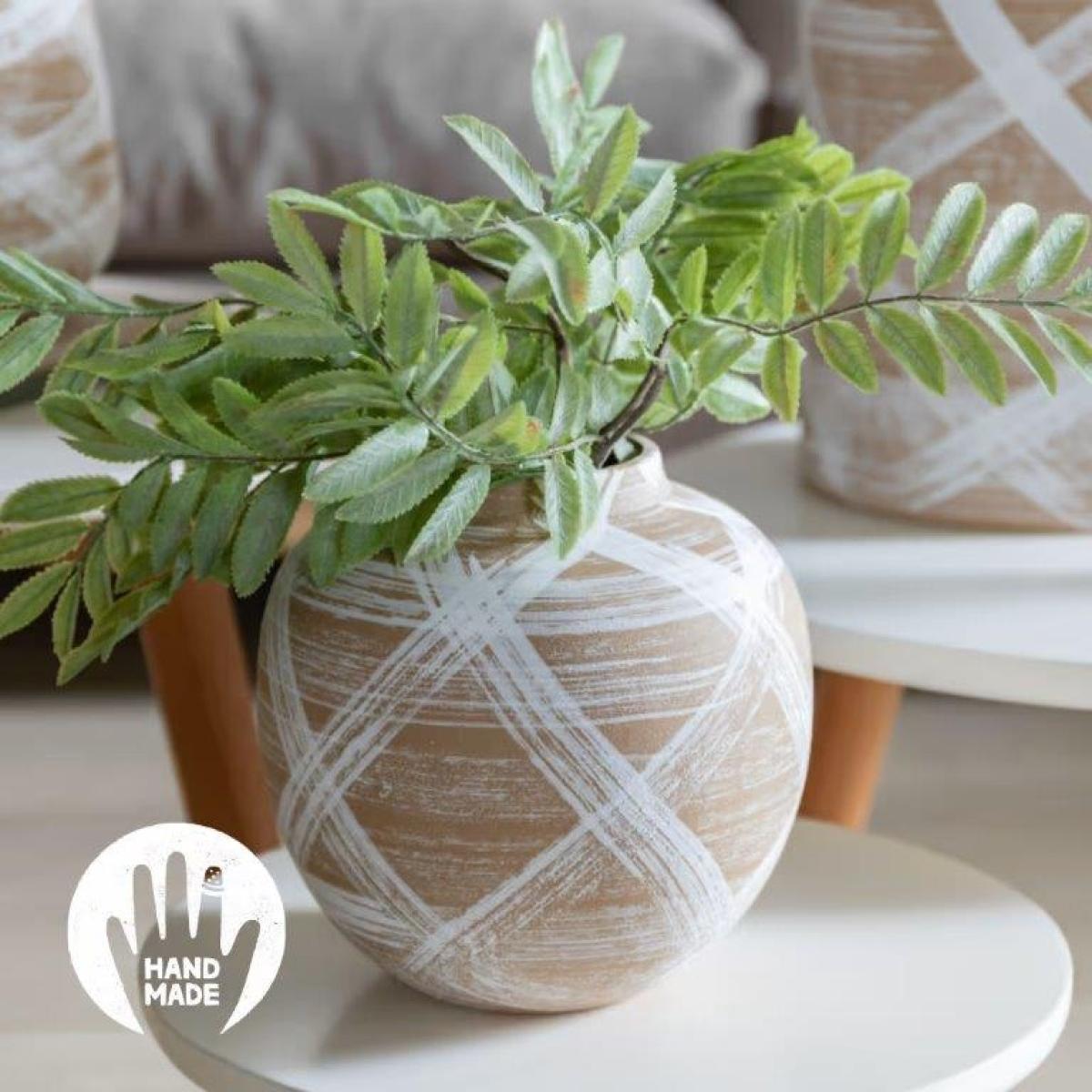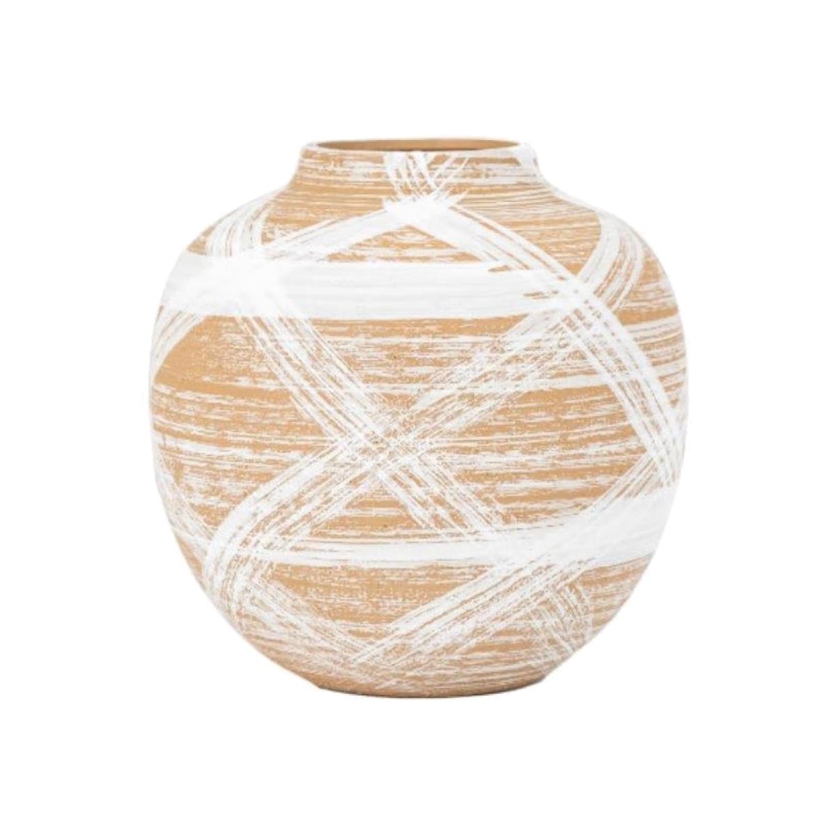 With a hand painted brushstroke style white glaze, this Tarka Reactive Small Vase in Brown/White is handmade and truly unique, it's sure to bring a little rustic charm to any space. Matching pieces also available. Indoor Use Only Dimensions: (H)18.5cm x (W)18.5cm x (D)18.5cm Colour - Brown/White Material - Stoneware Please note: Lifestyle images are for illustrative purposes