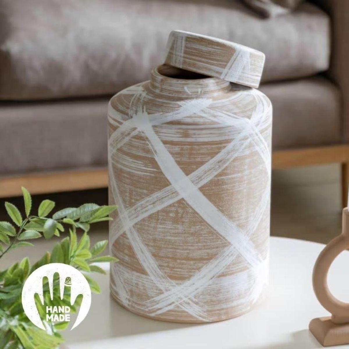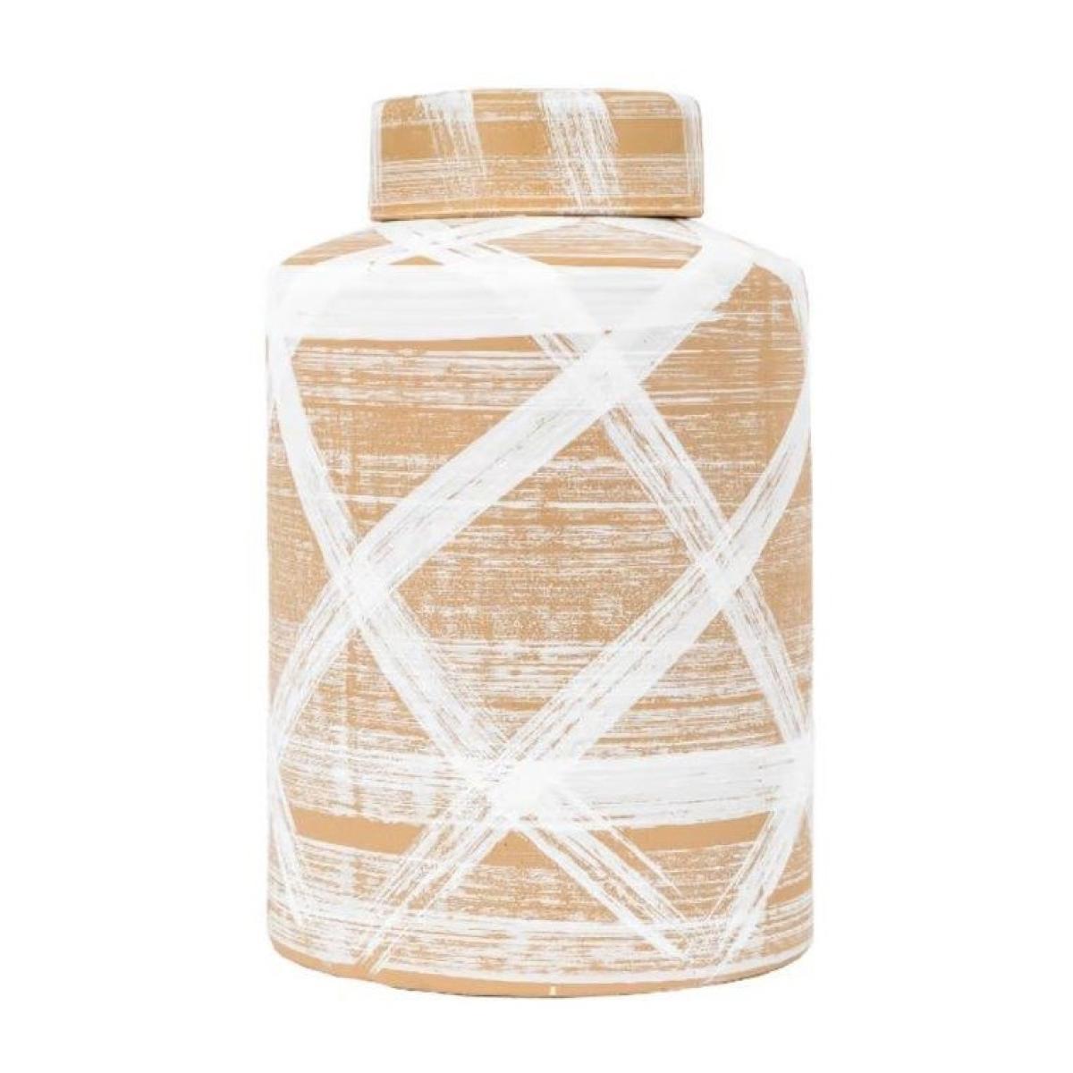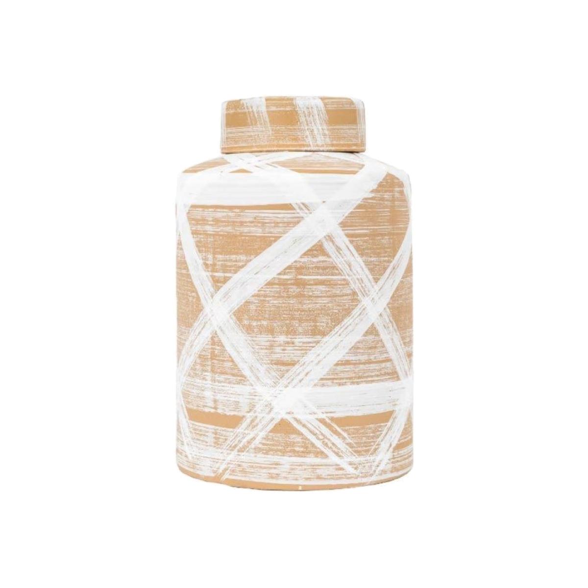 Perfect for storage anywhere in the home, this handmade Tarka Reactive Jar is a cylindrical lidded jar featuring a stunning white and brown reactive glaze with a hand painted brushstroke look, making each piece truly unique. Matching vases also available Indoor Use Only Dimensions: (H)33cm x (W)21.5cm x (D)21.5cm Colour - Brown/White Material - Stoneware Please note: Lifestyle images are for illustrative purposes