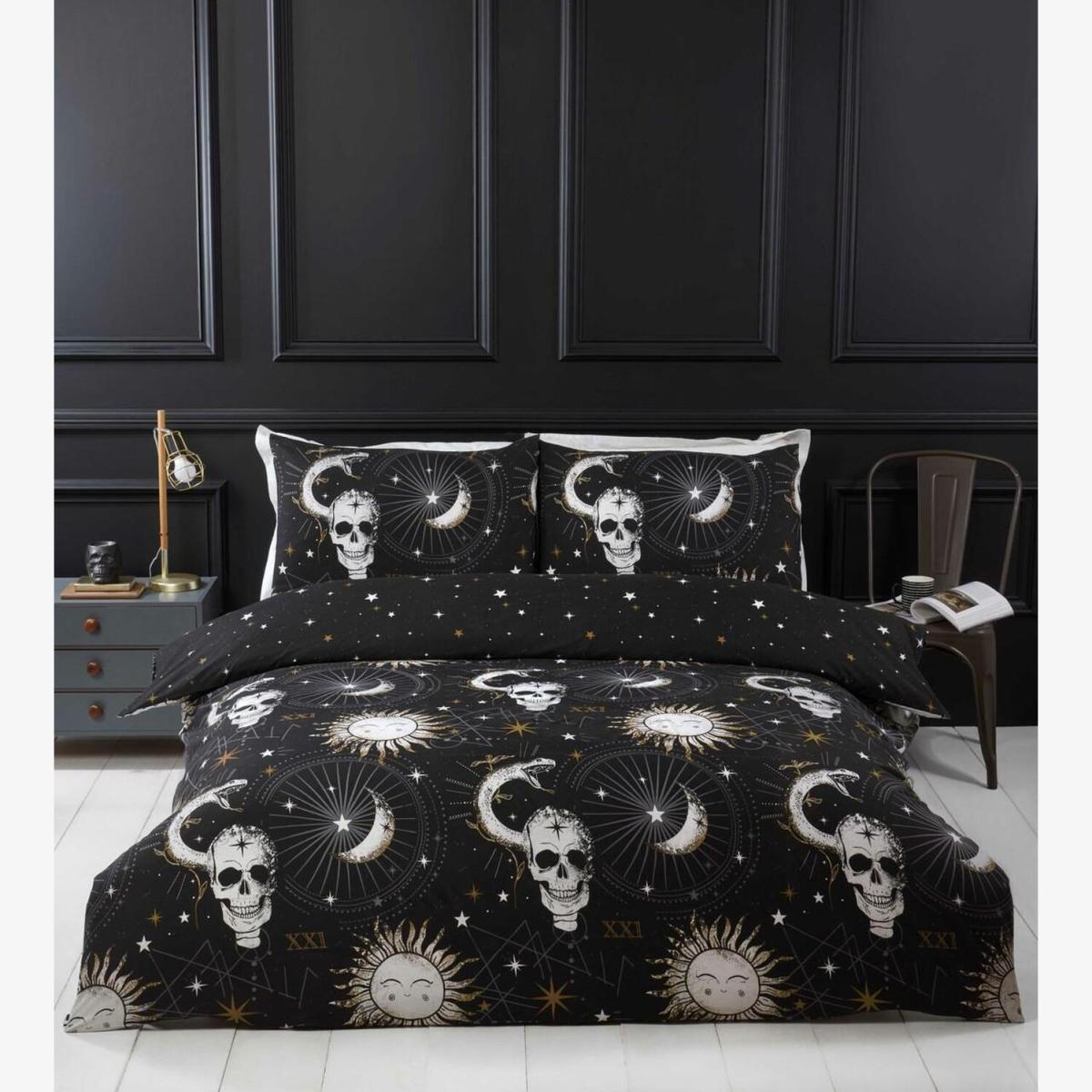This duvet cover set is a bold choice that works particularly well in interiors with dark, moody palettes or eclectic, alternative styles. I love how its tarot skull motif adds an edgy, mystical vibe that can serve as a statement piece in a bedroom. To style it effectively, consider pairing it with plain black or grey bedding for a layered, sophisticated look, and add metallic or velvet accents in accessories to enhance its otherworldly appeal. It's perfect for creating a themed space or for those who miss the dark romance of gothic decor. Practical tips include keeping the rest of the room fairly minimal to let the duvet set take centre stage, and incorporating complementary accessories like decorative candles or vintage-inspired jewellery holders to build on its mystical aesthetic.