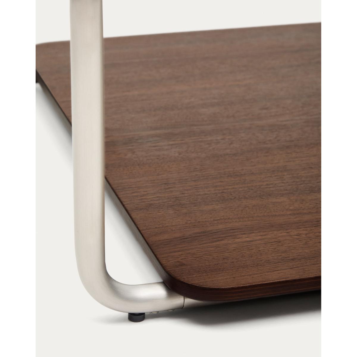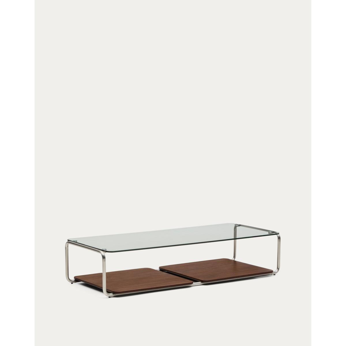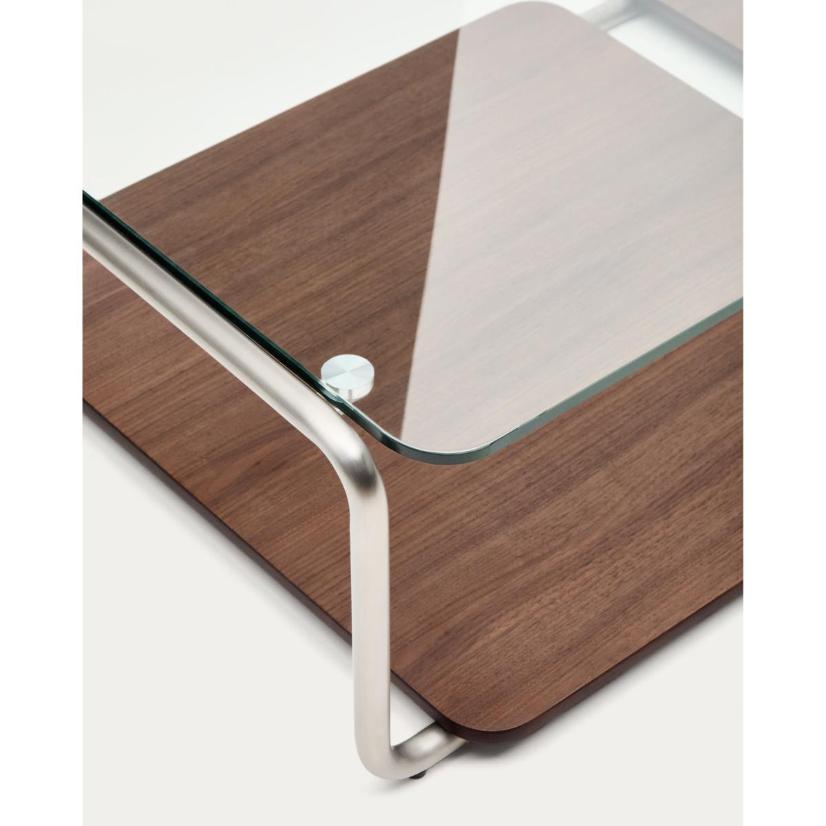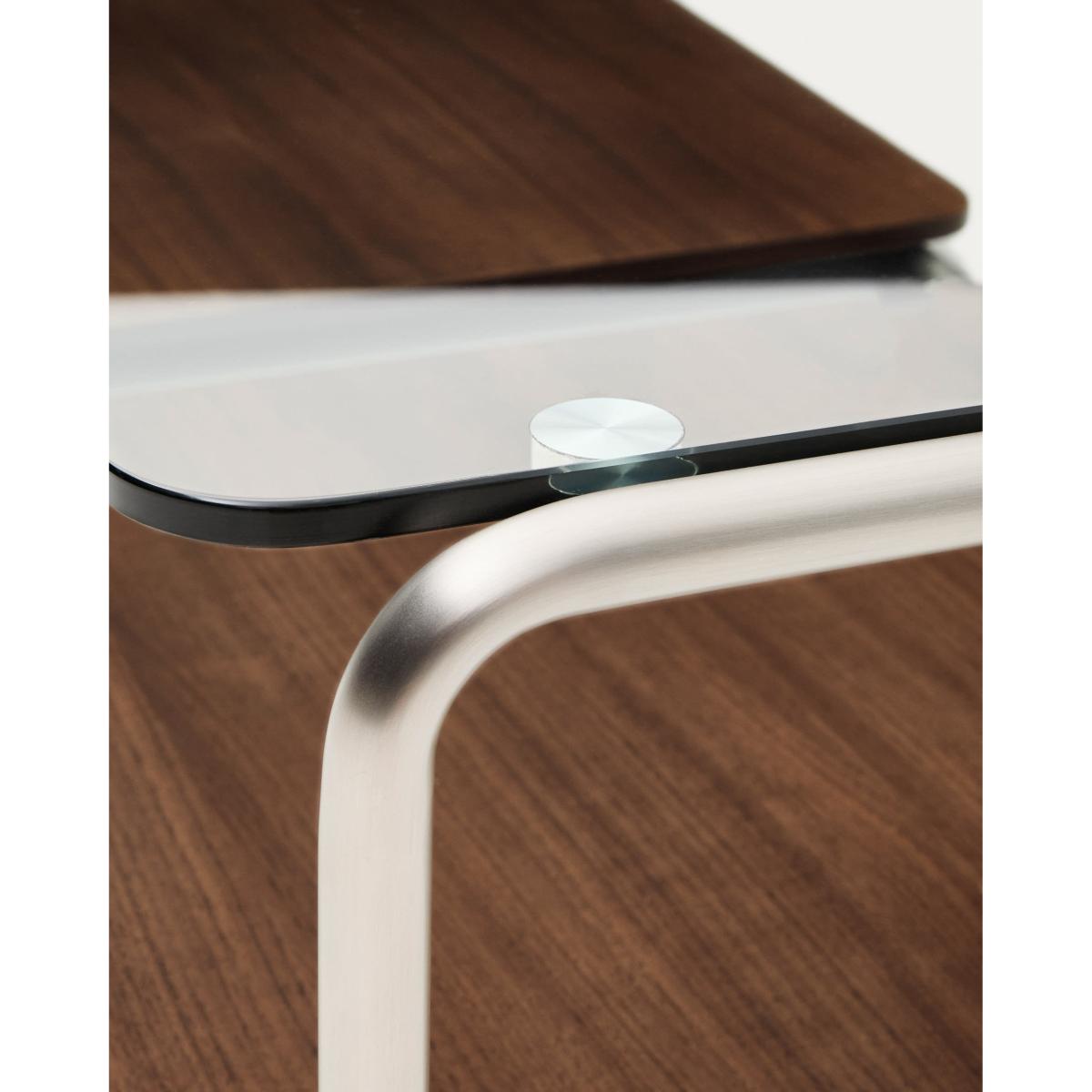 Tarsel reinterprets mid-century elegance with a contemporary approach that perfectly balances functionality and visual sophistication. Its tempered glass top adds lightness, allowing the brushed-effect tubular stainless steel structure to stand out as a modern and refined touch. The contrast with the 0.6mm dark-finished walnut veneer trays reinforces the richness of the materials in the collection, adding depth and warmth to any space. This table stands out for the versatility of its trays, which can be moved smoothly over the base or used independently, either on the table itself or on other surfaces. This adaptability makes the table a dynamic piece, capable of adapting to the needs and moments of everyday life. The wood used is FSC™ 100% chain of custody certified and has a responsible forest management model, guaranteed origin and traceability in every detail. It can be combined with the side table from the collection to form a set of nesting tables, expanding the possibilities of use and adapting to different lifestyles and living room configurations. Designed for everyday use, it includes adjusters in the base to bridge any unevenness in the floor, ensuring stability and comfort in any environment.