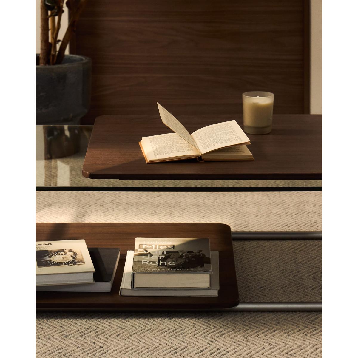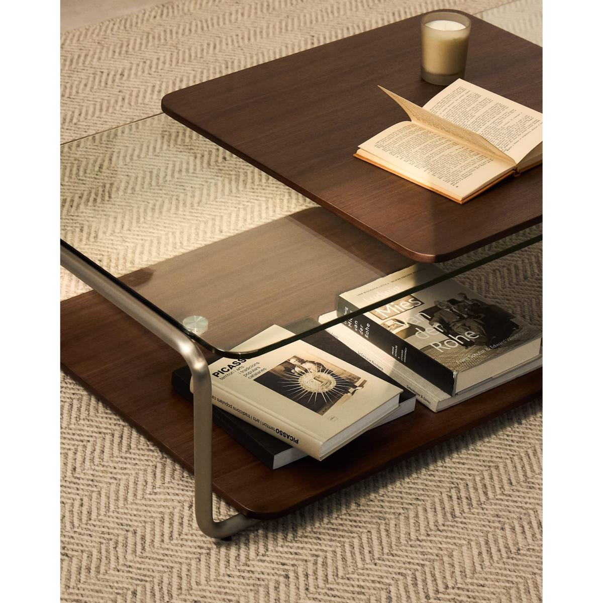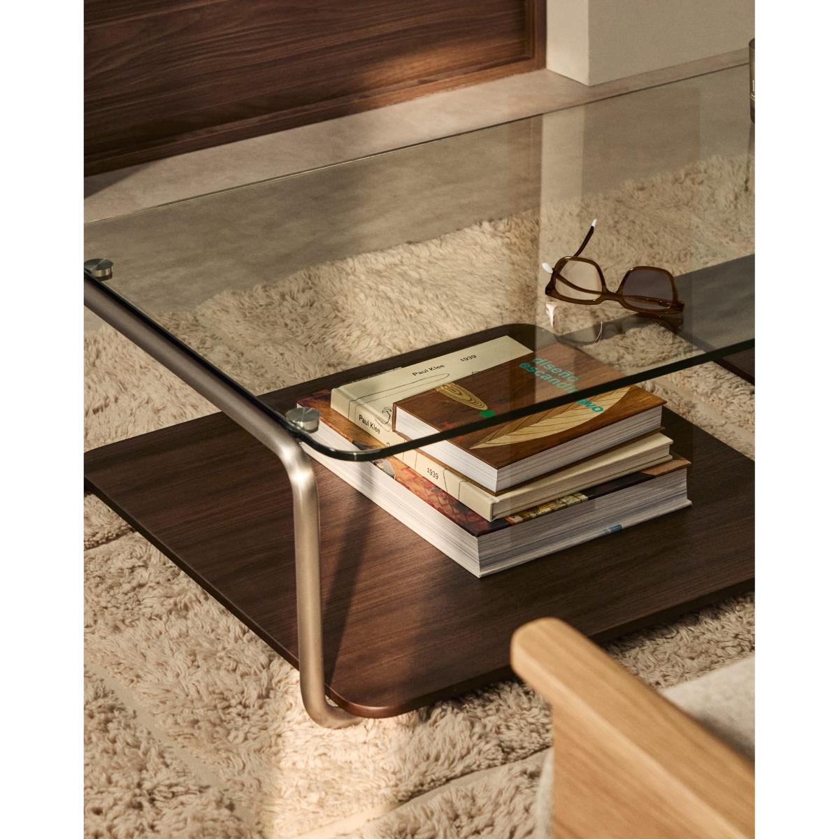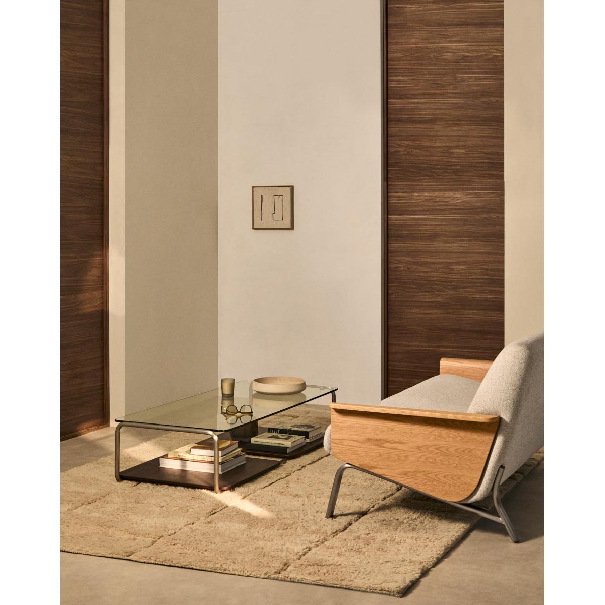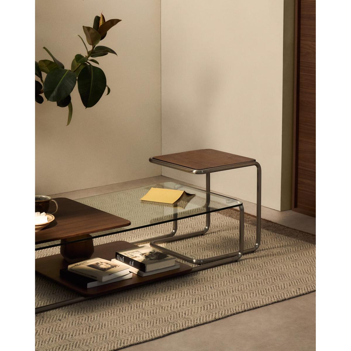 Tarsel reinterprets mid-century elegance with a contemporary approach that perfectly balances functionality and visual sophistication. Its tempered glass top adds lightness, allowing the brushed-effect tubular stainless steel structure to stand out as a modern and refined touch. The contrast with the 0.6mm dark-finished walnut veneer trays reinforces the richness of the materials in the collection, adding depth and warmth to any space. This table stands out for the versatility of its trays, which can be moved smoothly over the base or used independently, either on the table itself or on other surfaces. This adaptability makes the table a dynamic piece, capable of adapting to the needs and moments of everyday life. The wood used is FSC™ 100% chain of custody certified and has a responsible forest management model, guaranteed origin and traceability in every detail. It can be combined with the side table from the collection to form a set of nesting tables, expanding the possibilities of use and adapting to different lifestyles and living room configurations. Designed for everyday use, it includes adjusters in the base to bridge any unevenness in the floor, ensuring stability and comfort in any environment.
