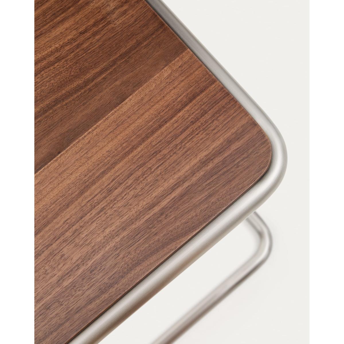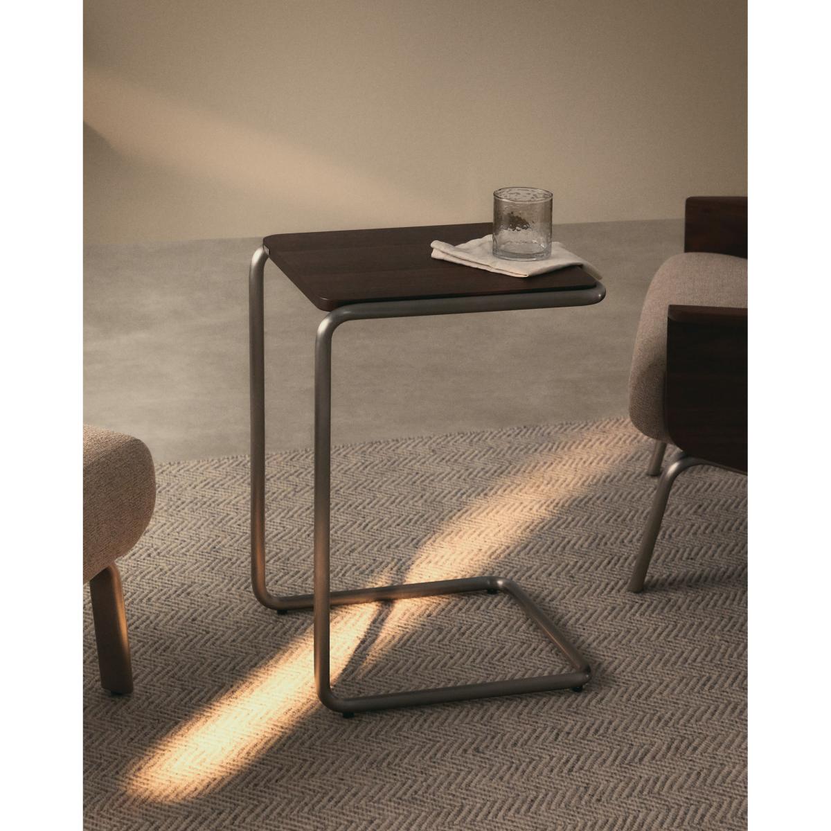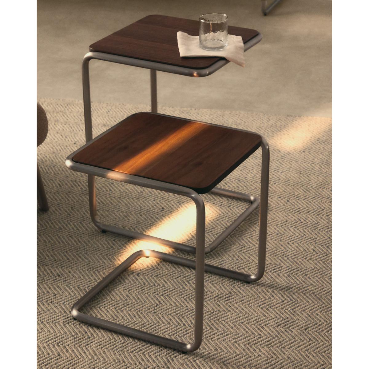 Tarsel reinterprets mid-century elegance with a contemporary approach that perfectly balances functionality and visual sophistication. Its 0.6mm walnut veneer top with a dark finish contrasts with the brushed-effect tubular stainless steel structure, allowing it to stand out as a modern and refined nod to the modern world. The wood used is FSC™ 100% chain of custody certified and has a responsible forest management model, guaranteed origin and traceability in every detail. It can be combined with the coffee table from the collection to form a set of nesting tables, expanding the possibilities of use and adapting to different lifestyles and living room configurations. Designed for everyday use, it includes adjusters in the base to bridge any unevenness in the floor, ensuring stability and comfort in any environment.