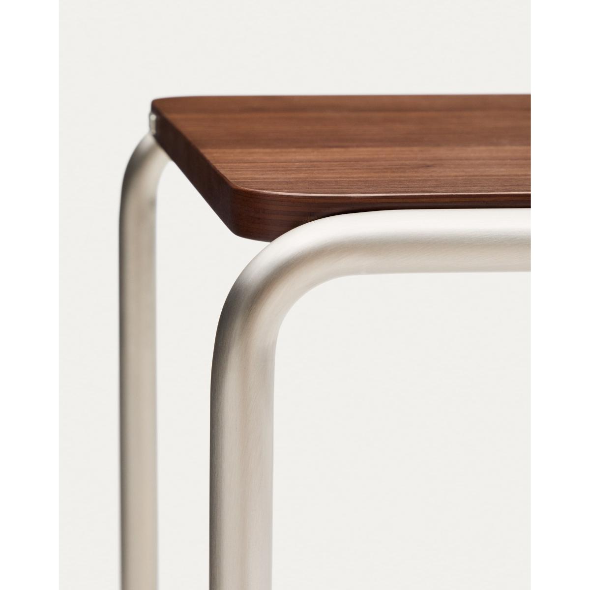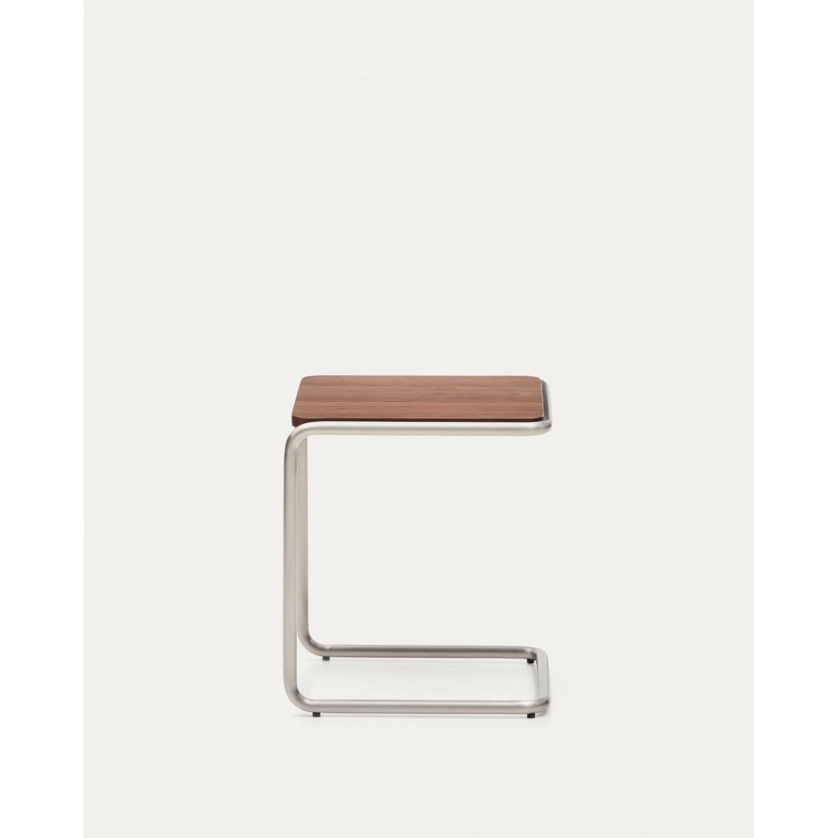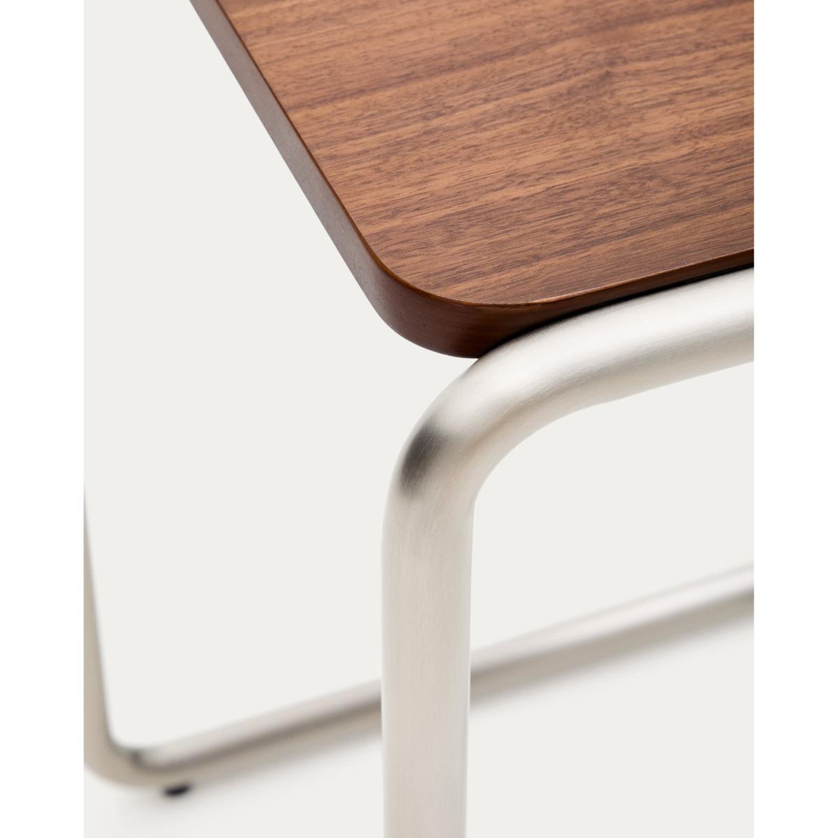 Tarsel reinterprets mid-century elegance with a contemporary approach that perfectly balances functionality and visual sophistication. Its 0.6mm walnut veneer top with a dark finish contrasts with the brushed-effect tubular stainless steel structure, allowing it to stand out as a modern and refined nod to the modern world. The wood used is FSC™ 100% chain of custody certified and has a responsible forest management model, guaranteed origin and traceability in every detail. It can be combined with the coffee table from the collection to form a set of nesting tables, expanding the possibilities of use and adapting to different lifestyles and living room configurations. Designed for everyday use, it includes adjusters in the base to bridge any unevenness in the floor, ensuring stability and comfort in any environment.