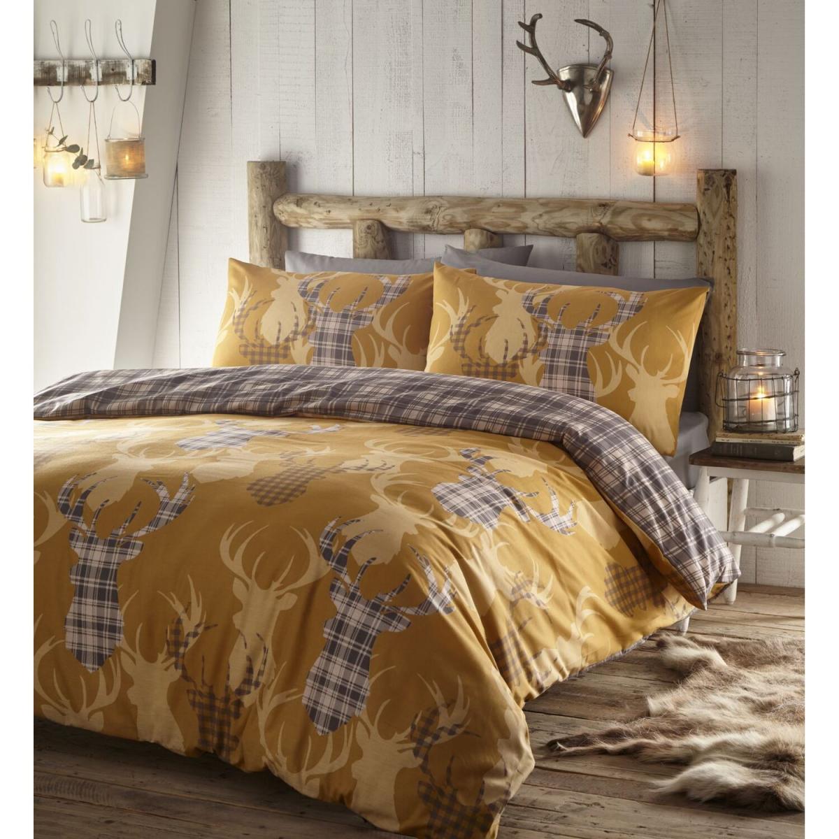 Tartan Stag Print Duvet Cover Set - Mustard / Single