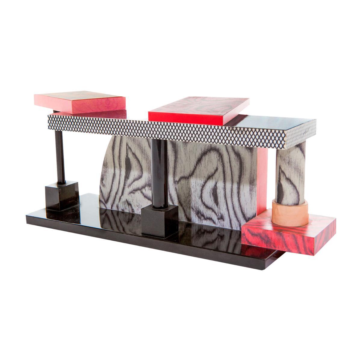 The "Memphis Milano" catalogue includes icons designed by the famous Memphis collective between 1981 and 1988. True works of art, these collector's items revolutionised the creative and commercial logic of design in the 80s. Founded in Milan in 1981 by Ettore Sottsass, the Memphis group brought together international architects and designers such as Michele De Lucchi, Matteo Thun, Martine Bedin, Nathalie Du Pasquier, Shiro Kuramata, George J. Sowden. A true cultural phenomenon, Memphis really shook up the design codes by voluntarily stepping outside of the lines of "good taste" of the time. It was out with the pure, hard functionalism and austerity Bauhaus-style, and in came fantasy with colourful and eccentric creations. The first Memphis collection landed in the design world like a bombshell: a proliferation of exuberant patterns, explosive colours, intrepid asymmetries, geometric shapes stacked up like totems, new use of plastic laminate considered "cheap" until then. Soon, Memphis became THE subversive label of Italian design with its wacky, colourful world inspired by comics, Pop Art, cinema, Kitsch and Art Deco. It was a revolution: design, until then confined to the showrooms, invaded the media and inflamed passion. Considered symbols of Anti-design and New Design, the Memphis creations are above all the manifestation of an unlimited creativity which breaks free of the constraints dictated by industry and the law of the market. Within the confines of design, architecture, art and post-modernism, these exceptional pieces are now sought after by collectors around the world and exhibited in the most prestigious museums. More than 20 years after the end of the movement, the "Memphis Milano" company continues to produce around fifty hand-crafted historical pieces designed by Memphis between 1981 and 1988. These original models are collector's items all bearing the "Memphis" seal, a guarantee of authenticity. In addition, each piece has its own paper certificate of authenticity, itself bearing the "Memphis" seal. Some models bear the designer's signature. The Tartar console table was designed in 1985 by Ettore Sottsass. She presented a motley collection of geometric forms in laminated plastic and reconstituted veneer. The elements are decorated with varied motifs in a diverse range of colours. The Tartar console table, which appeared in the Memphis 1985 collection, reflects an important change in style for the Memphis collective. Barbara Radice, Artistic Director of Memphis, explained: "The 1985 exhibition evokes smoky, urban atmospheres, streets straight from a scene of Blade Runner or adventures from The Terminator, a desperate, post-nuclear hero wandering through burning landscapes amidst the ruins of an imaginary "day after tomorrow" world. It's the technological High Middle Age, a literal No Man's Land: the future, if there is one, needs to be conquered day after day. The absurdity of a world in which there is almost 60 tons of dynamite for each person. Furnishings are no longer optimistic, full of childlike joy or pop, or even irony. It's almost austere, tyrannical, barbaric".