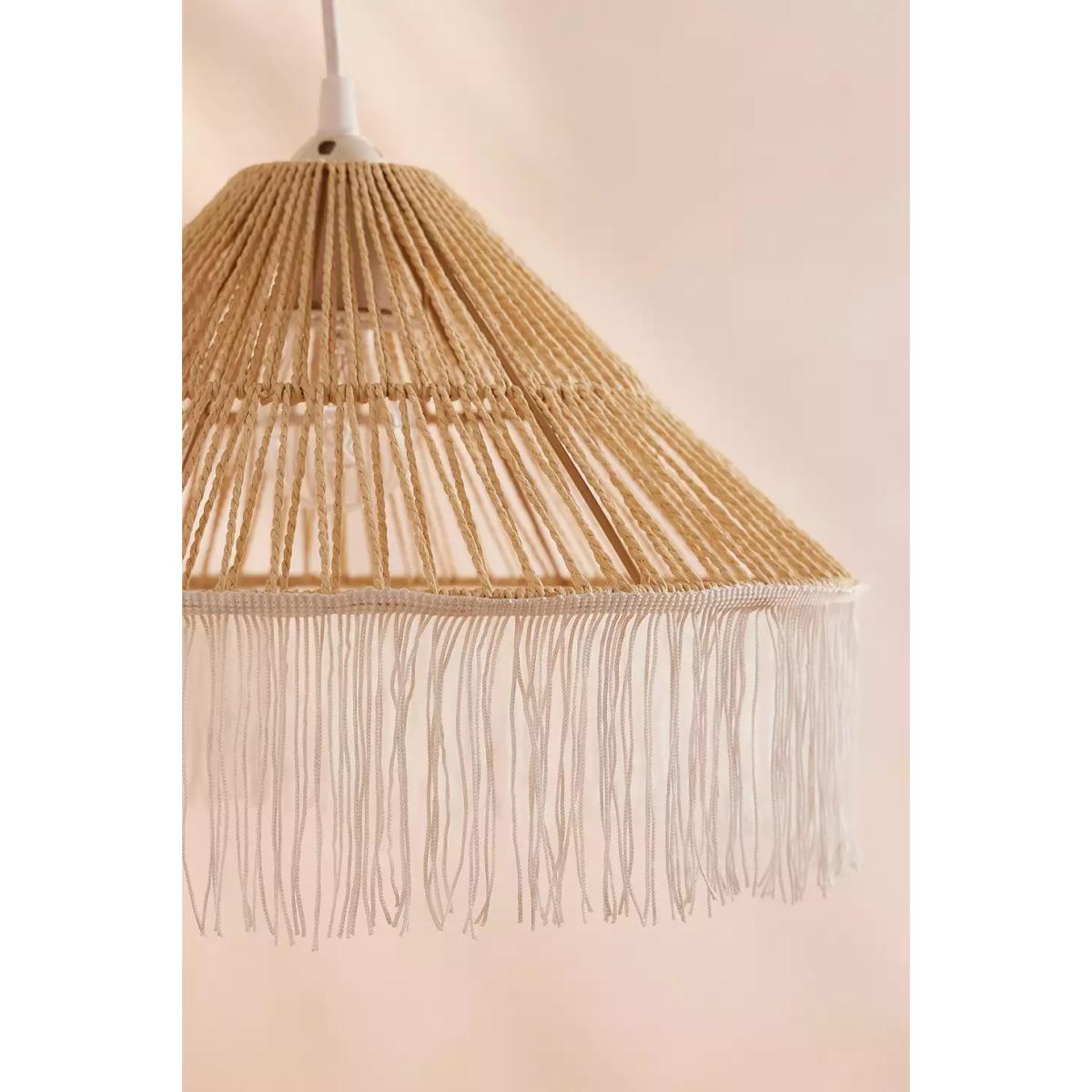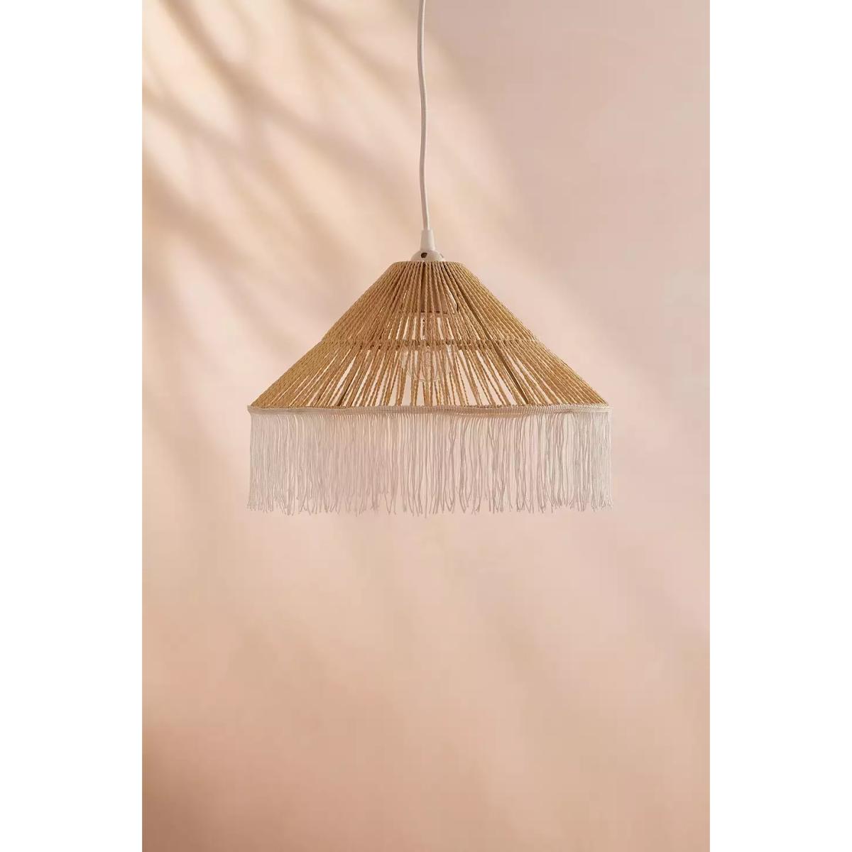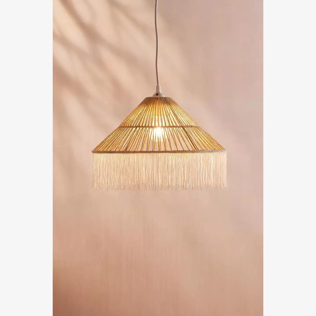 Decorate your space with a natural-finish rope and tassel trim lamp shade. Made for adding to any hanging light fixture, this lamp shade features a woven cotton rope design on an angled, round silhouette with loose hanging tassels. **Content + Care** \- Paper, Textile \- Wipe clean