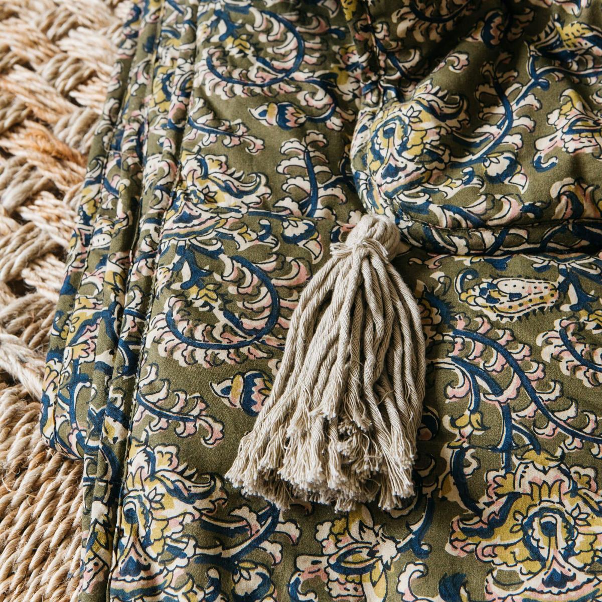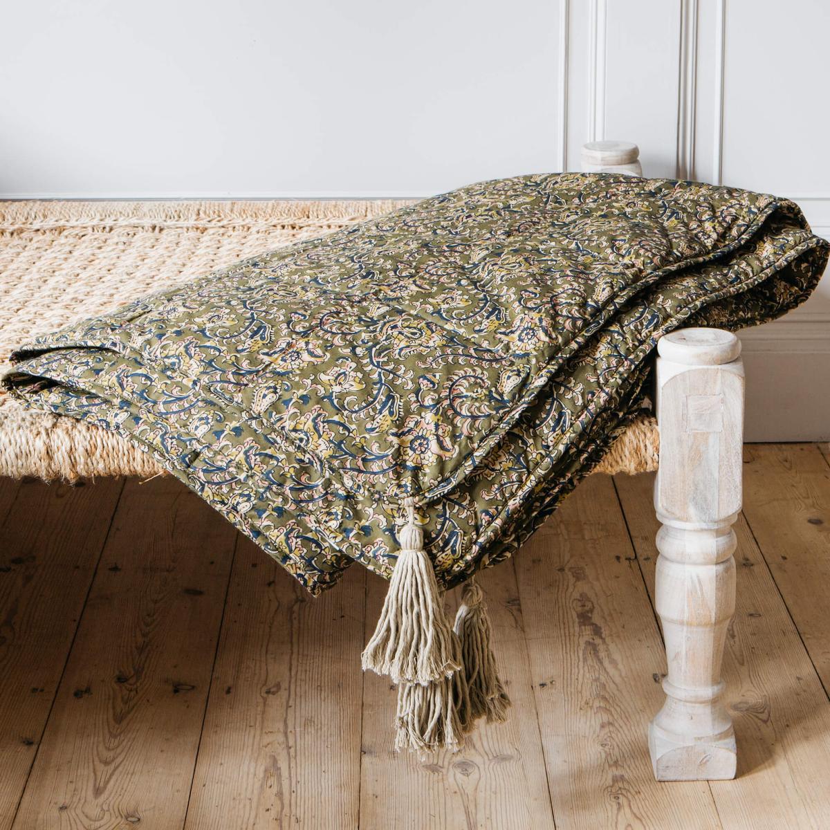 With an Art Nouveau flair, this sumptuous cotton quilt has a vintage floral print in olive green and mustard hues with matching tassels at each corner. Perfect for the cottagecore inspired home.