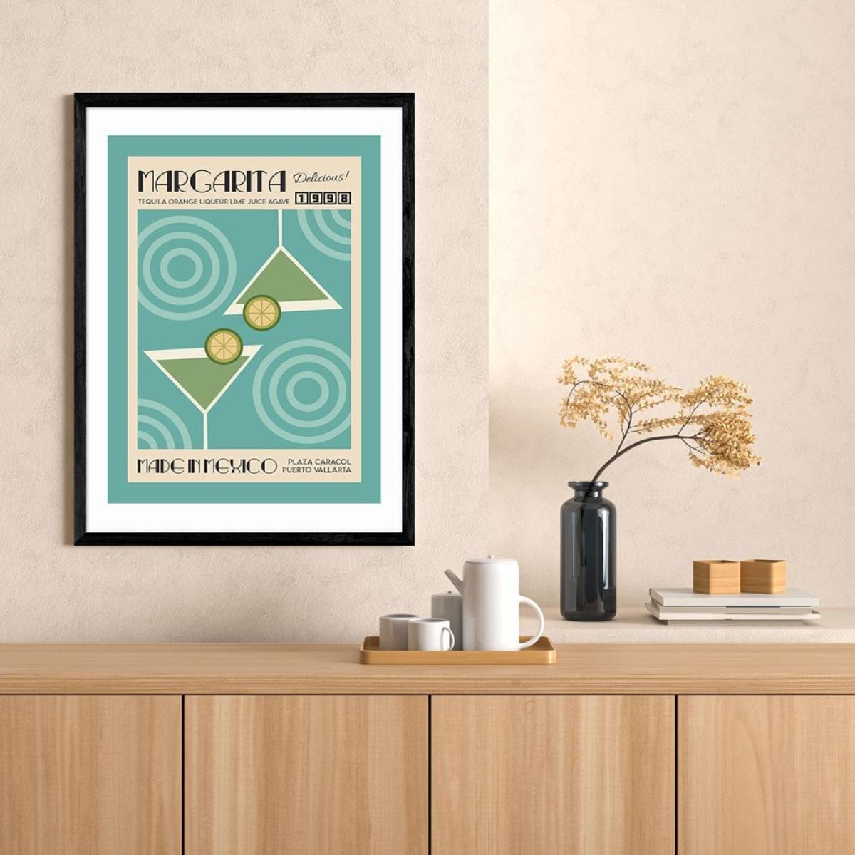 I love how this margarita print manages to be both playful and stylish with its graphic elements and bold black background. It works particularly well in modern or eclectic interiors, adding a pop of colour and a fun, conversational piece to a living room or entertainment area. When styling, consider pairing it with sleek, minimal furniture to let the artwork stand out, or group it with other graphic prints for a gallery wall approach. It's a great piece to elevate a casual bar area or to add a touch of humour to a kitchen corner, especially when framed thoughtfully to enhance its contemporary feel.