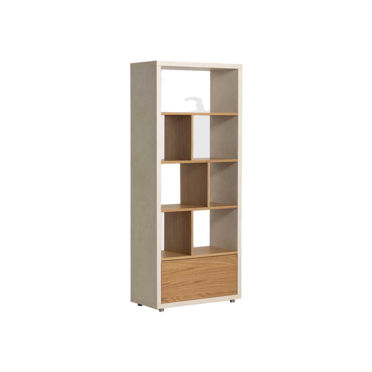 Elevate your living room with this exquisite bookcase with a drawer, blending beauty and utility. The natural oak veneer adds a warm, organic charm, while brushed stainless steel legs offer a modern, sophisticated touch. Enjoy seamless functionality with soft-closing mechanisms for tranquil and smooth operation. The melamine-finished interior ensures resilience and effortless maintenance. This bookcase is a timeless fusion of style and practicality, perfect for any home