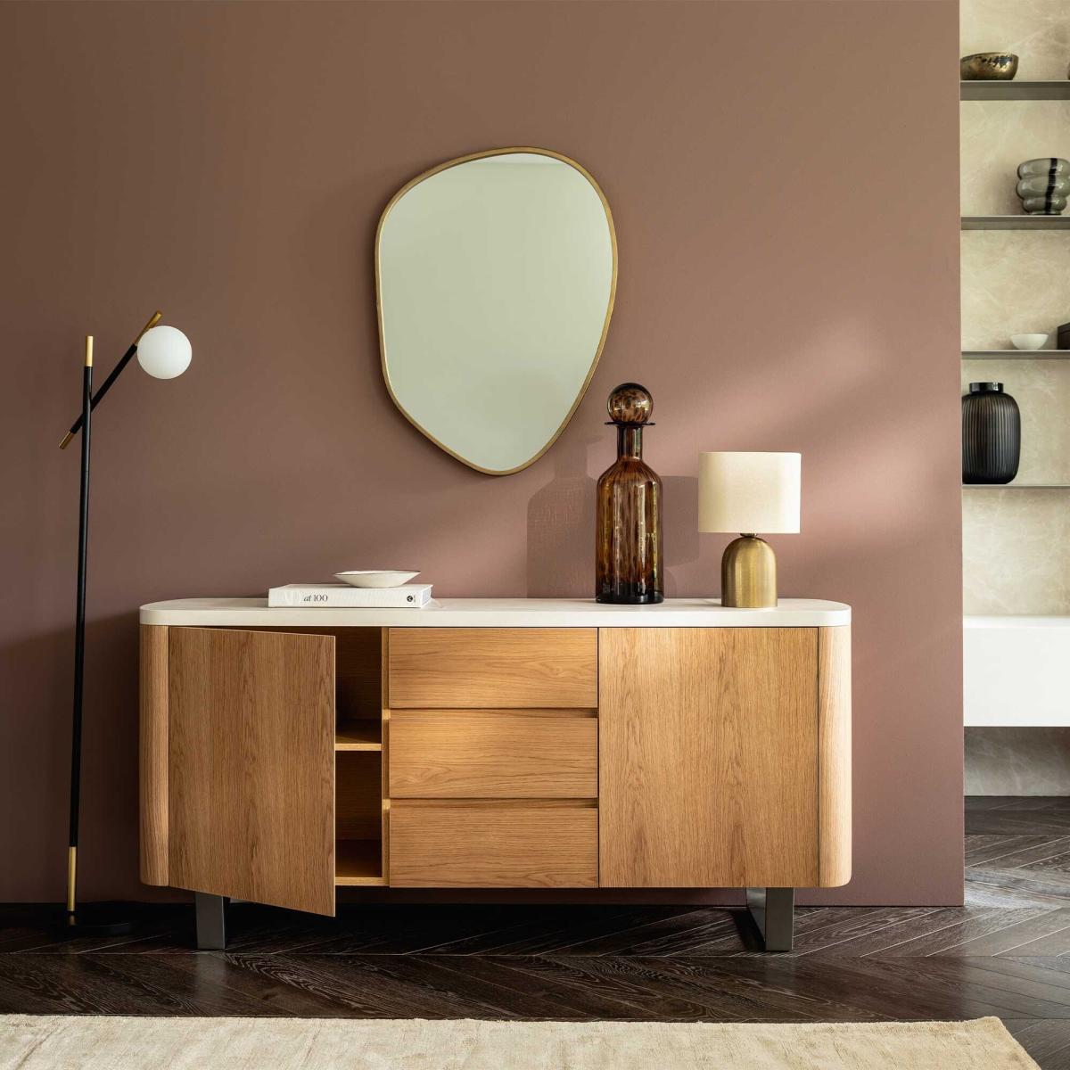 I’m a big fan of the Tate sideboard for its gentle curved edges and solid oak finish, which soften modern schemes without feeling fussy. It works equally well in a Scandi-inspired living room or a pared-back dining area, thanks to its versatile neutral tone and clean lines. To style it, keep the top simple - try a low stack of design books, a sculptural lamp on one side and a single art print hung just above - this balances the curves and highlights the piece’s shape. Inside, the mix of drawers and cupboards makes it easy to tuck away clutter, so your surface styling always feels fresh.