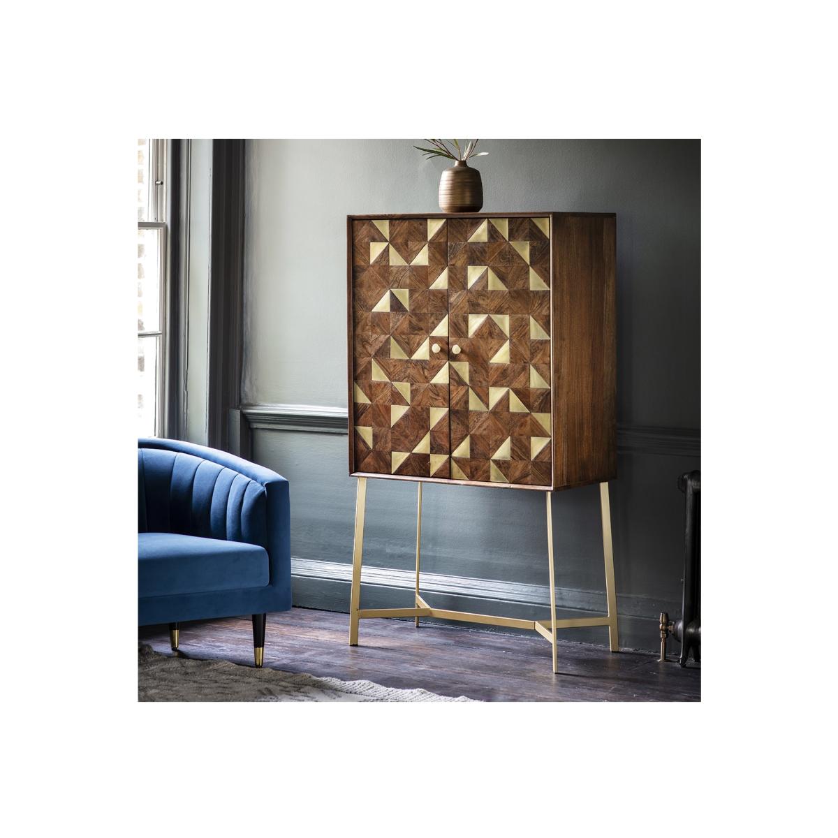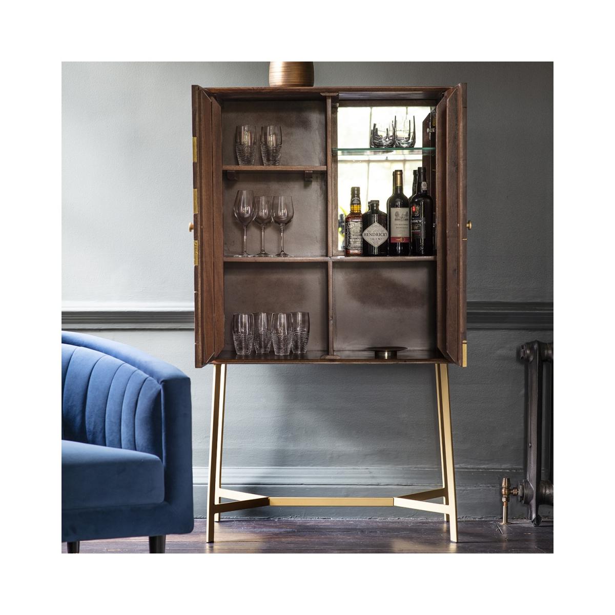 Dimensions W84 x H151 x D43 cm. This Cocktail cabinet will be a wow to any room and a great piece to impress your friends with your favourite tipple and glass stored inside the smart interior with glass back and glass shelves to complete the look - with inlaid wrapped brass and Acacia wood sections really lifts a room. Features. Solid Acacia finished in a warm brown finish. Stylish intricate brass inlay. Glass shelf and back to complete the look. Perfect for storing your favourite drinks and glasses. Brushed brass legs. No assembly required..