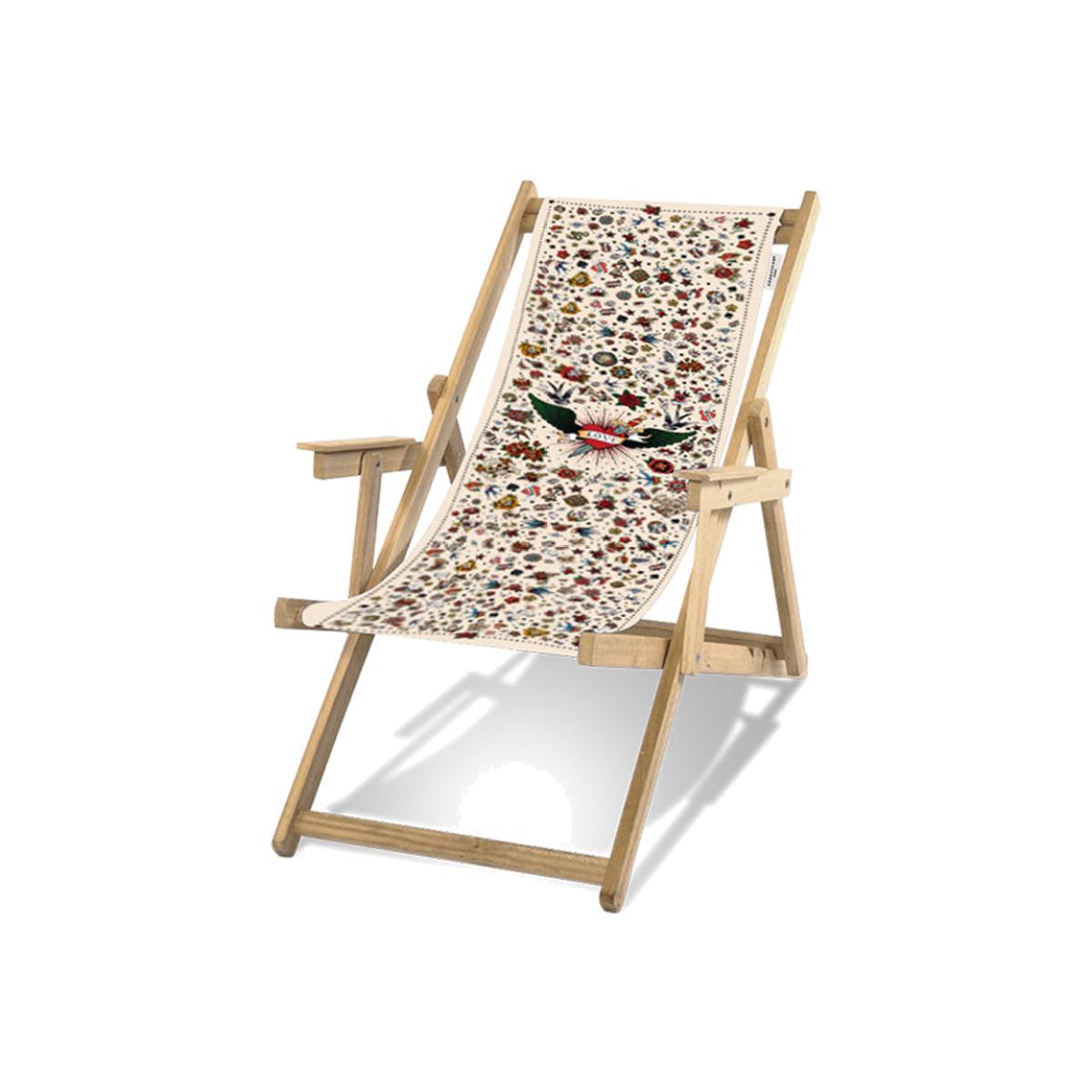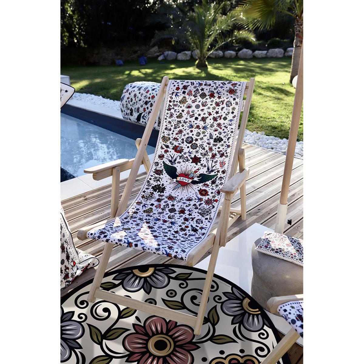 Designed and made in France with certified wood and available in a multitude of trendy prints, Pôdevache deckchairs have it all! The water-repellent, UV-resistant canvas is removable: it’s easy to machine-wash. The multi-position backrest adapts to what you’re doing (a nap or reading) and the deckchair folds up for easy storage. Affirm your personality even in your gardens and terraces with these deckchairs with their strong, offbeat visual identity. The Pôdevache brand is committed to keeping its production in France in its workshops located in Valence in the Drôme region. Each motif is designed in its Valence studio. Give in to the temptation of a relaxing break with the Tattoo deckchair. Retro and rock, the colourful, symbolic patterns are inspired by vintage tattoos. The fun, abundant patterns stir our imagination. You’ll love the punchy, relaxed style of this deckchair, which will become a centrepiece of your decor. PLEASE NOTE: Never fold up and store the deckchair with a damp canvas. Like all wooden furniture, this deckchair requires regular care to maintain its beautiful appearance.