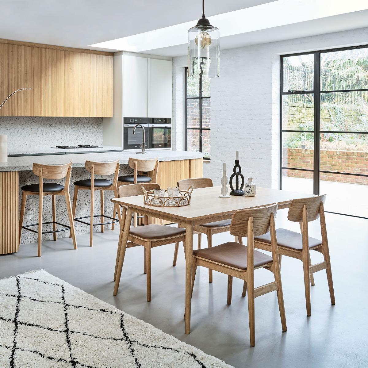 I love how the Tatum chair’s simple oak frame and black seat cushion balance warmth with modern restraint. Its clean lines and subtle curves make it a natural fit for Scandi-inspired, Japandi or minimalist interiors, and it sits just as comfortably in a pared-back industrial or farmhouse setting. For styling, pair a set around an oak or black-metal table and layer in natural textures - think linen placemats, a jute rug or a woollen runner - to give the space depth. You can also mix in a complementary seat pad or lightweight throw over the back for extra comfort and a hint of pattern.