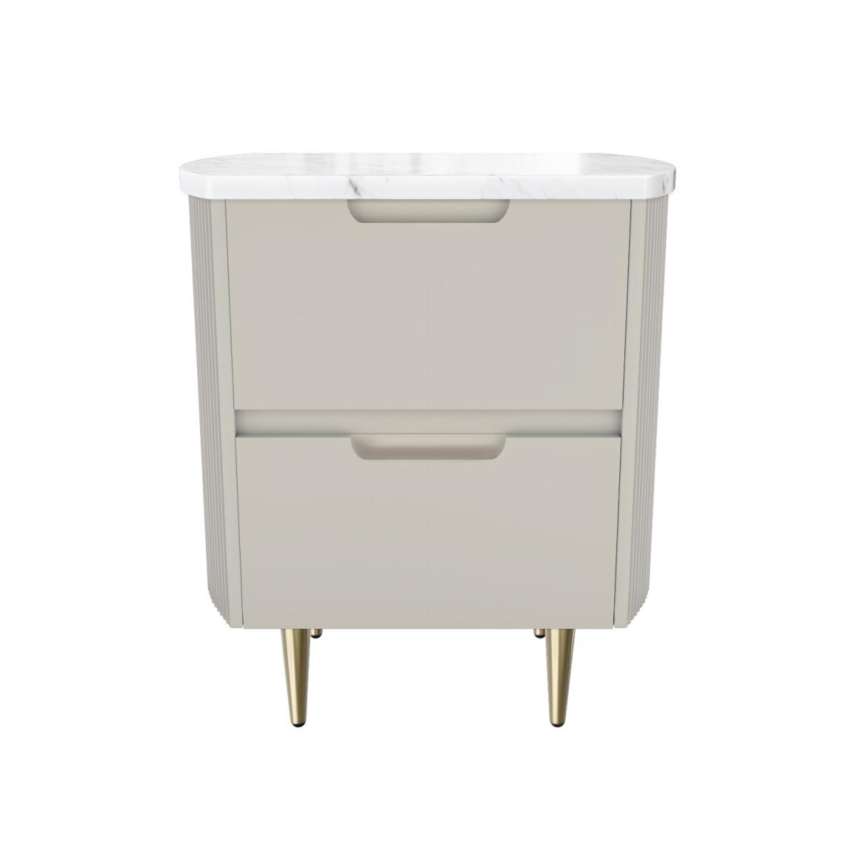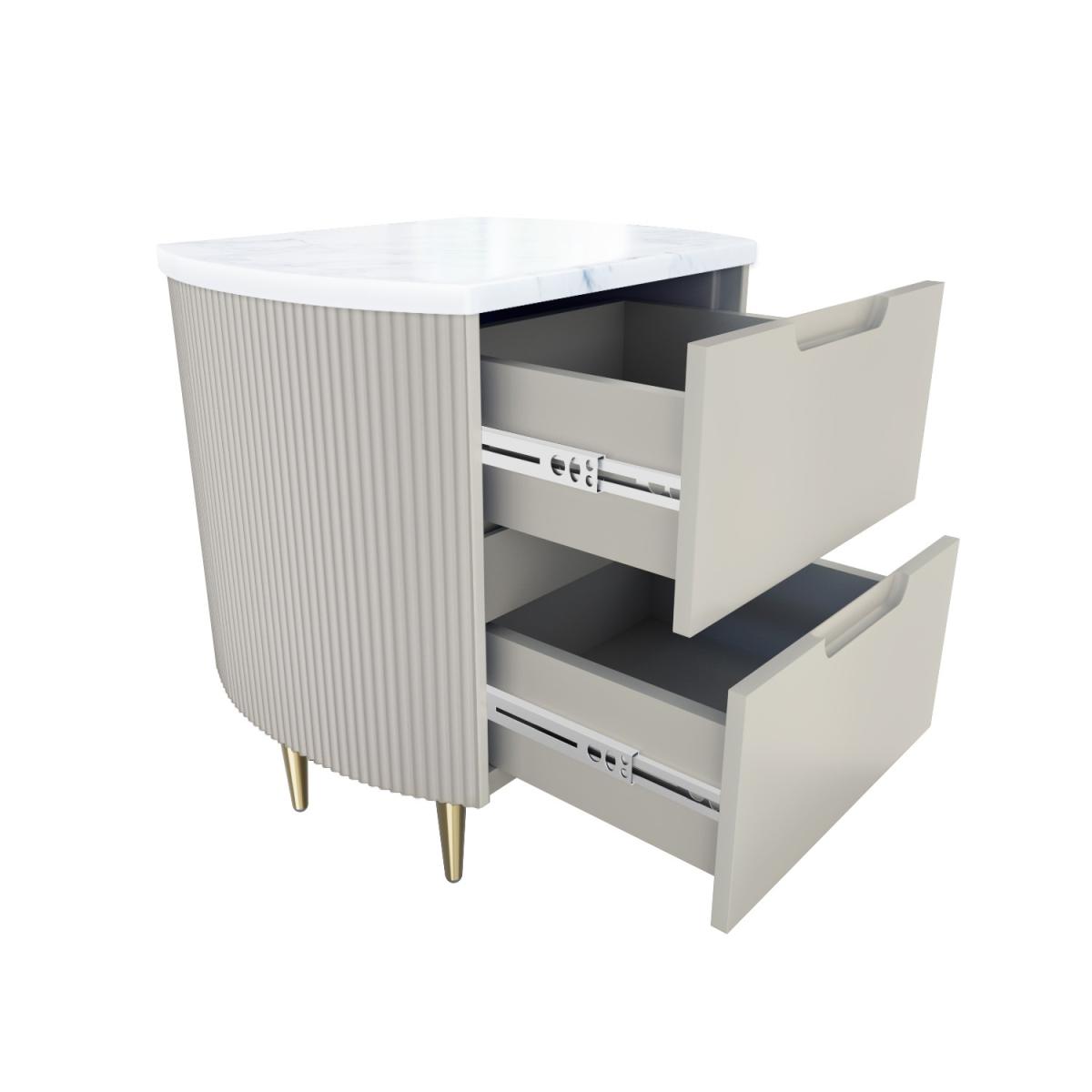 Adding a touch of glamour to your space, this contemporary bedside table suits any bedroom style. The curved and intricately ridged side panels create a softer appearance and help this bedside cabinet fit into any space. Featuring two spacious drawers, you've got plenty of storage space to help keep your essentials in easy reach. Its large marble effect top creates a sense of grandeur while four brushed metal legs gracefully lift this chest from the floor.