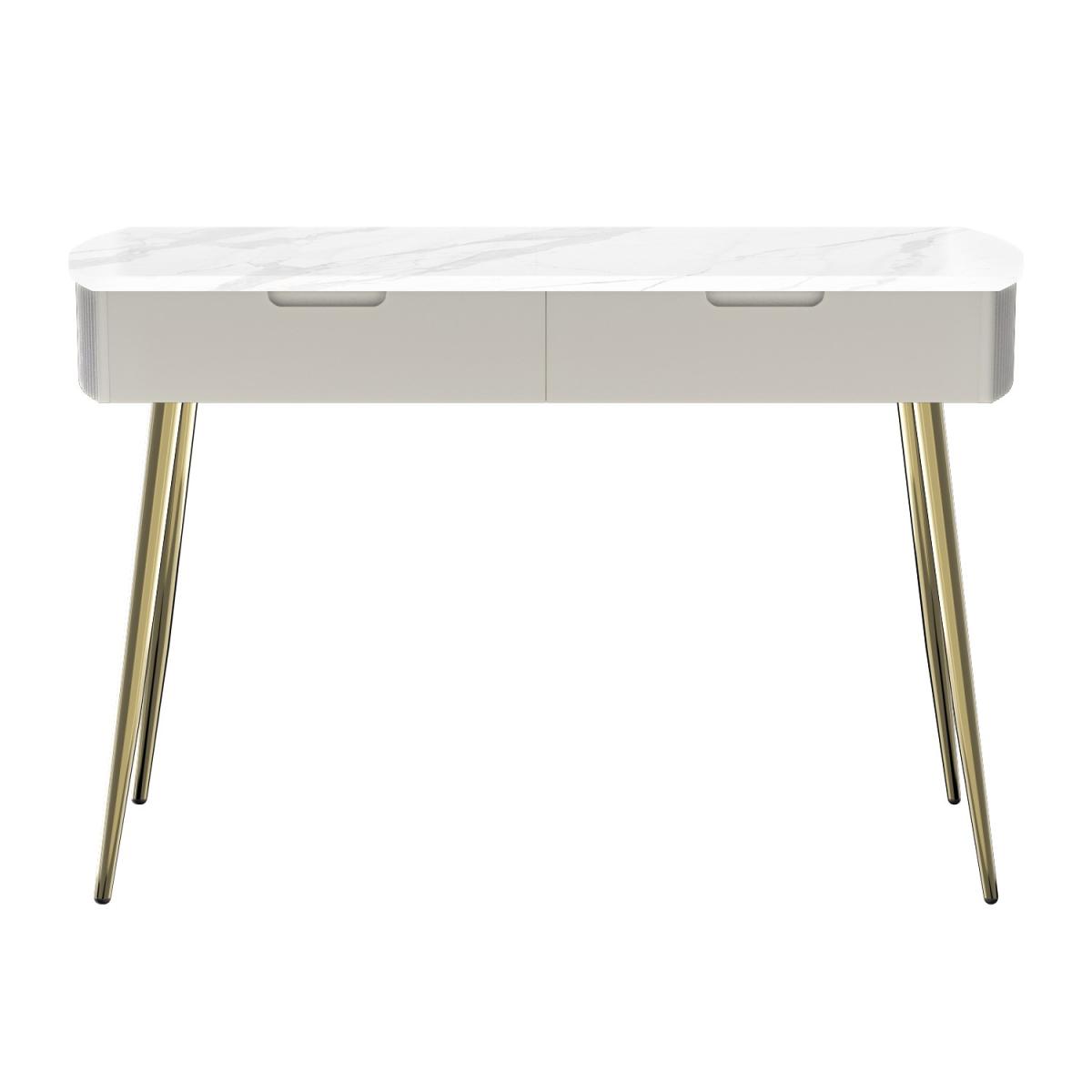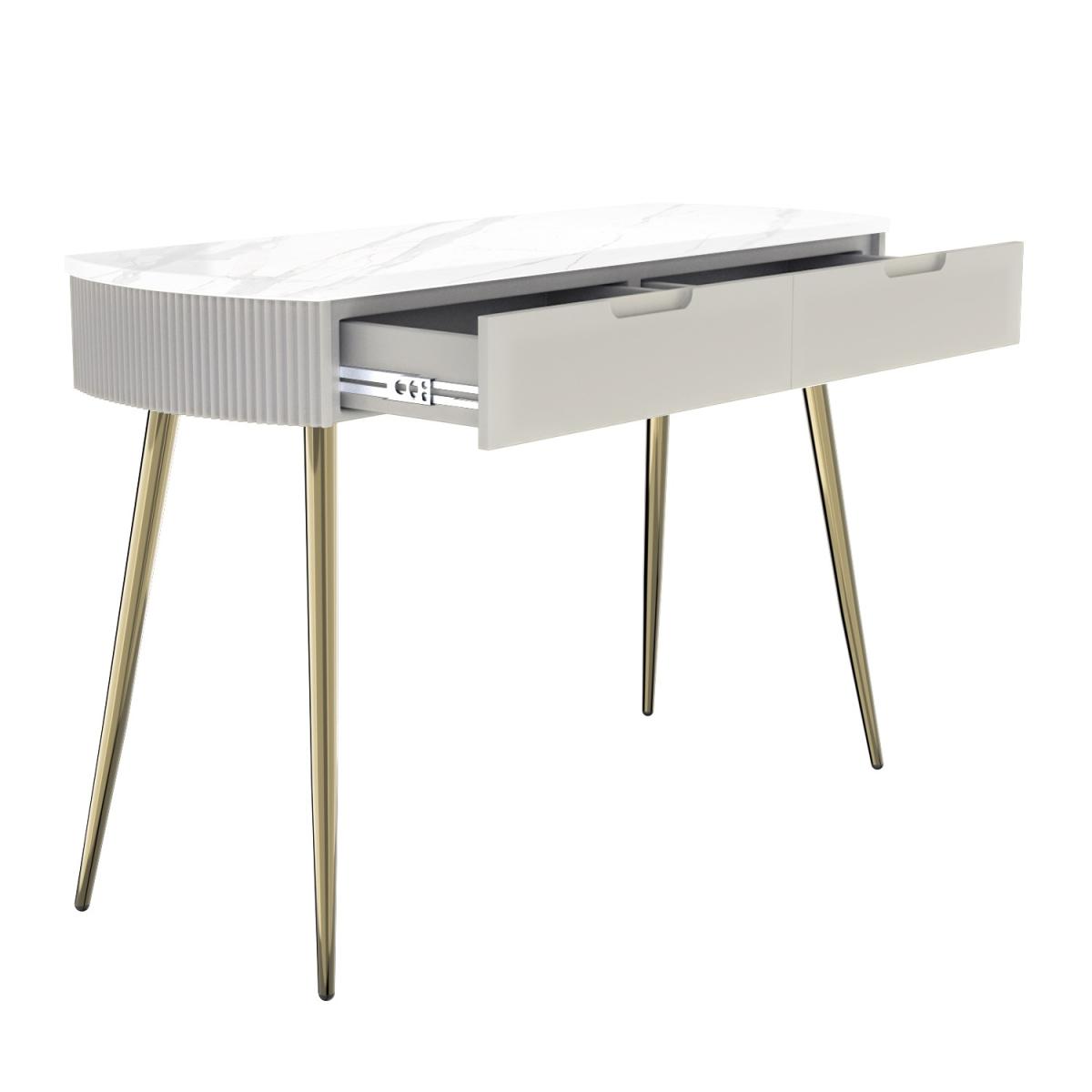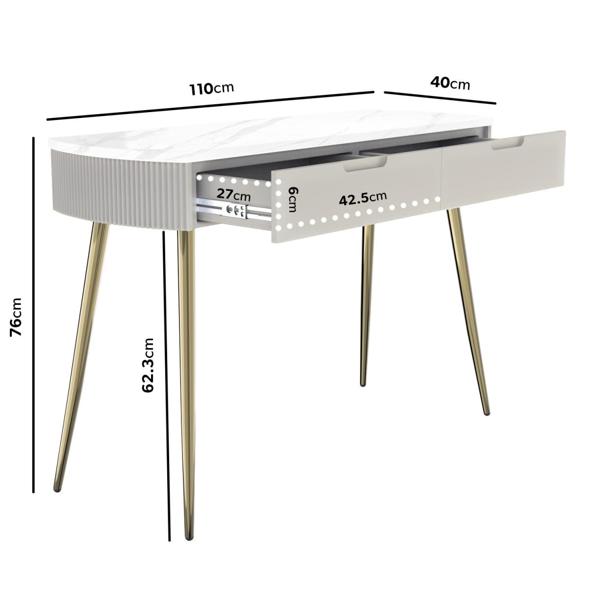 Get ready in style with this stunning art deco inspired dressing table. Complete with two spacious storage drawers, there's plenty of room to keep your essentials tucked away, yet in easy reach. Curved sides with ridged detailing soften the look of this table while its spacious marble effect top offers practicality. Whether you add a mirror for the perfect space to get ready, or use for the ideal working from home set up, this table suits any home and decor.